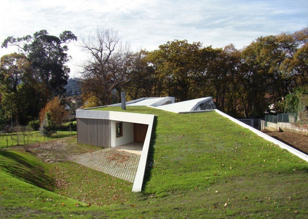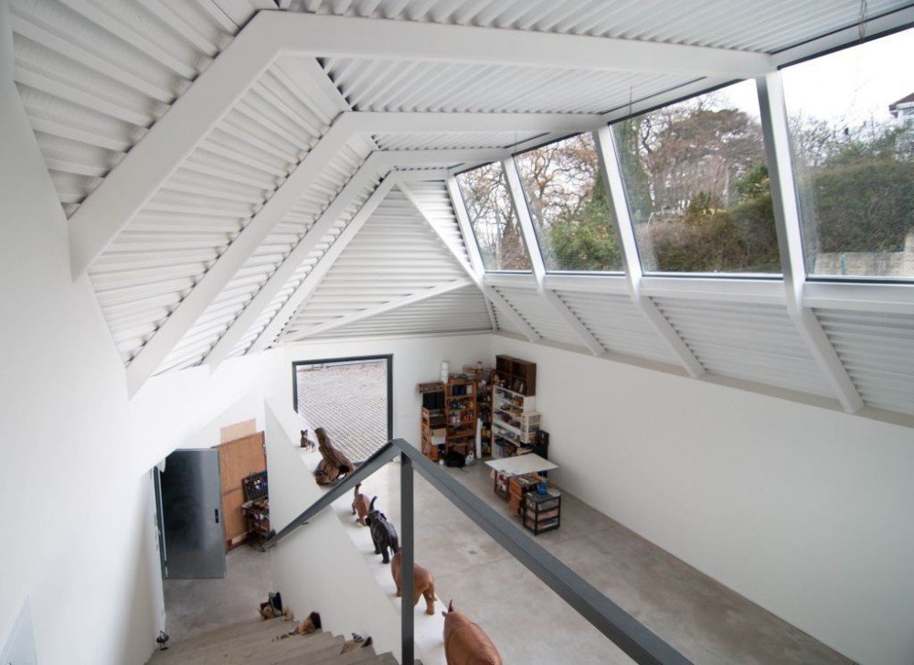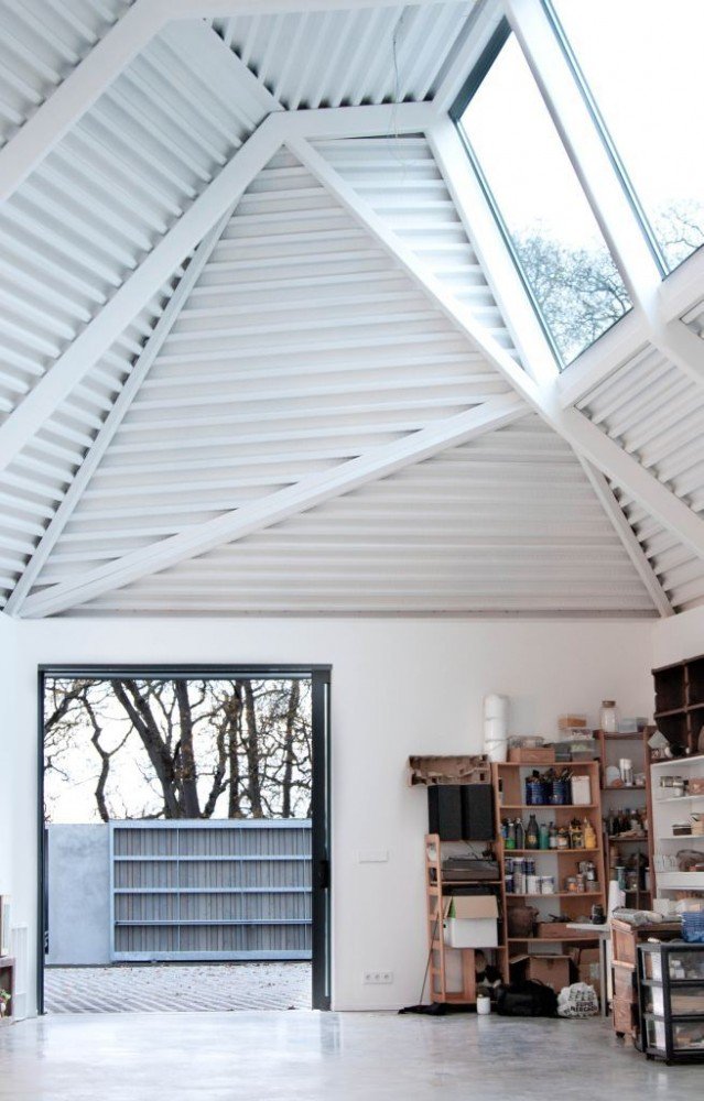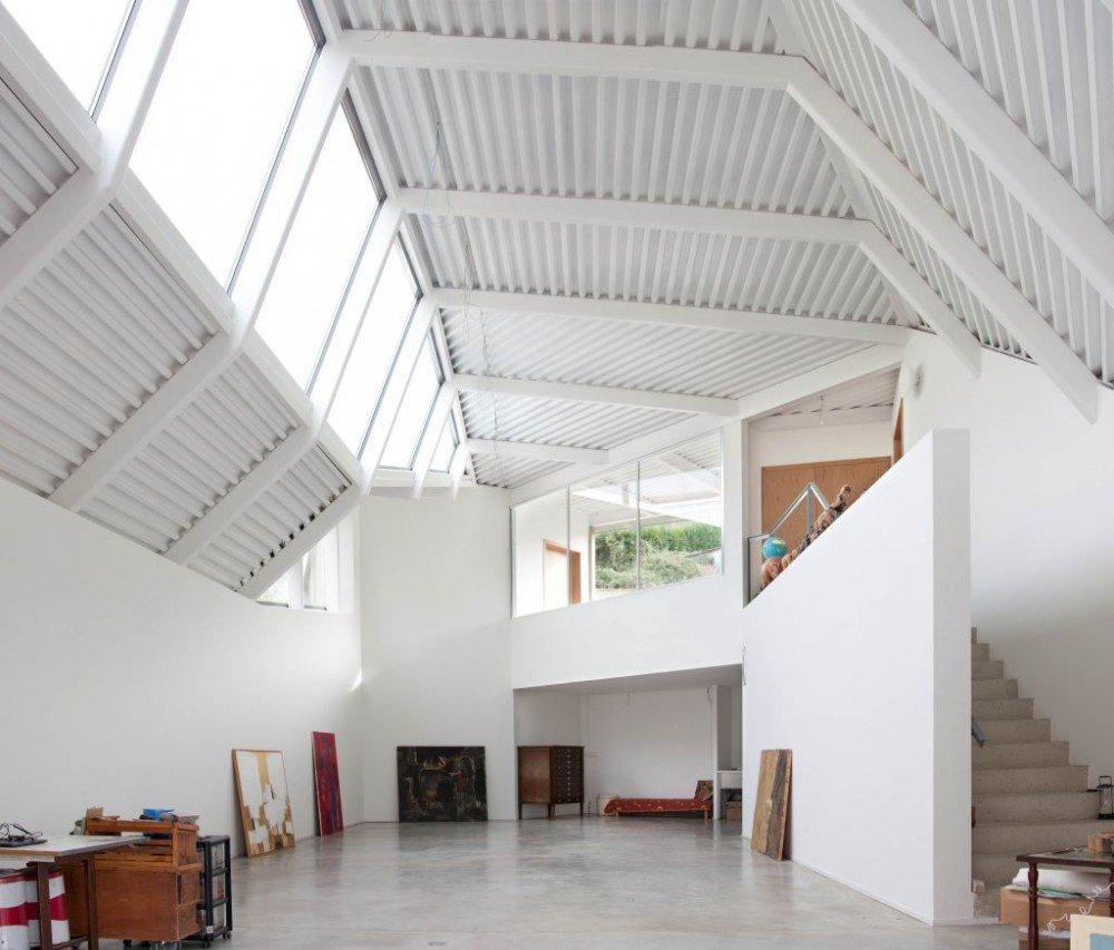 The nature, the constructed, and the industrial meet at crossroads in Lara Rios House & Atelier designed by F451 Arquitectura. The residence in Gijón, Spain, combines the three elements in its four spatial forms for house, guest apartment, garage, and atelier. The industrial influence is evident through the exposed metal corrugated plate on the home’s interior, which is a sharp contrast to the gentle slope that brings the surrounding landscape onto the roof of the units. Faceted ceilings help arrange the rooms, which are decorated with wooden accents against the white walls.  Strategic glazing and the roofed courtyard help blend the boundaries between inside and outside, and positions the constructed form as a mediator between the two environments.