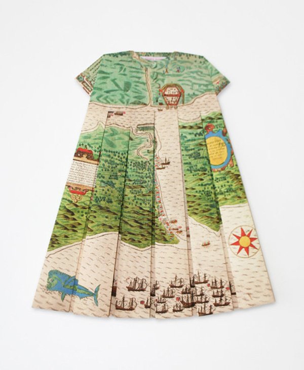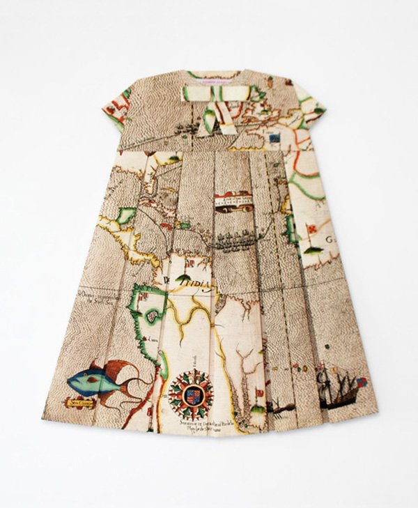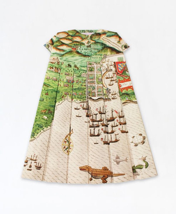 Elisabeth Lecourt of London takes us on a airship ride above the continents in her Les Robes Geographique collection.  Sweetheart sundresses printed with maps of places from around the globe hurry us to an adventure just down the bend from imagination.  Thoughtful imagery drawn over the roads and landmarks captures the culture of the people in their play, work, and mystery.  The lens zooms into cities we romanticize over like New York, London, Jerusalem, Ireland; navigating through history on voyages from Sir Francis Drake, the first days of the American Railroad, or a world map circa 1565.  The round tip collars and neck tie ribbon, remind us of traditional tea parties and school house days.  A limited number are available in tailored shirt style.  Made especially for travelers and dreamers alike.