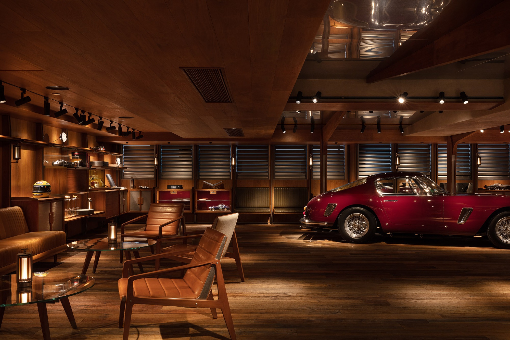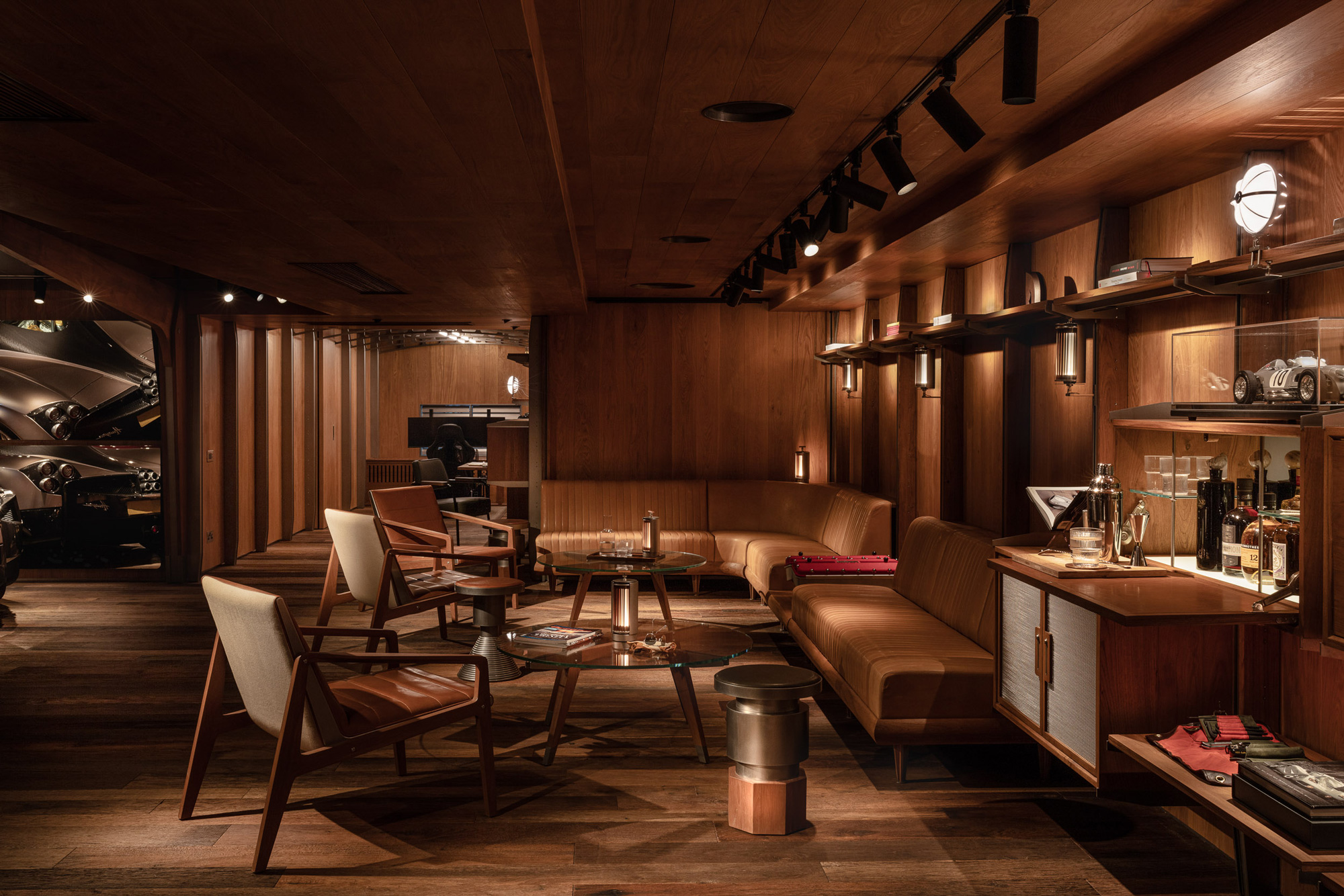 Referencing the cars’ mechanical ingenuity, the interior also features modular elements that allow the client to adjust the space. Details that give a nod to renowned cars include the lounge chairs, which celebrate the Ferrari Dino, and the cabinetry handles that remind of the door handles of a Zagato. In the lounge area, there’s an elegant bar. Finally, The Library also houses a more private workspace with a desk and a bathroom. Photography© Dennis Lo.