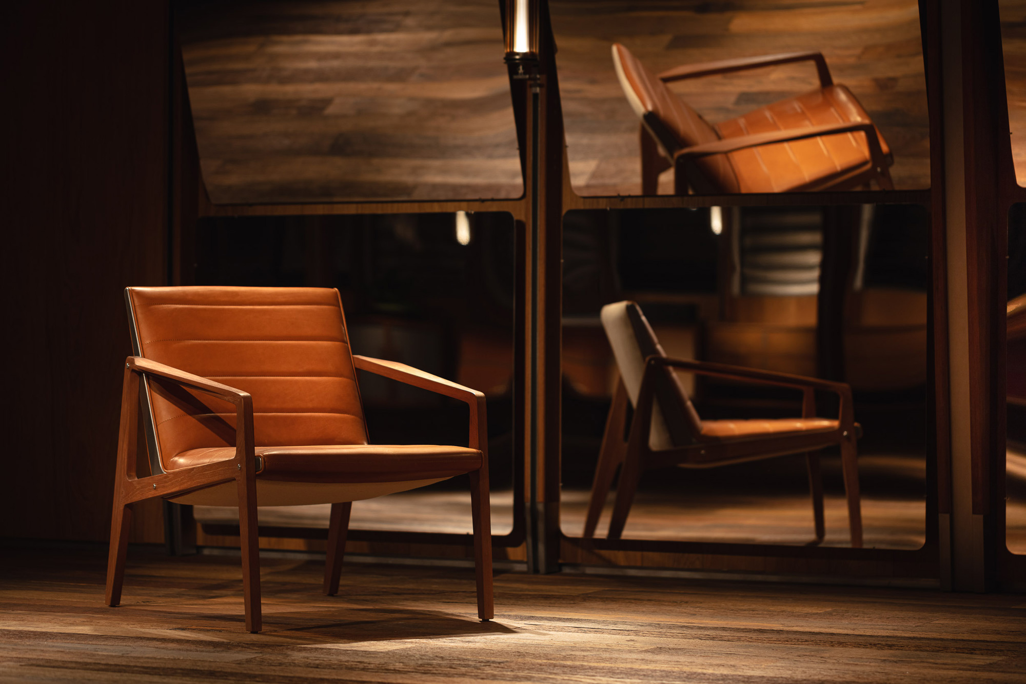 Stepping out of the elevators, visitors discover a sleek space with polished stainless steel surfaces that reflect shapes and light in a visual spectacle. In this room, the studio used concrete flooring as well as matte steel finishes. A timber-clad volume curves around the wall and houses a series of curved leather sofas in a stylish lounge space. In the other area of The Library, the studio used wood almost exclusively for the floors, walls, ceilings, and furniture. Leather chairs, armchairs and sofas paired with elegant lighting complete the design. Consequently, this area is full of warmth.