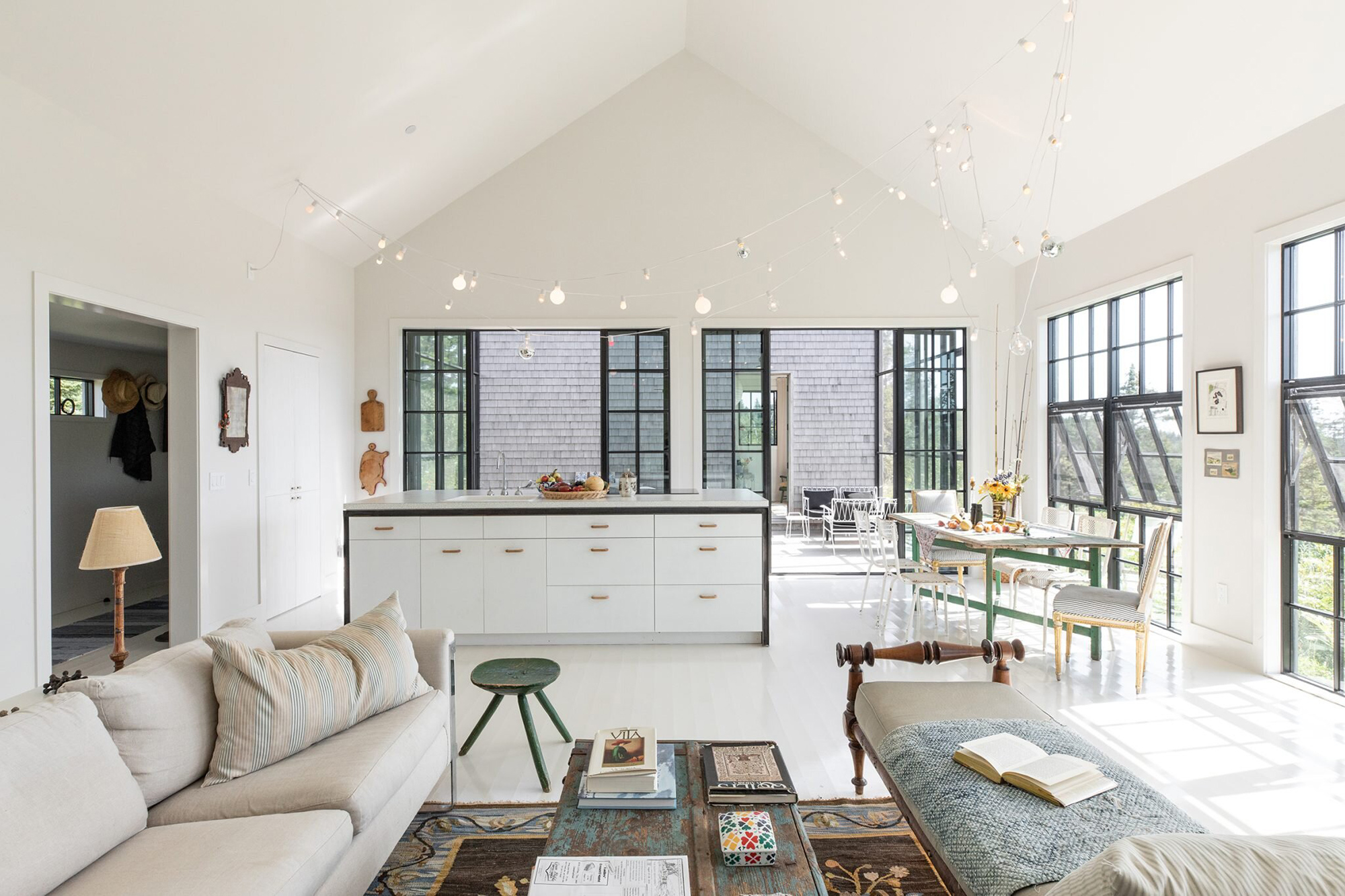 The larger wing contains the main living spaces, while the smaller cottage houses guest rooms. Both of them feature timber cladding. The bespoke screened porch connects these zones and also creates a sheltered and shared space that opens to nature. To let the landscape take center stage, the studio used a white finish for the walls, floors, and ceilings. Thus, the colors of the huckleberry, bay, stone, and lichen stand out as one gazes through the large industrial windows. Blending Shaker design cues with American and French antiques and textiles, the architects created a refined and eclectic interior with a character that complements the beauty of the surrounding nature. Photographs © Greta Rybus.