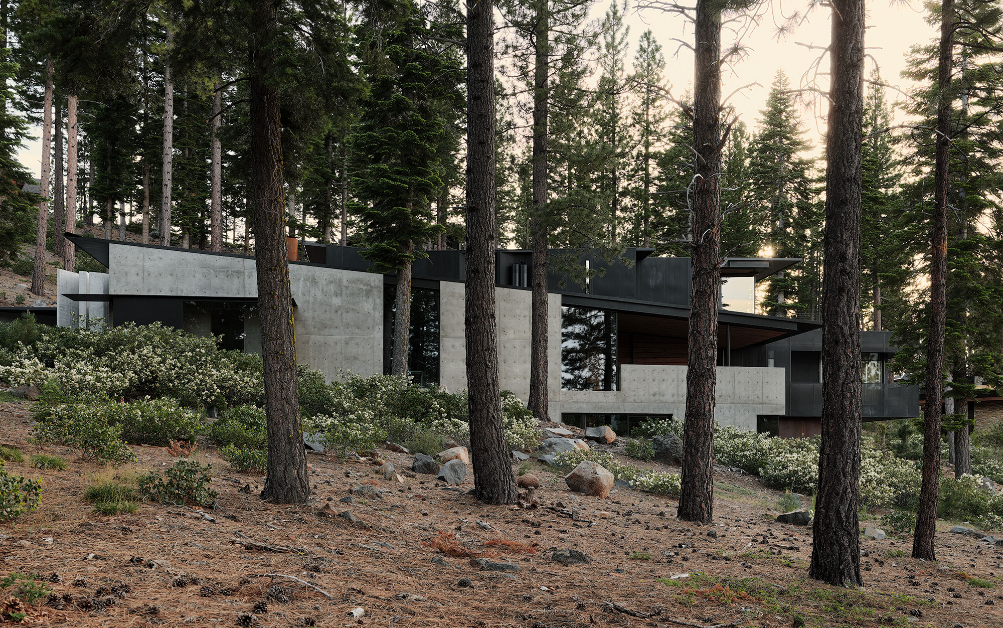 A concrete and steel house nestled among pine and fir trees on a ski hill in California.