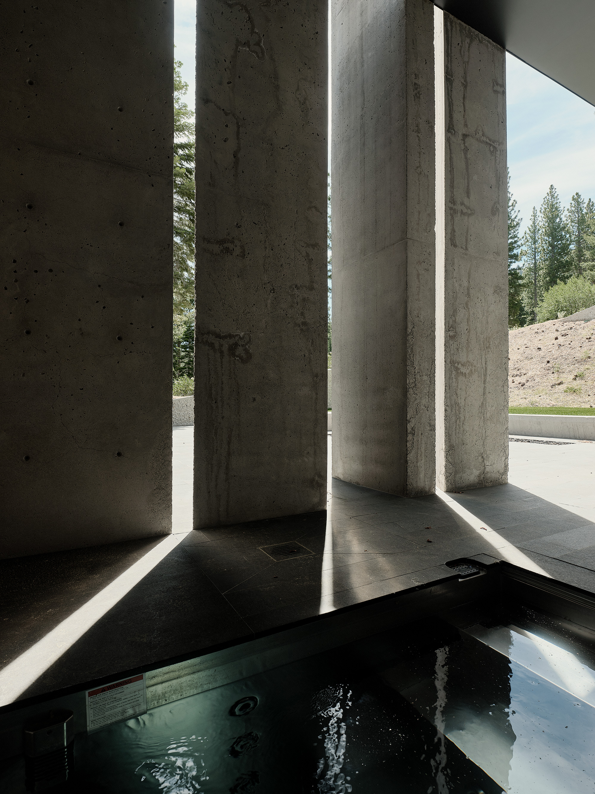 Located on a sloped site in Truckee, California, the contemporary and refined Lookout House makes a gorgeous landscape its natural home. The Faulkner Architects-designed dwelling rises from among fir and pine trees, at the base of a three-million-year-old volcano. Large boulders, volcanic sediment, manzanita shrubs, and tall trees surround the vacation house. Influenced by the setting, the structure features simple geometric forms made of concrete and black steel. Nestled into the site, the house also has a special relationship to its surroundings. It welcomes the landscape inside the living spaces, with windows offering uninterrupted views of seasonal changes.