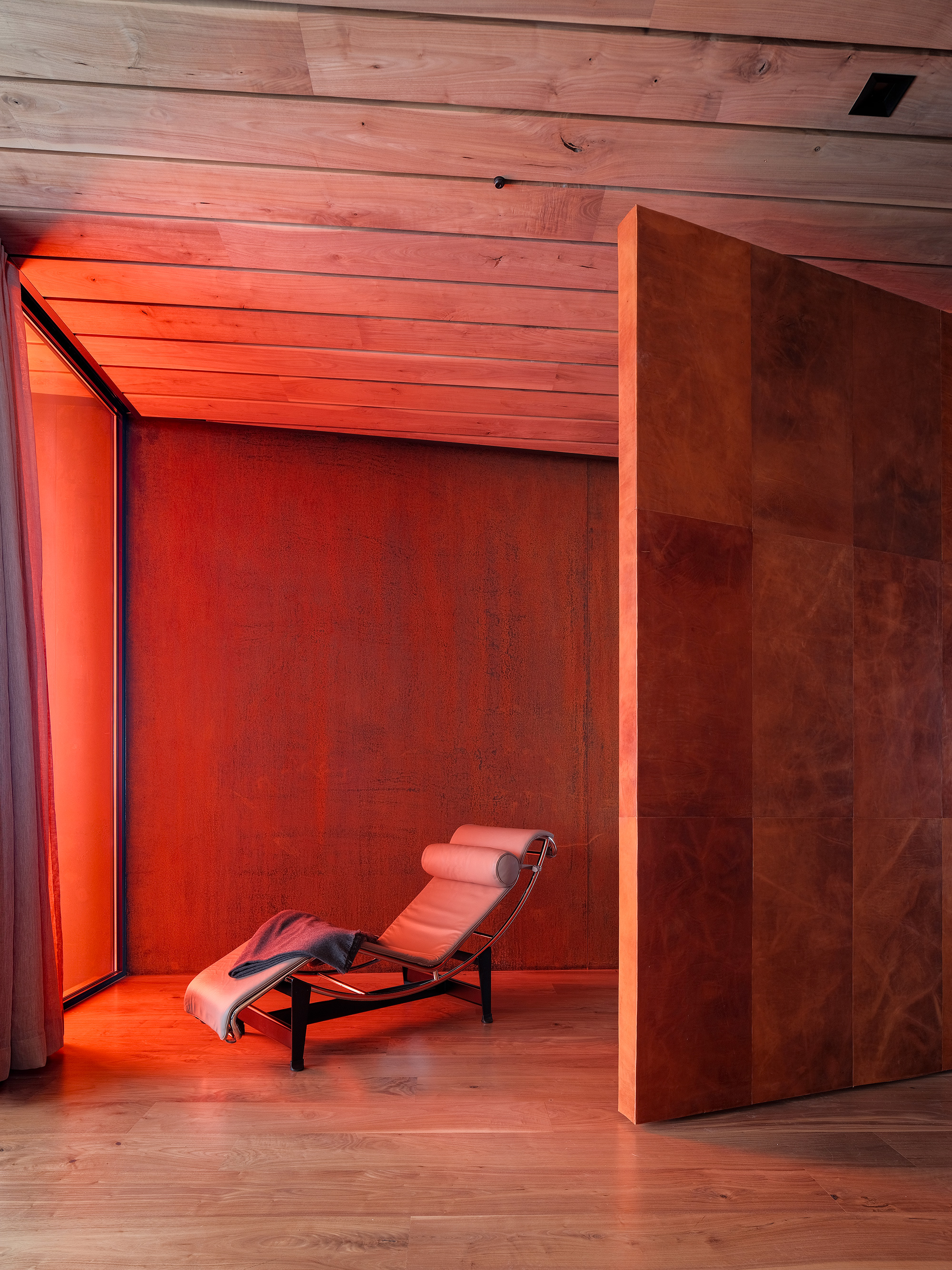 Made with local sand, the insulated, 20-inch-thick concrete walls extend from the interior to the slope to provide easy access to skiers. They also create outdoor spaces at both ends of the house. Covered by earth, the entry level features a garage and a craft room as well as a ski locker and playroom. The main social space that houses the living room and kitchen reminds of a cozy ski cabin. A California walnut screen shields the bedroom area. Red-orange glass reminiscent of magma brings a warm accent to the interior while also linking the space to its setting by referencing the site’s geology.