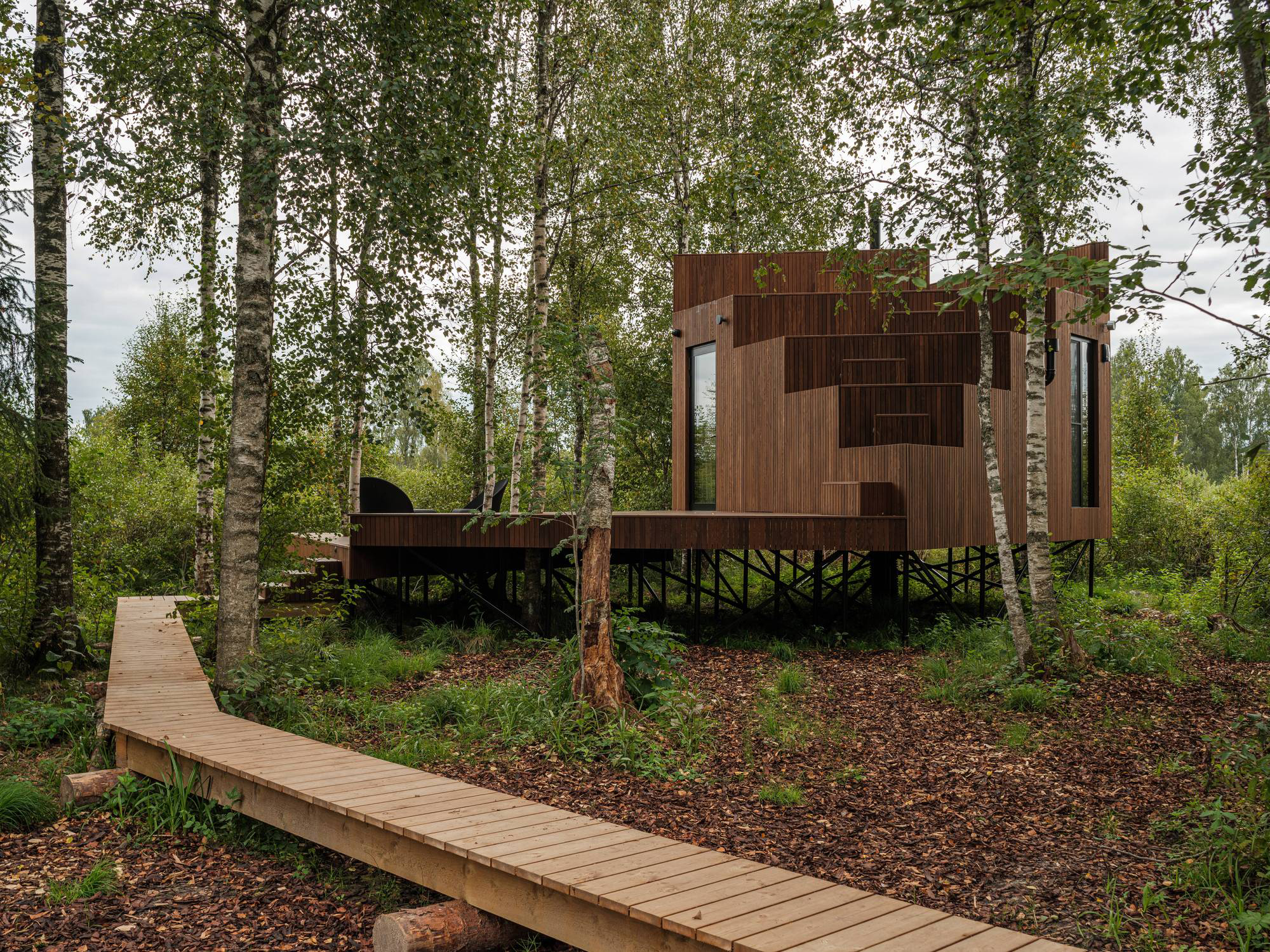 Part of the Maidla Nature Resort in Estonia, this tree house cabin provides the perfect solution to unwind in the middle of a lush natural landscape. Named Maidla Nature Villa, the structure stands among birch trees, on the property of a historical manor located only 45 minutes away from Tallinn. b210 architects designed the structure to nestle into the wetland setting naturally. The studio also completed the interiors and the furniture design. Inspired by the site, the structure features a dark wood exterior. The architects elevated the cabin above ground and built it around the existing trees.