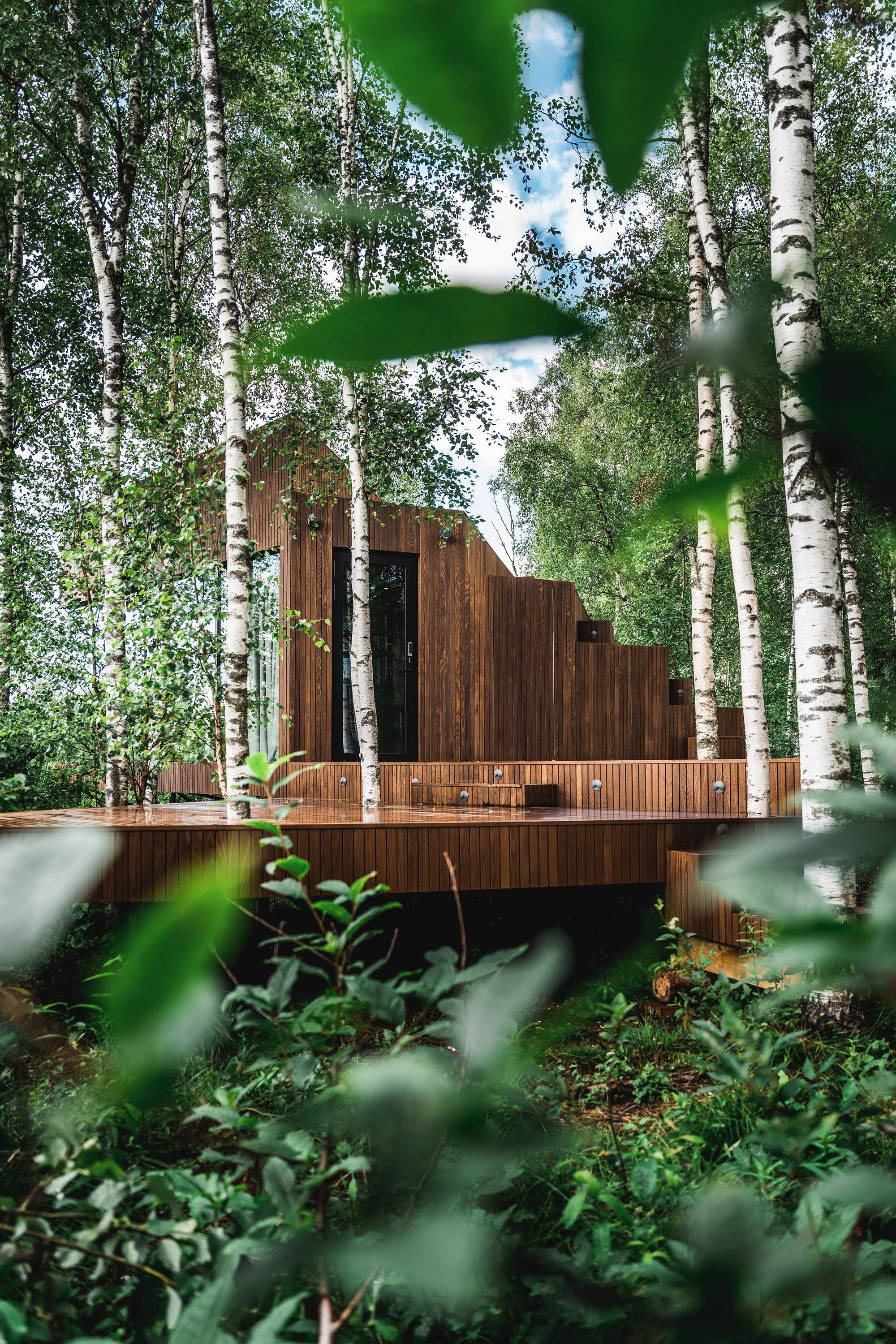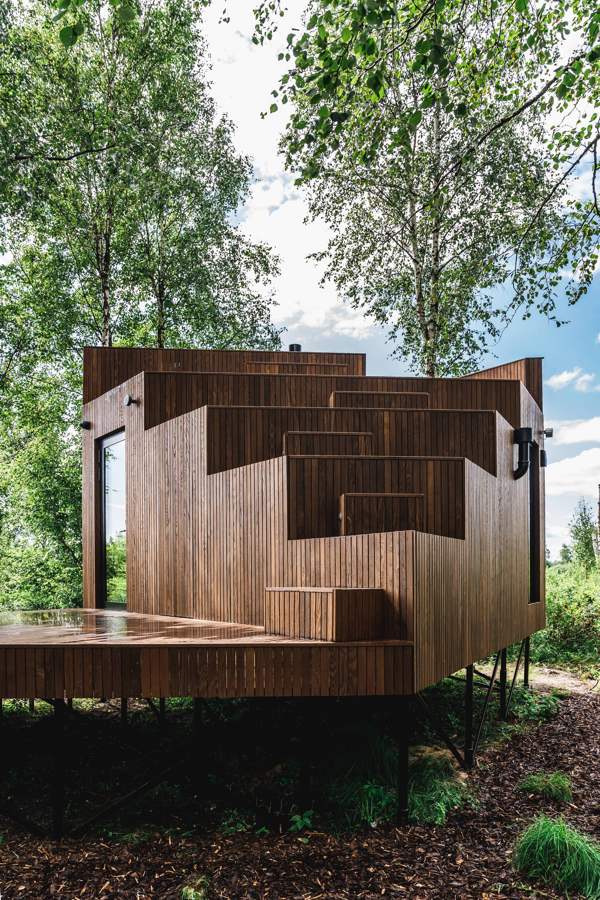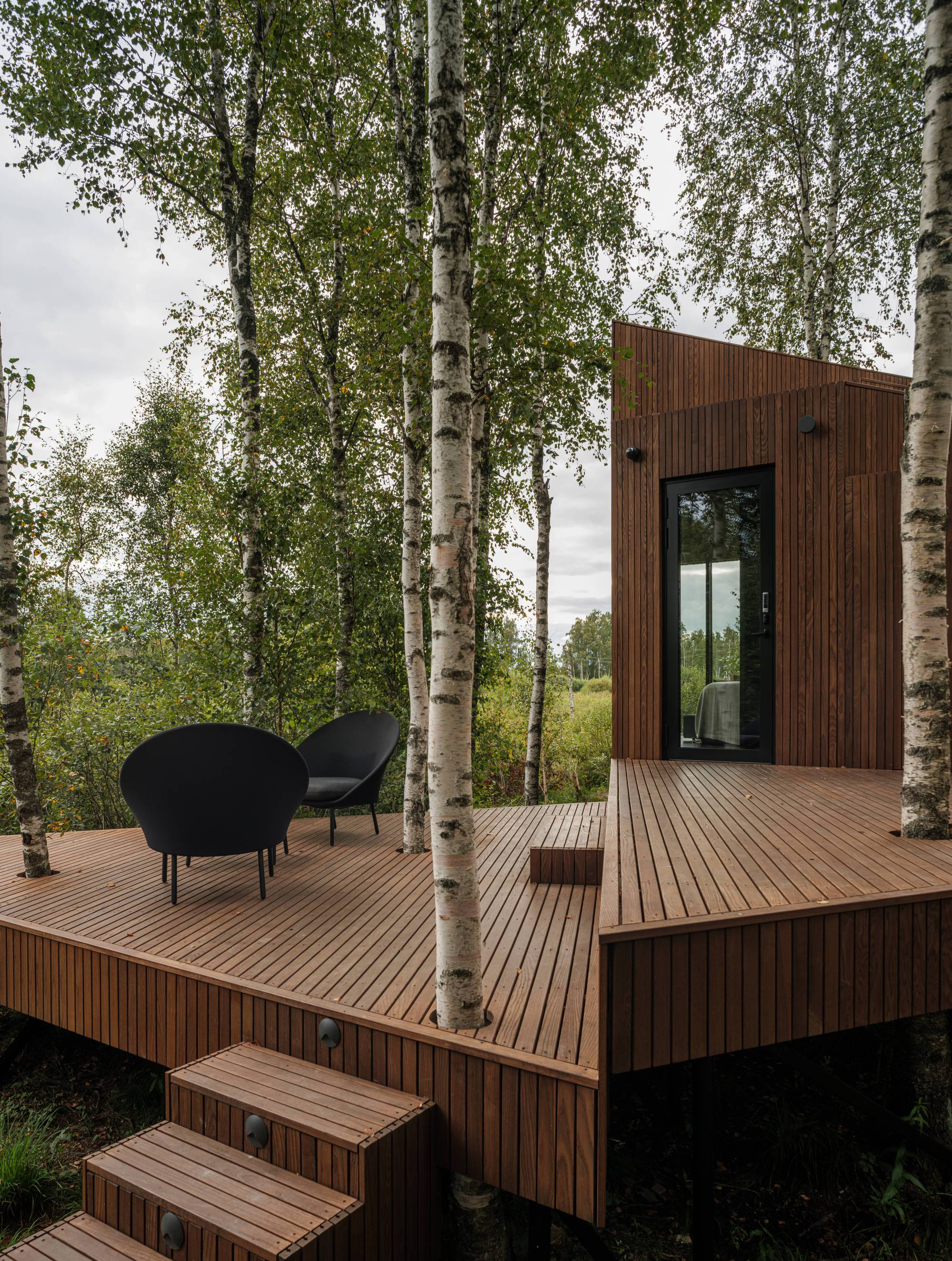 Guests can access the room through a suspended walkway that provides safe passage even during flooding in spring. Terraces on different levels surround the cabin, offering plenty of spaces to relax outdoors, watch the birds, admire the setting, or gaze at the stars at night. The compact building has an irregular form as it follows the shape of the plot and the location of the existing birch trees. Thanks to the secluded position, the studio could design generous glazing for the triangular bedroom. As a result, guests feel immersed into nature at all times.