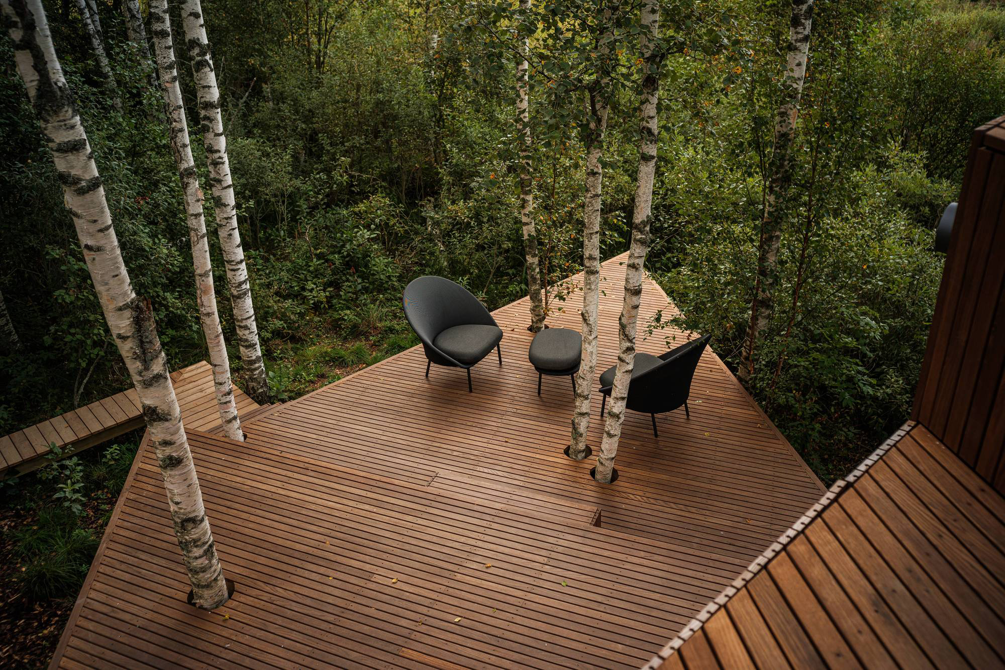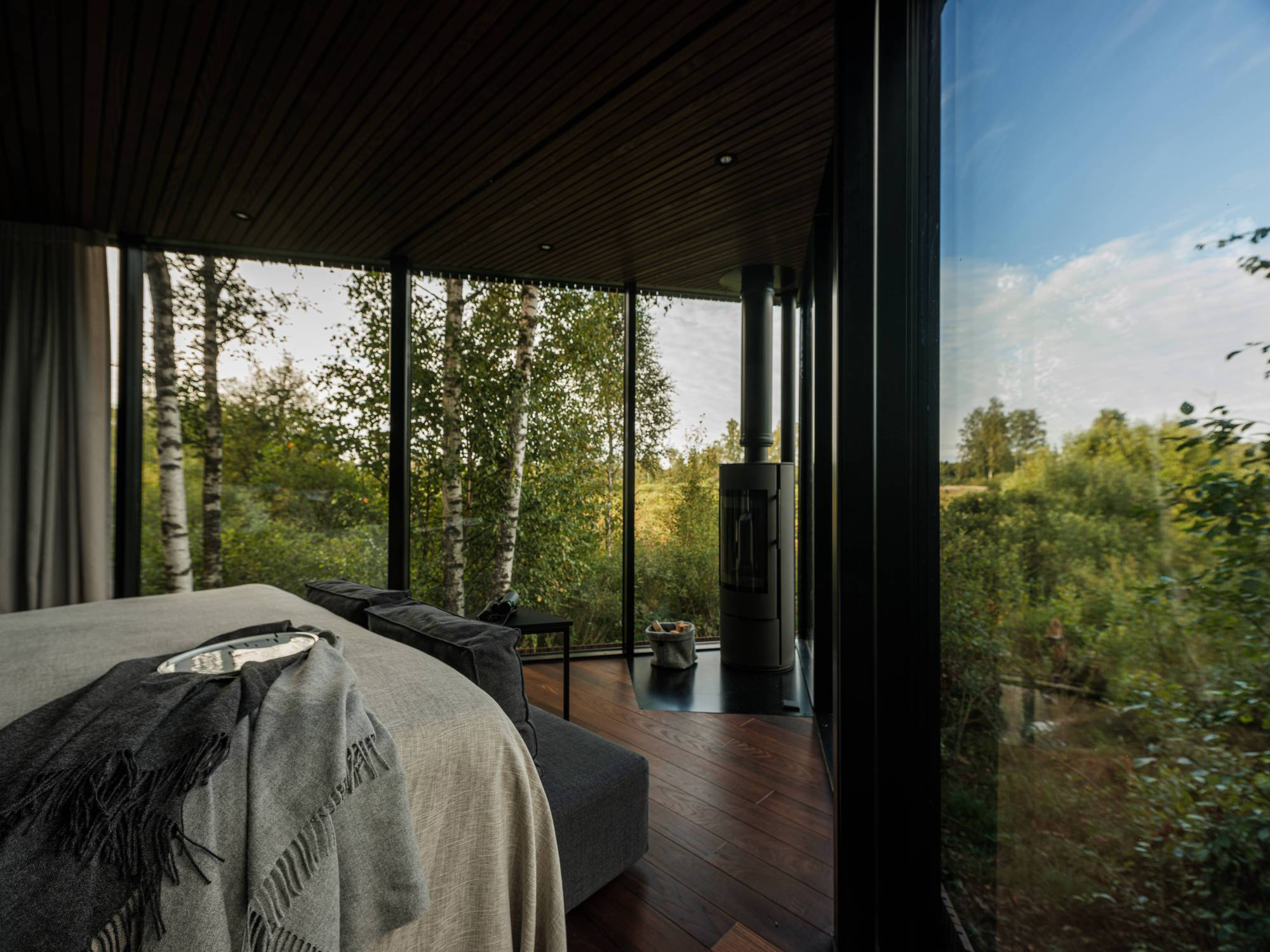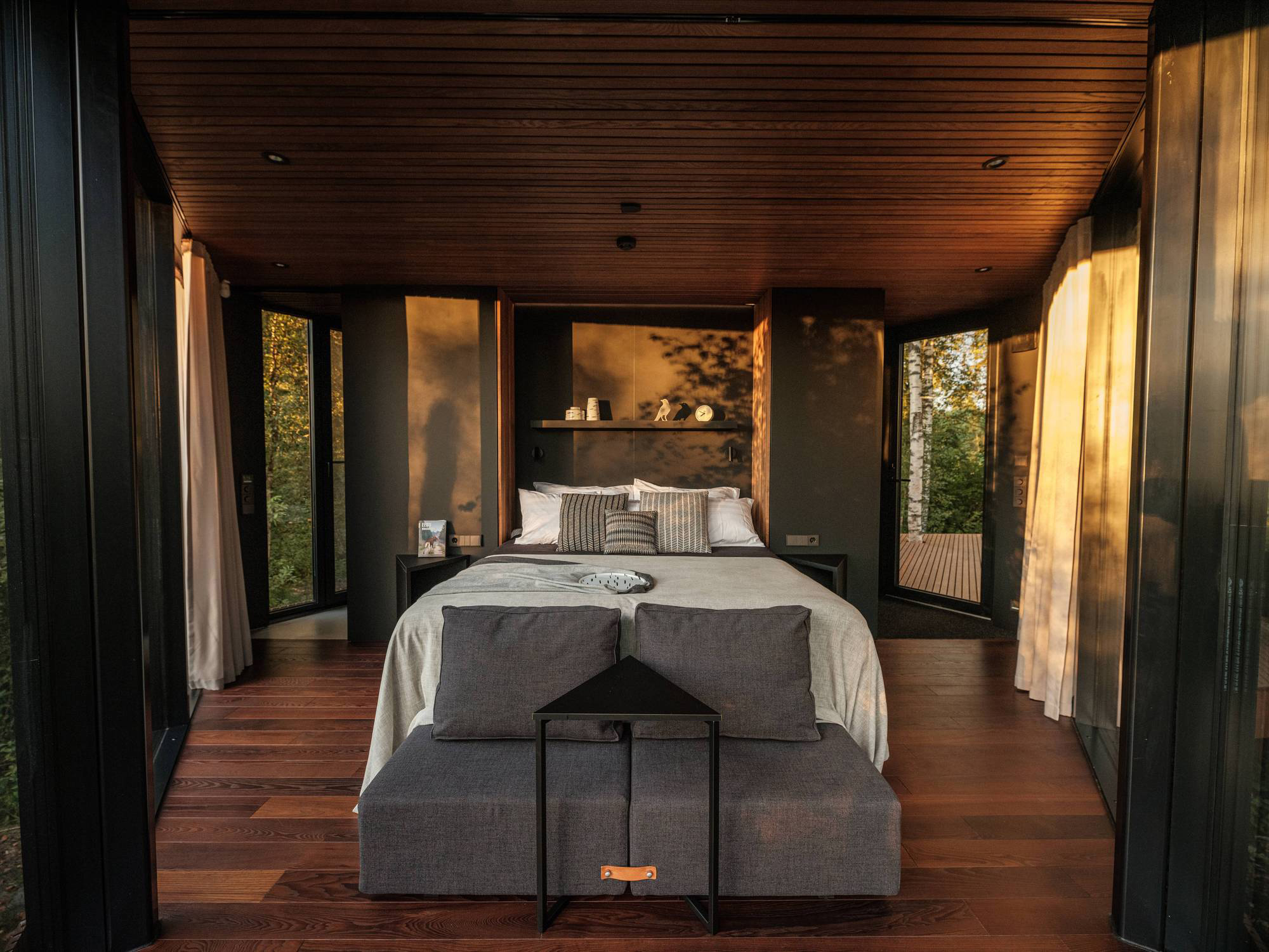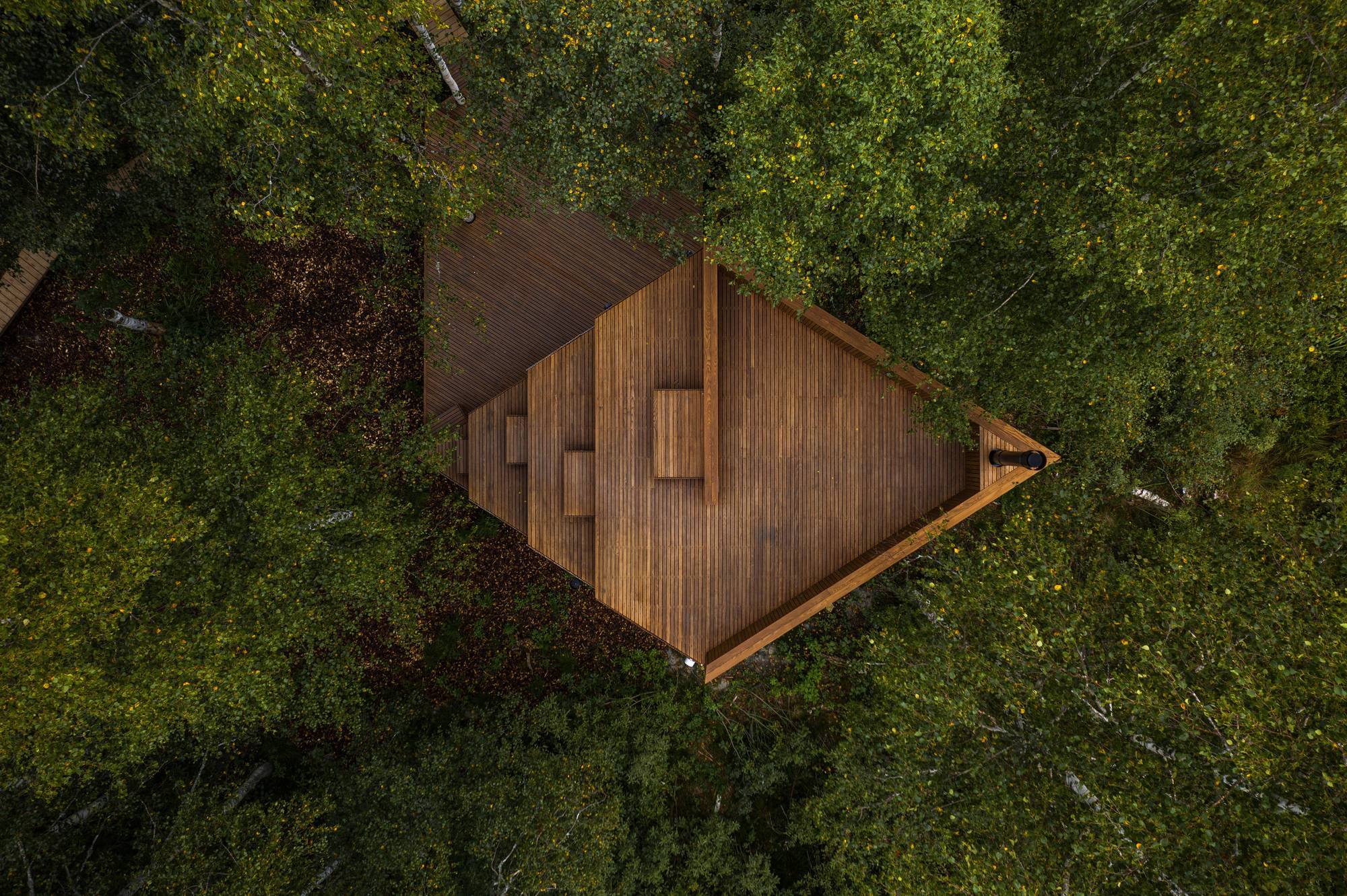 Guests can access the room through a suspended walkway that provides safe passage even during flooding in spring. Terraces on different levels surround the cabin, offering plenty of spaces to relax outdoors, watch the birds, admire the setting, or gaze at the stars at night. The compact building has an irregular form as it follows the shape of the plot and the location of the existing birch trees. Thanks to the secluded position, the studio could design generous glazing for the triangular bedroom. As a result, guests feel immersed into nature at all times.