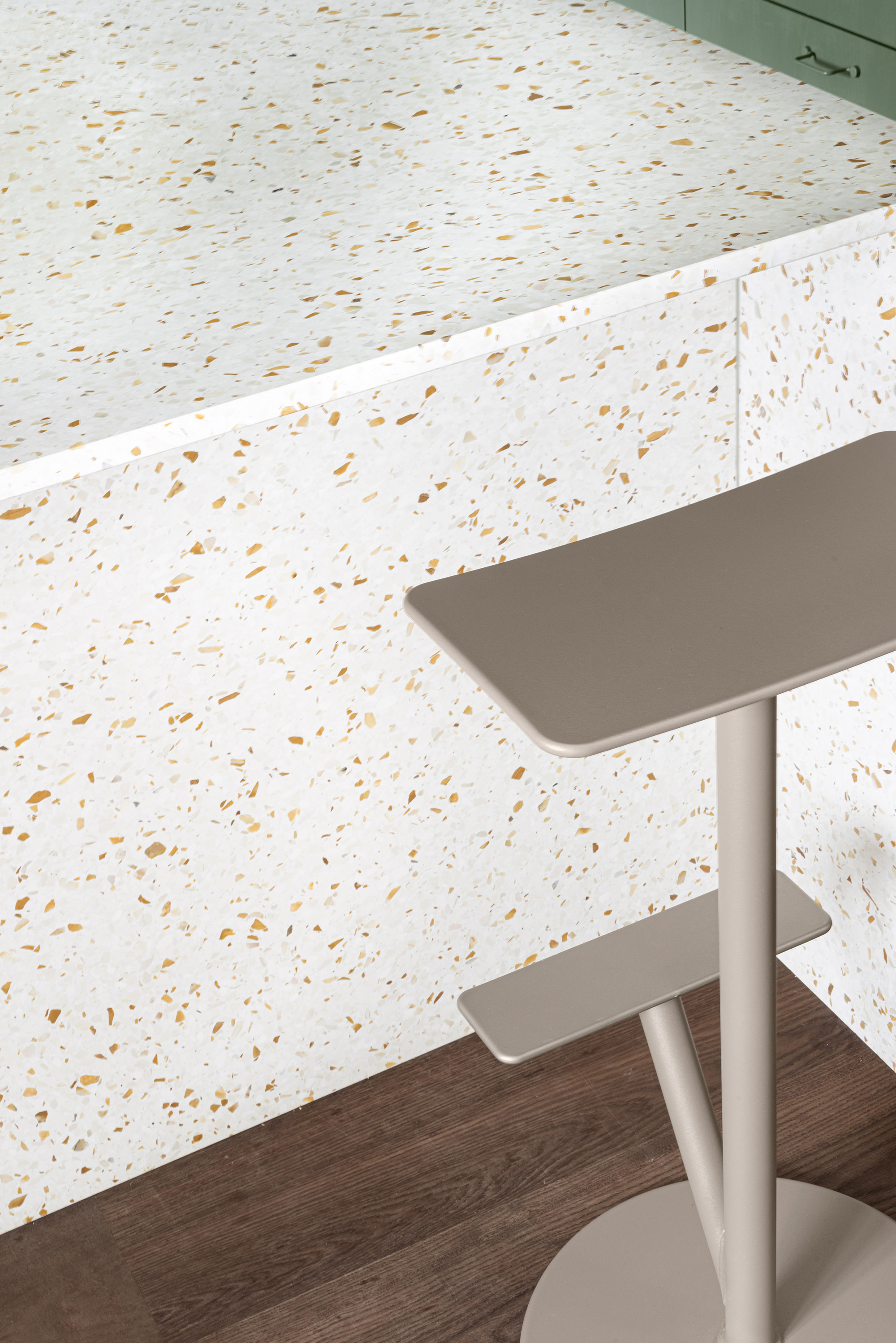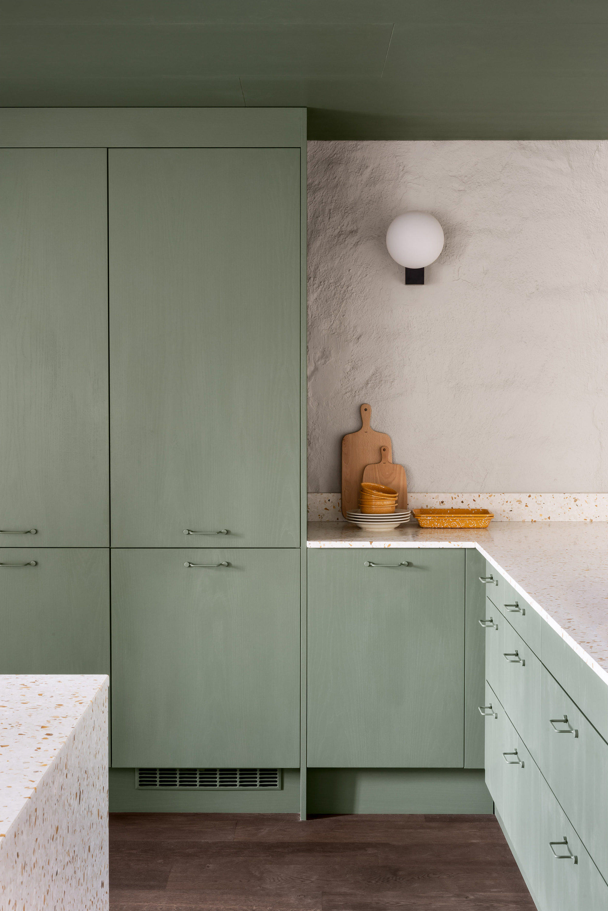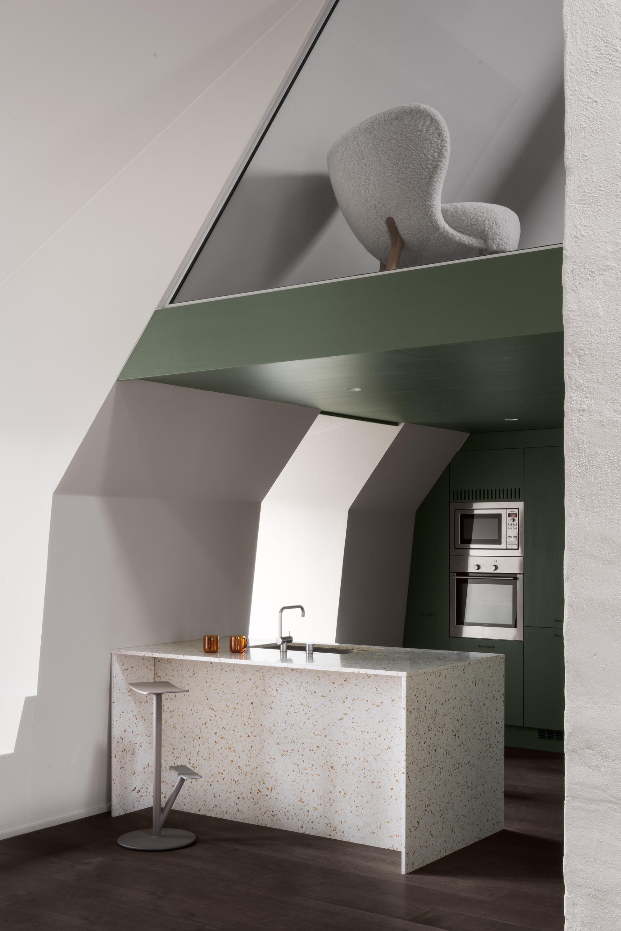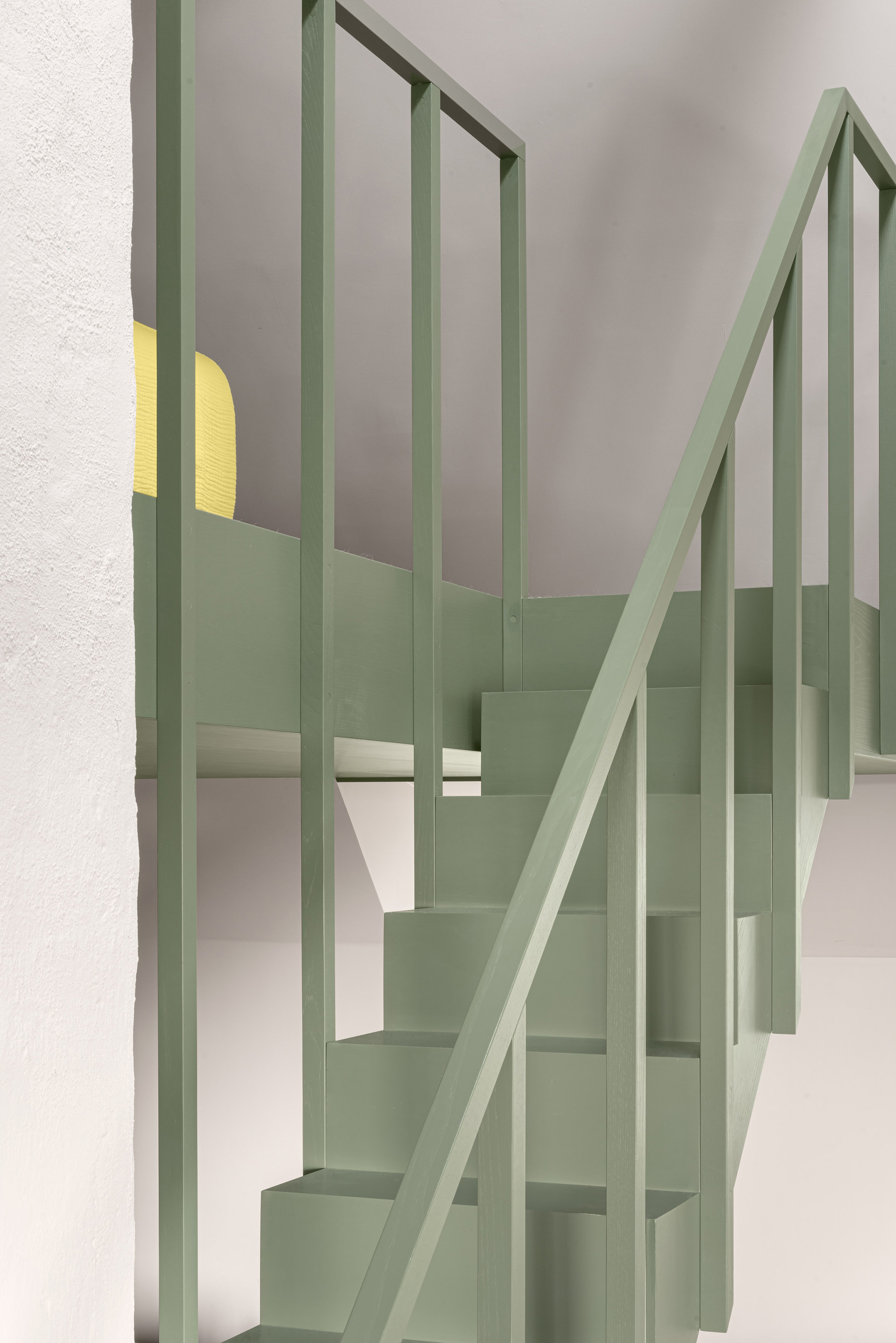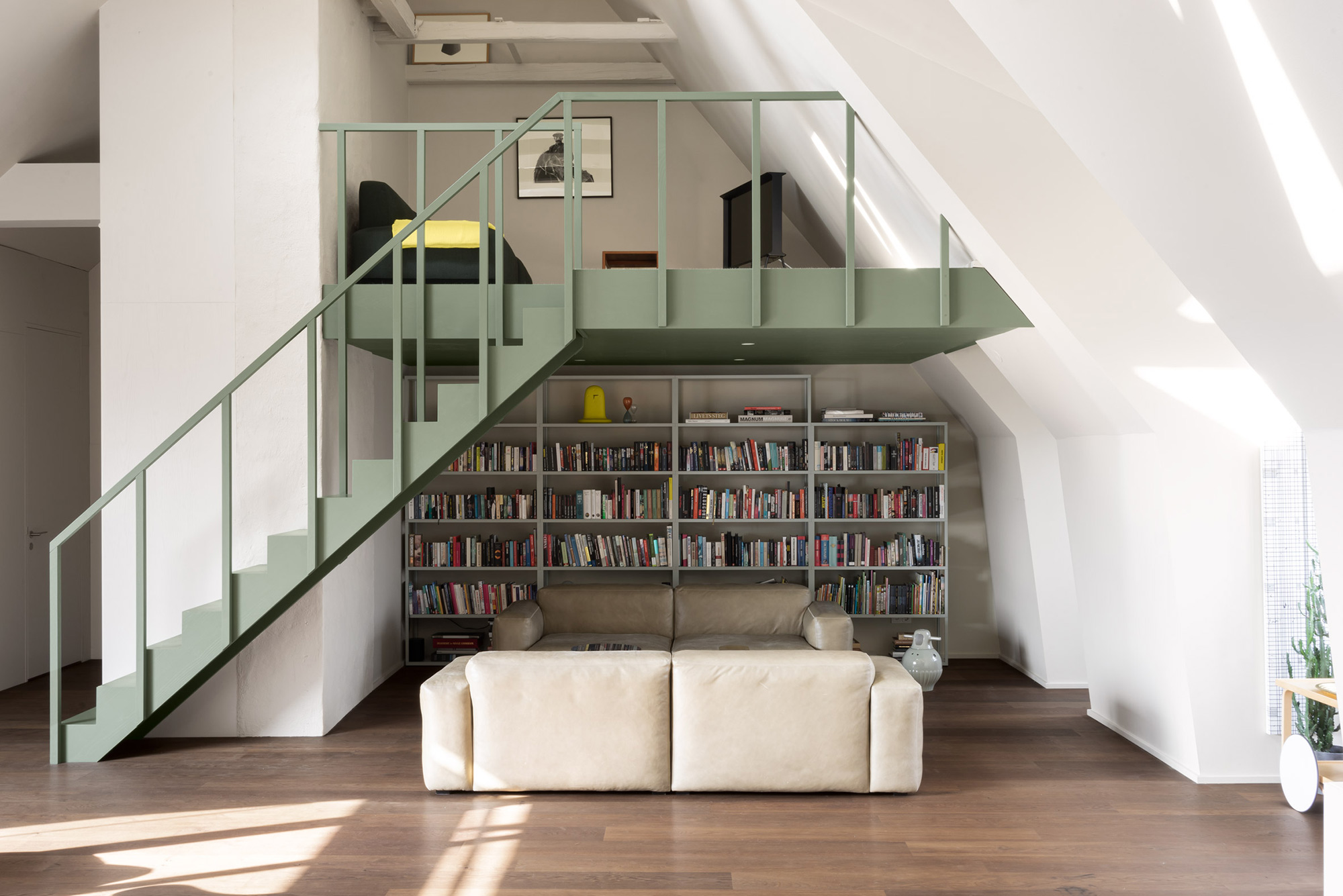 Apart from the sleeping areas, the extra level also contains clever storage that optimizes the available space. Reaching the ceiling, this functional area is accessible via a ladder. To create a seamless transition between the existing living spaces and the units, the studio redesigned the kitchen. Now, it features the same green color as the new loft. A terrazzo-like kitchen island with golden accents complements the new finish. The staircase that leads to the upper level also features the same shade of green. Finally, glazing in a small lounge area allows the sisters to see the rest of the apartment at a glance. Photographs © Note Design Studio.