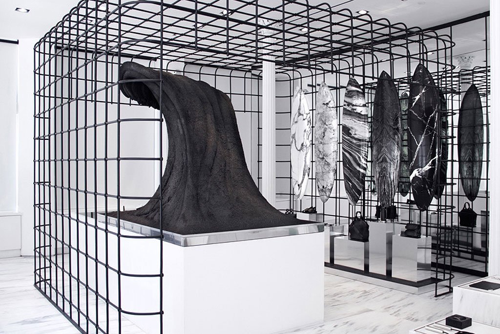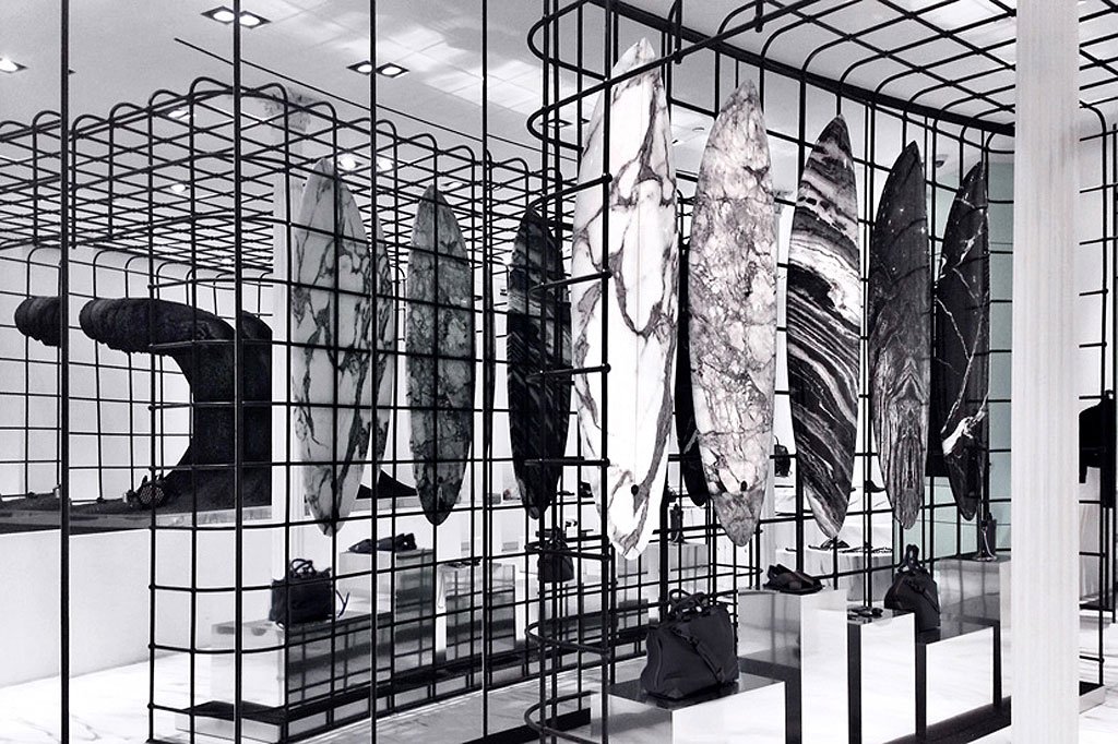 These marble surfboards were collaboratively designed by the fashion label Alexander Wang and the Australian surfing brand Haydenshapes. Produced in a limited edition run, the hypto krypto boards were each handcrafted to perfection. Now on display in AW’s New York City flagship, the boards accompany a wire cage, a wave sculpture, and, of course, luxury accessories “washed up” on the black sand beach.