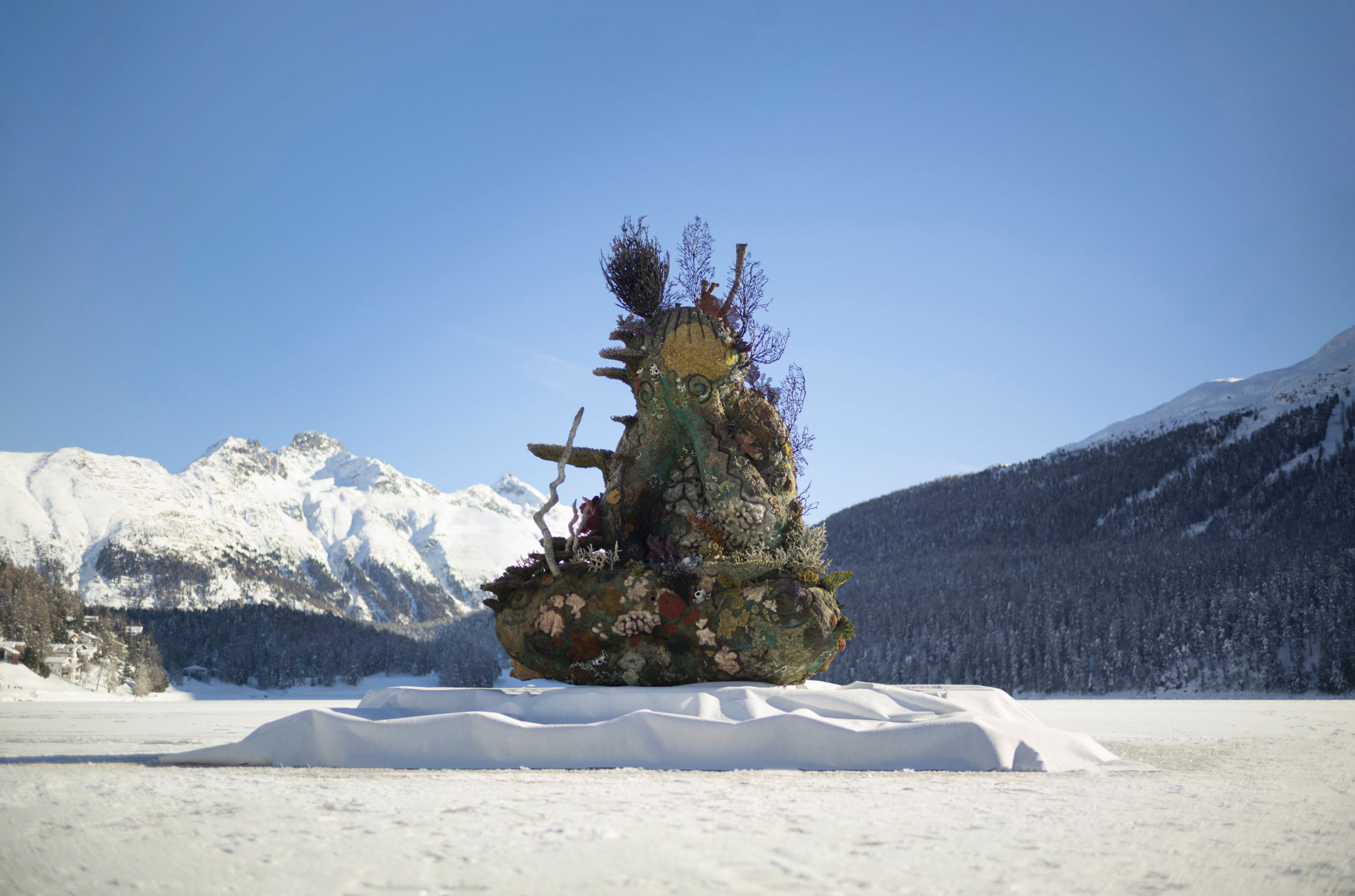 While The Monk (2014) stands out on the center of the frozen Lake St. Moritz, Two Figures with a Drum (2013) and the 21-feet tall Temple (2008) rise from the shores of the lake. Placed right outside the historical Protestant Church building, Proteus (2012) represents Hirst’s version of the shape-shifting sea god from Greek mythology.