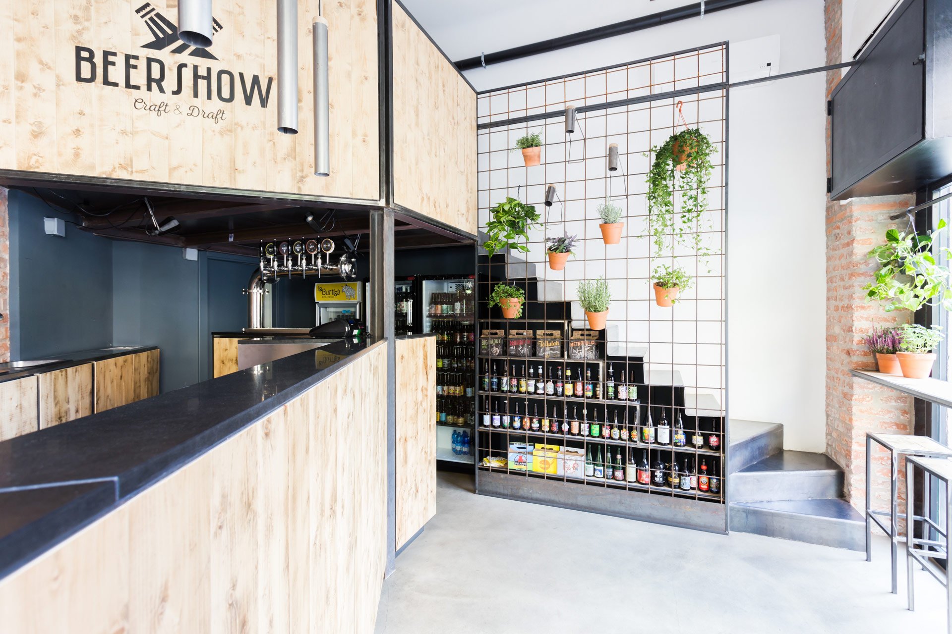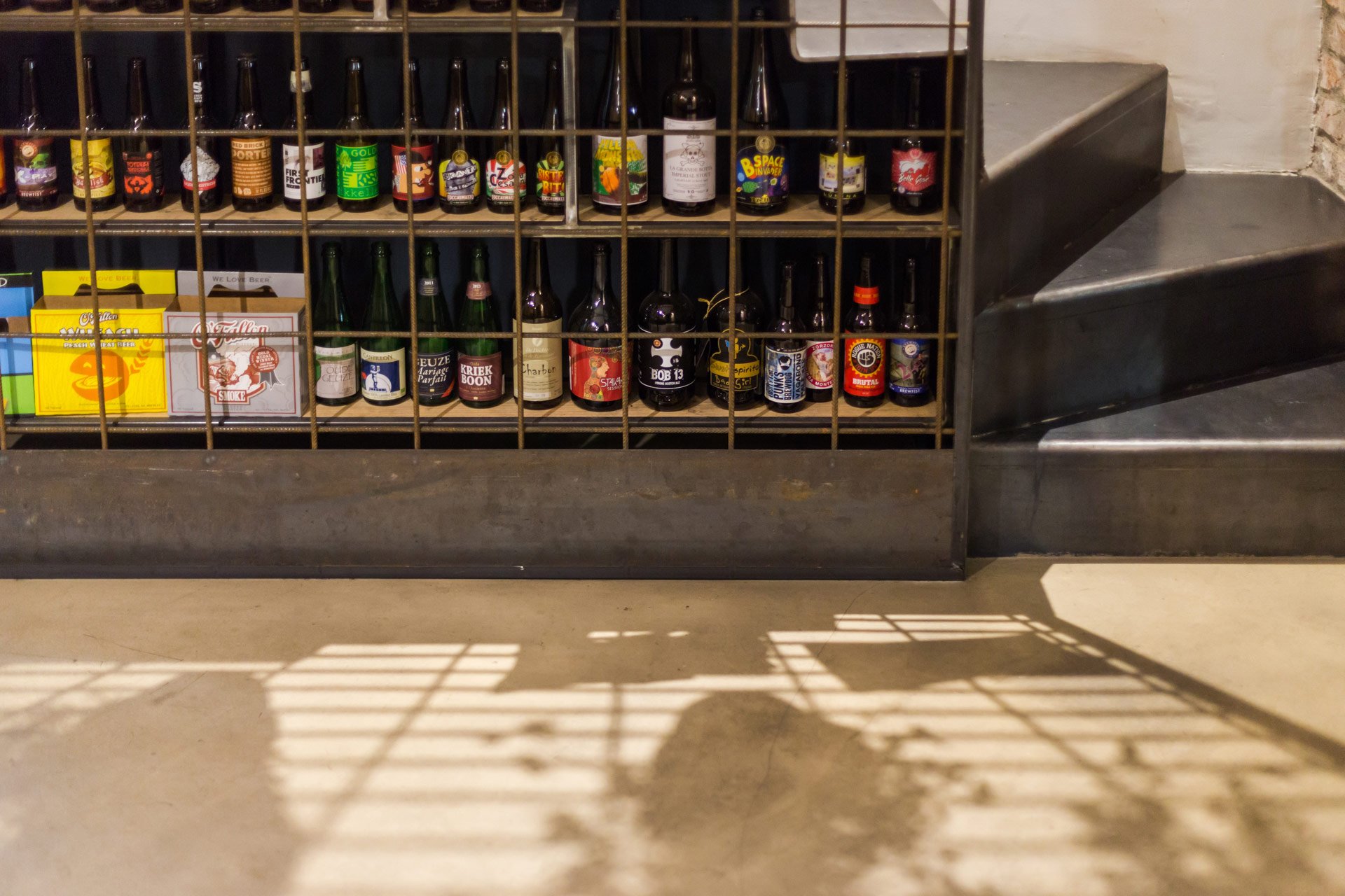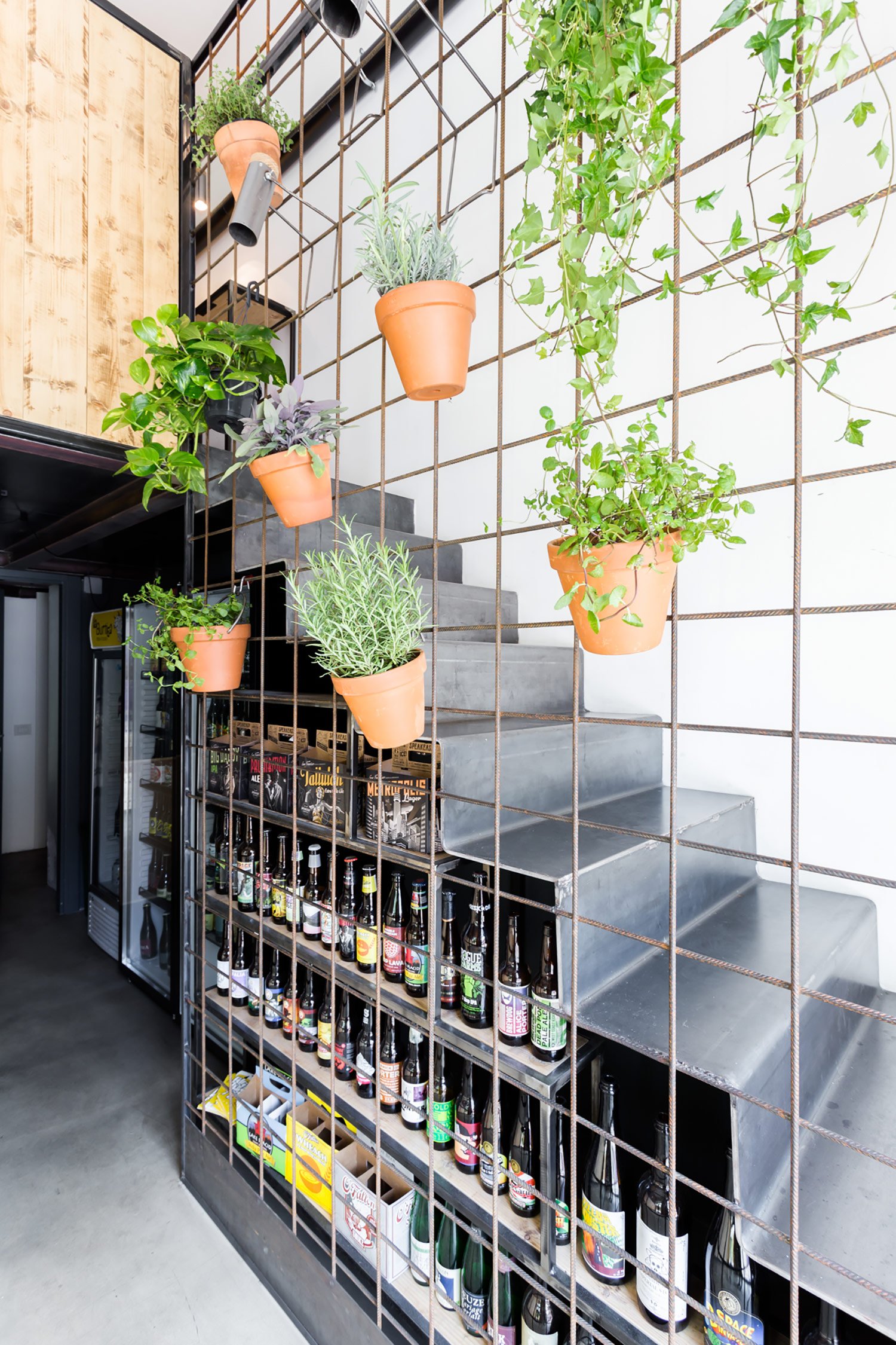 Forgoing a traditional railing for the stair, Mezzo Atelier designed a custom-made steel grid, which while protecting the staircase also provides a myriad of inventive uses for the shopkeepers, such as hanging plants, lamps or even cork boards for clients to see and post local events on. This grid helps divide the downstairs from the passage to the upper, more secluded seating area, but does so in a way that’s airy and novel. The materials chosen for the grid and staircase are left raw in a style that mimics the craft product’s commitment to natural ingredients. This logic is applied to all of the furniture in the bar as well, each piece of which was handmade and designed by Mezzo Atelier specifically for this shop. Even the lamps are site-specific, using a combination of natural elements and an internal connection that was 3d printed in biodegradable plastic to amplify the space’s hip mood and overall sense of authenticity. The stark wood paneling of the main bar and upper seating area create a mesmerizing contrast with an old brick back wall that was uncovered while under construction, and help bring a sense of cohesion to an eclectic and diverse space. In remodeling this odd interior into a must-stop spot, Mezzo Atelier have applied the same dedication and elbow grease required to make a quality craft beer into a bustling, fresh architecture full of great big ideas and wonderful little moments. Photography Francesca Ióvene.
