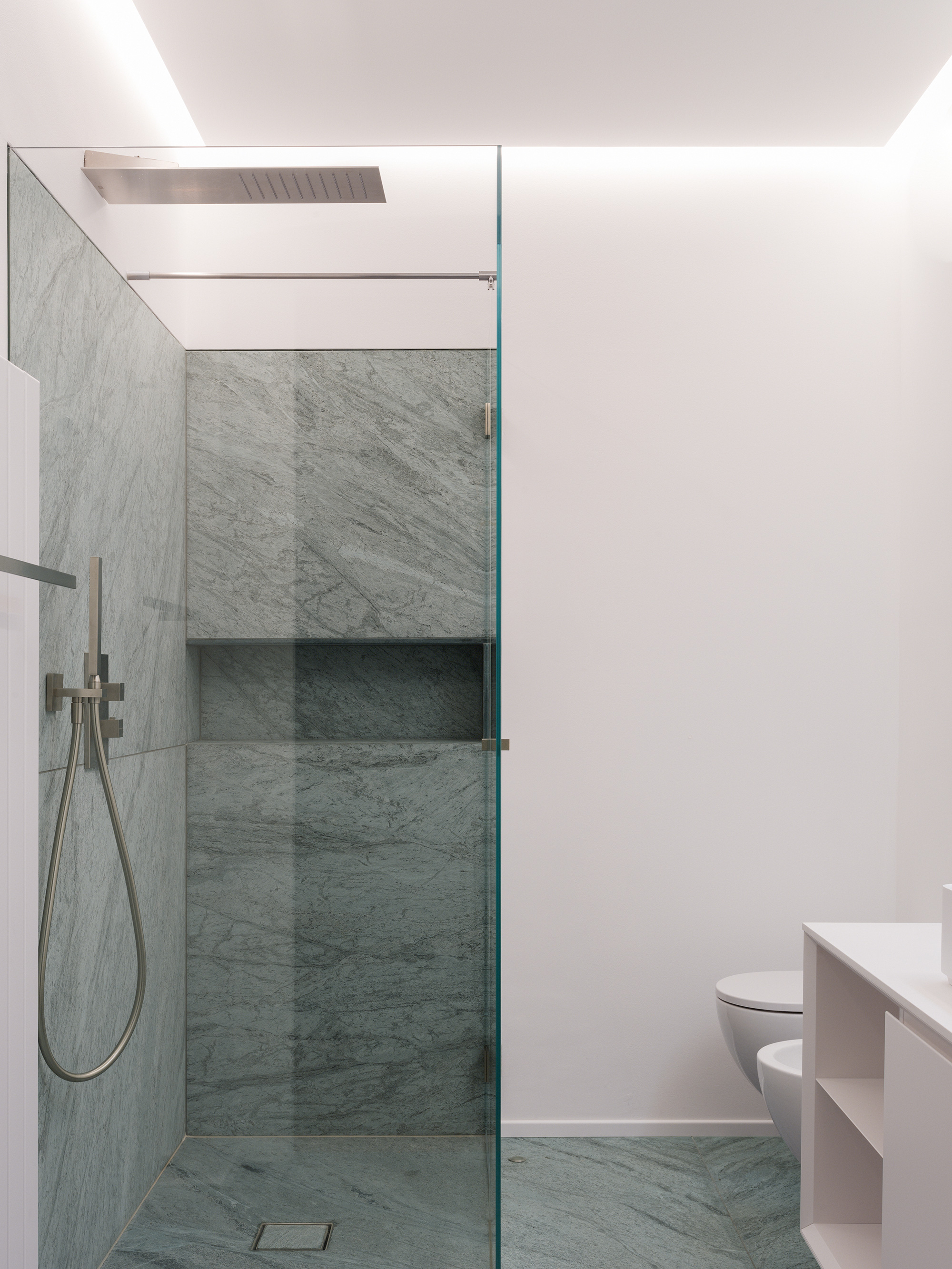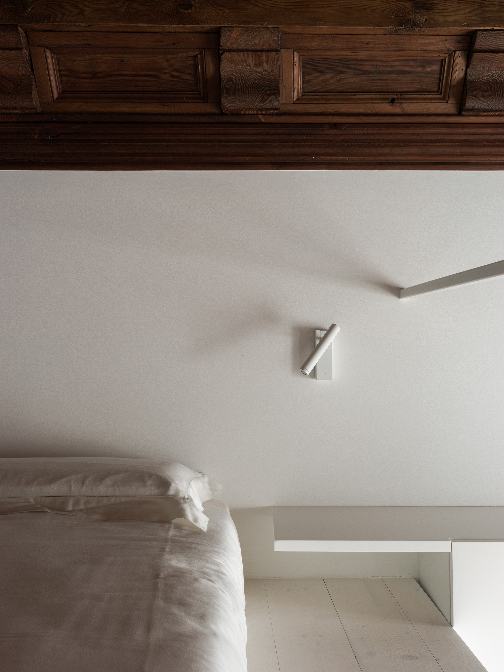 The bedroom showcases the antique heart of the dwelling. In this large room with high ceilings, pine wood with a rustic-grade grain covers the flooring and walls, effectively enveloping the room in a warm embrace. While more modern, the bathroom features natural stone sourced locally. The four custom-made stone slabs boast grain that seems to “flow” towards the shower tray. Set in the stone without connecting elements, the glass cabin gives a sleek accent to the brushed stone.