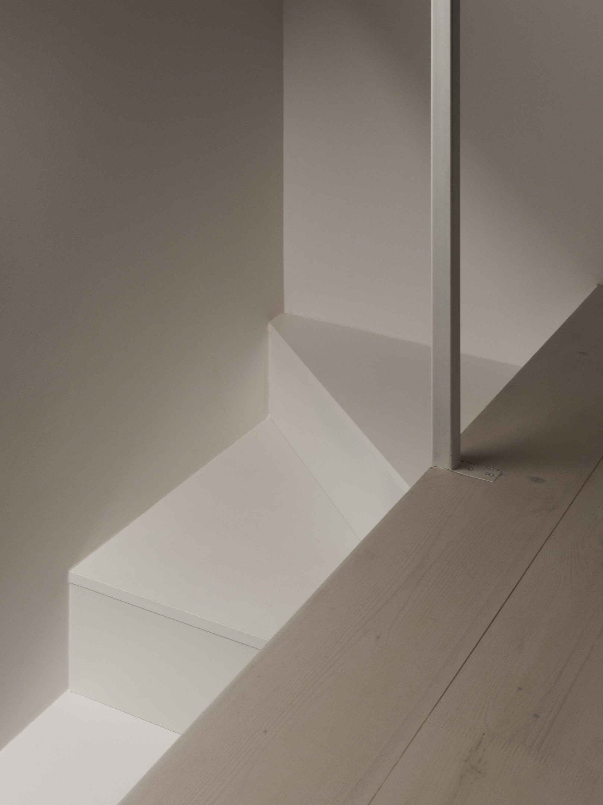 An open-plan space brings together the kitchen, dining room, and living room. Here, the architect designed a custom staircase that leads to a mezzanine. While it maintains a visual connection to the social area, this upper level provides a quiet space to relax. Wooden beams with a rich brown color complement the light wood flooring and white walls. Crafted from wood, the bespoke kitchen unit features white lacquered finish that matches the walls and also allows the darker ceilings to take center stage.