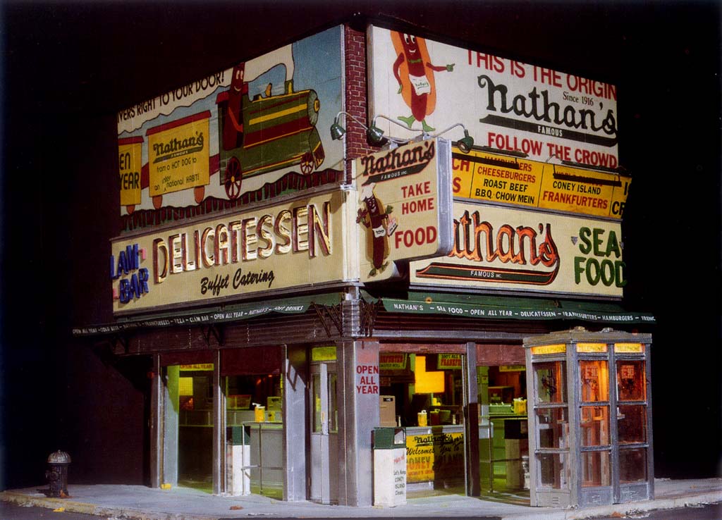 The ghosts of those who haunt the city streets leave behind clues for us to find: a newspaper here, a half-eaten hamburger there. Through great dexterity and vision – yes, both kinds – Wolfson weaves together a narrative of the city dwellers and the sculptural buildings out of plastic, metal, and occasionally wood, cardboard, and paper. All of the pieces are inspired by but not reproductions of actual locations, and manage to capture a flavor of the city that leaves an aftertaste of intrigue and wonderment.
