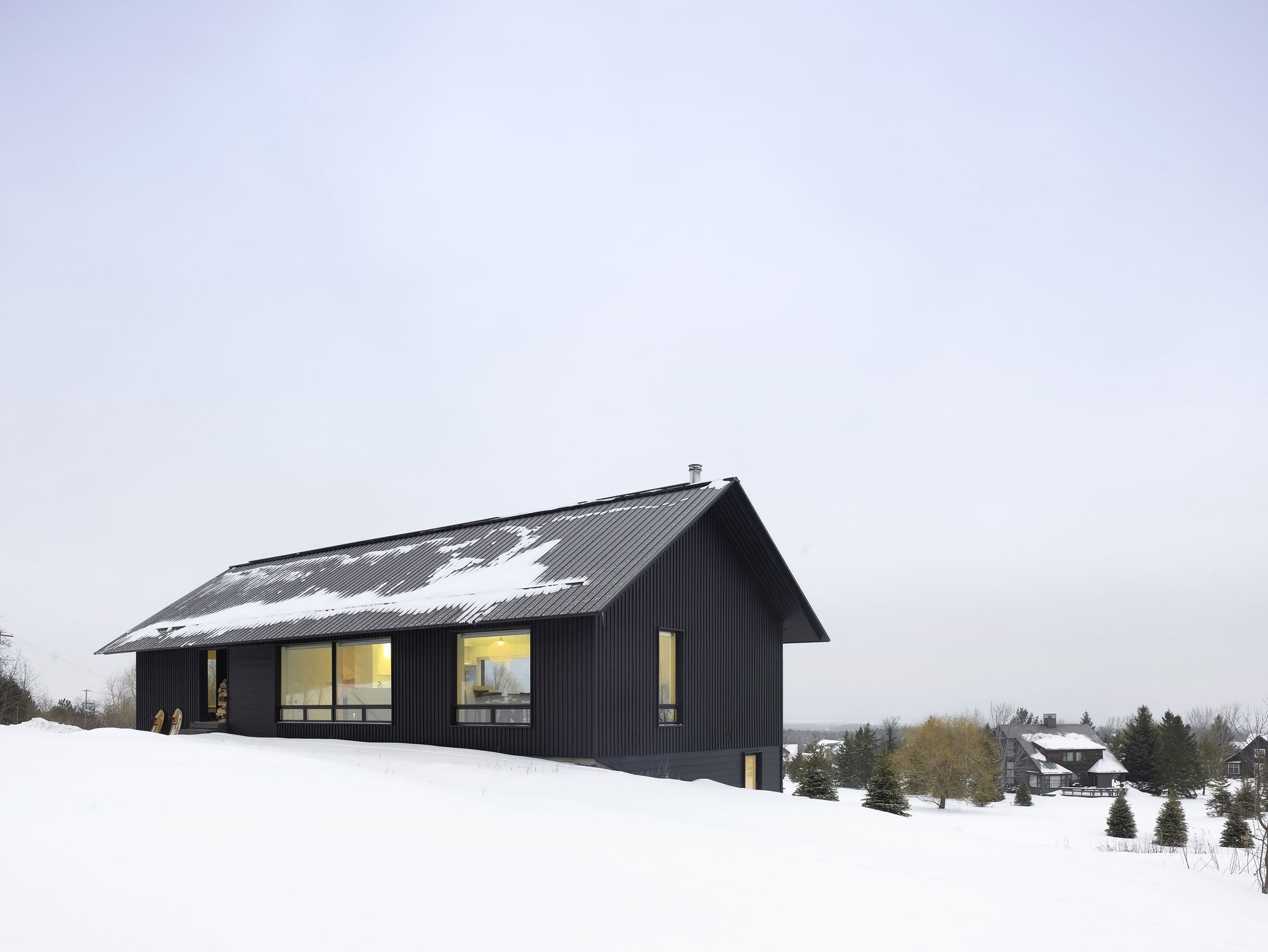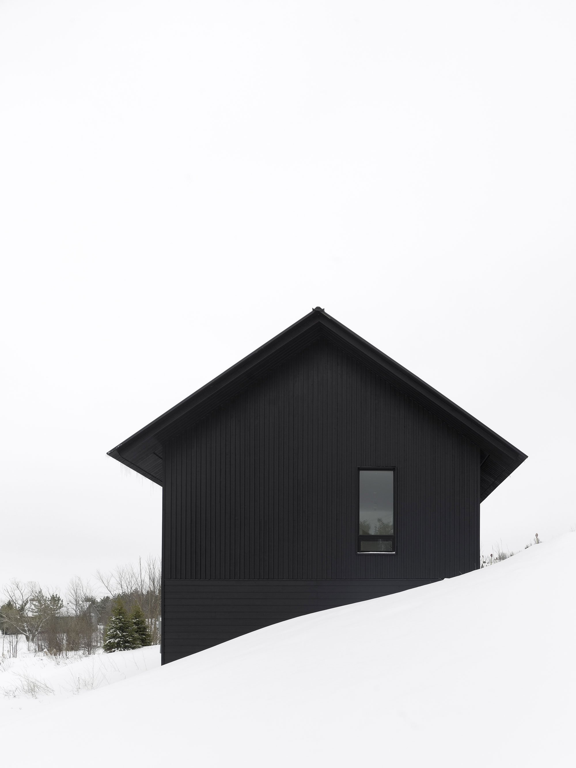 Located in Southern Ontario, Canada, this modern chalet overlooks a gorgeous mountainous landscape while also providing views towards the Nottawasaga Bay. The Toronto-based AKB (Atelier Kastelic Buffey) architecture studio designed Clearview Chalet with a specific brief in mind which included easy long-term maintenance, a tight budget, and a short building schedule. As a result, the structure boasts a minimalist design that puts an emphasis on understated style. Partly embedded into the side of the sloping terrain, the wood house blends into the natural setting. The cladding stands out in the snowy landscape thanks to the black finish.