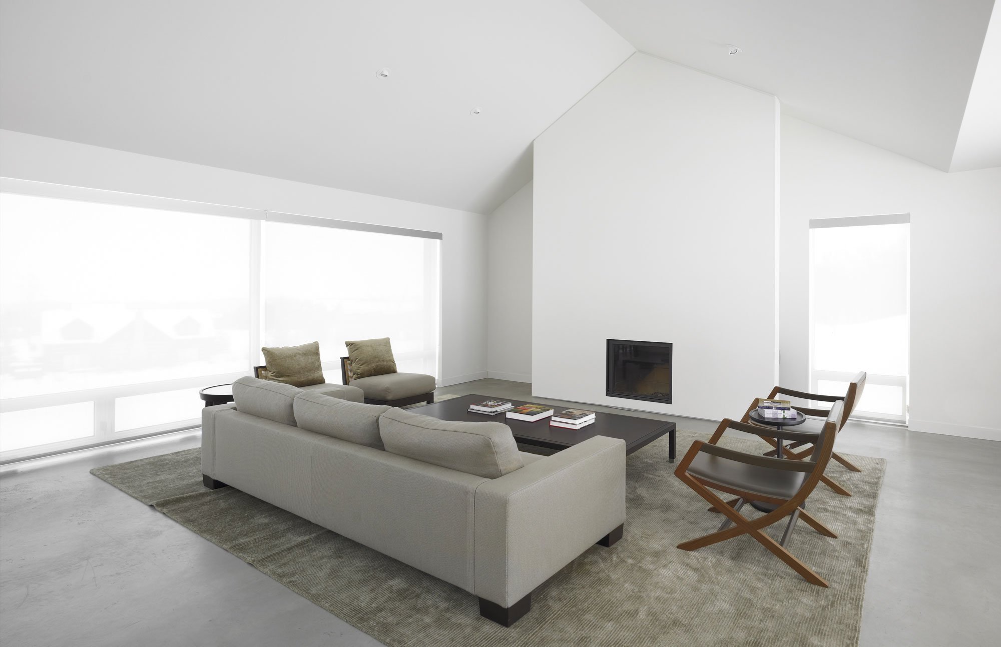 The low pitched metal roof with an overhang reinforces the classic appearance of the house while also keeping falling snow away from the exterior walls. By contrast, the interior boasts all-white walls and ceilings as well as large windows, blurring the line between the living spaces and the outdoors. Concrete floors and custom oak cabinets appear alongside elegantly simple furniture. In the main lounge space, a wood burning fireplace creates a warm and cozy ambience that softens the refined, minimalist décor of this modern chalet. Photographs© Shai Gil.