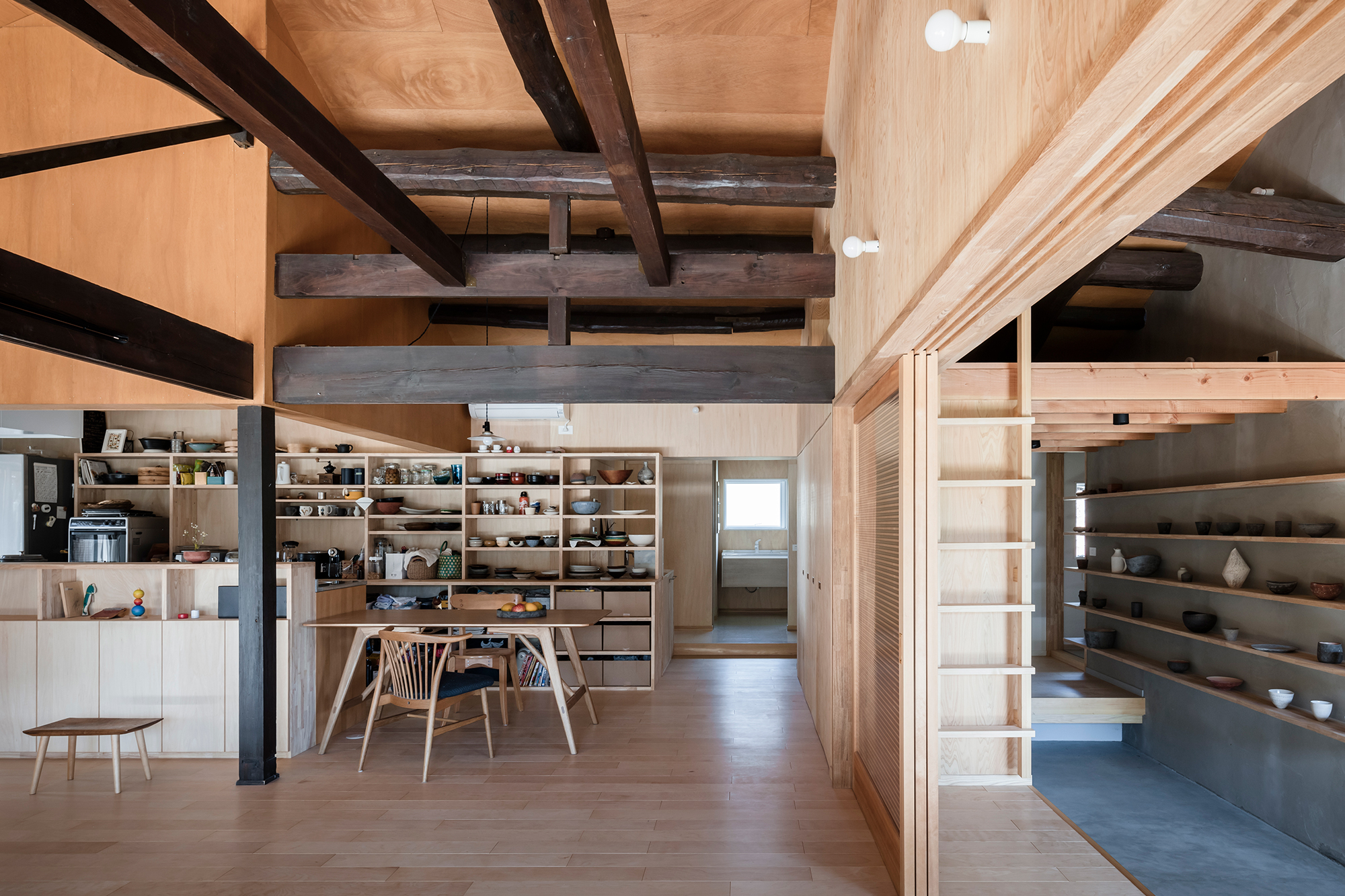Located in a quiet and green neighborhood of Okayama, Okayama Prefecture, Japan, this house is one of several old houses designed with thatched metal roofs. Architect Masashi Takeda, founder of architecture and design firm raumus, was tasked by the clients to renovate the Minka, which means old Japanese-style house, and convert it into a modern home. Named ‘Renovation of Minka with a ceramic artist’s studio‘, the project consisted in the restoration of the old house and the preservation of its charm and character, but also in the design of new living spaces that fit a modern lifestyle. The clients are a family of four: a ceramicist, a chef, and their two young children.