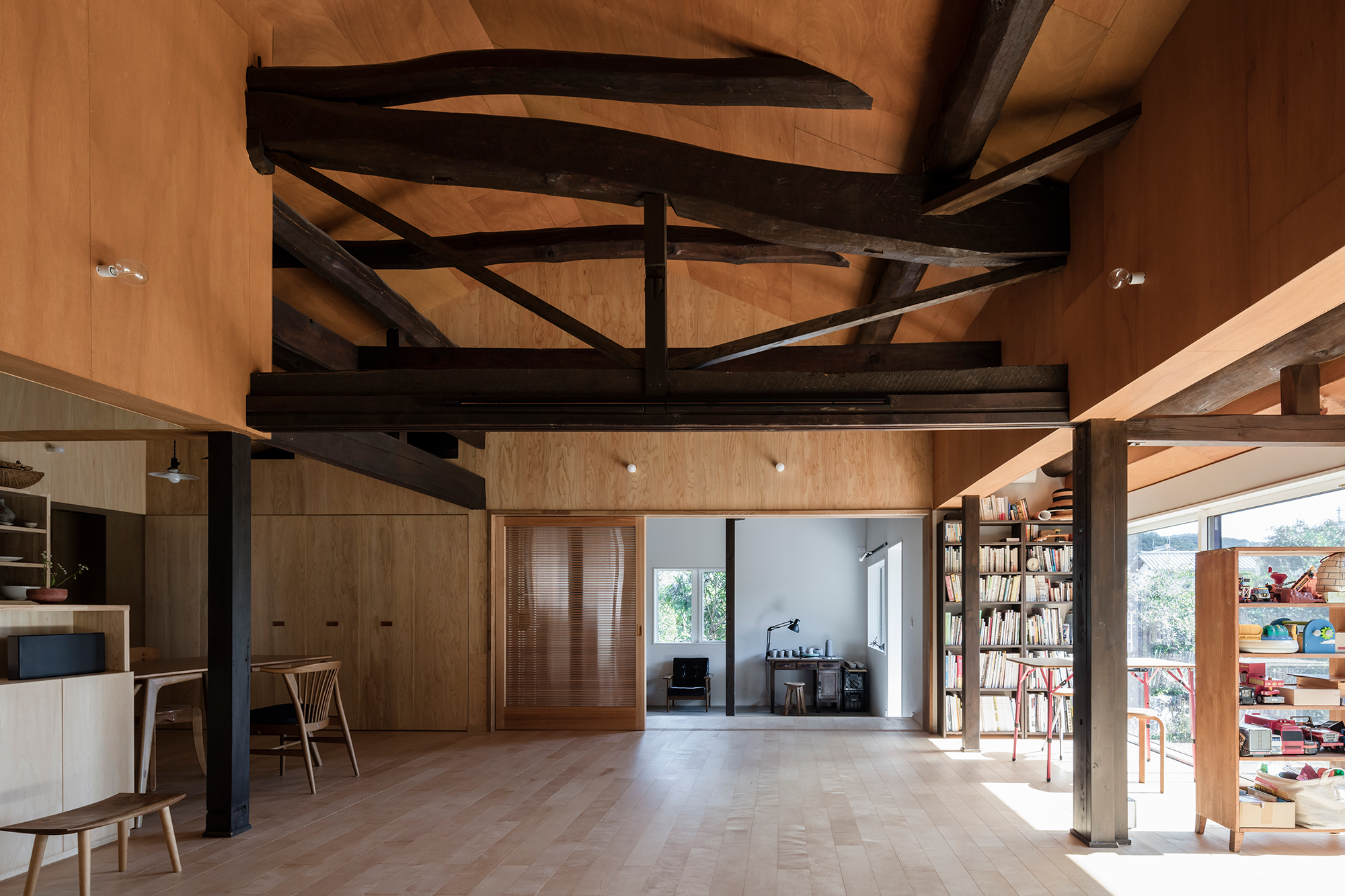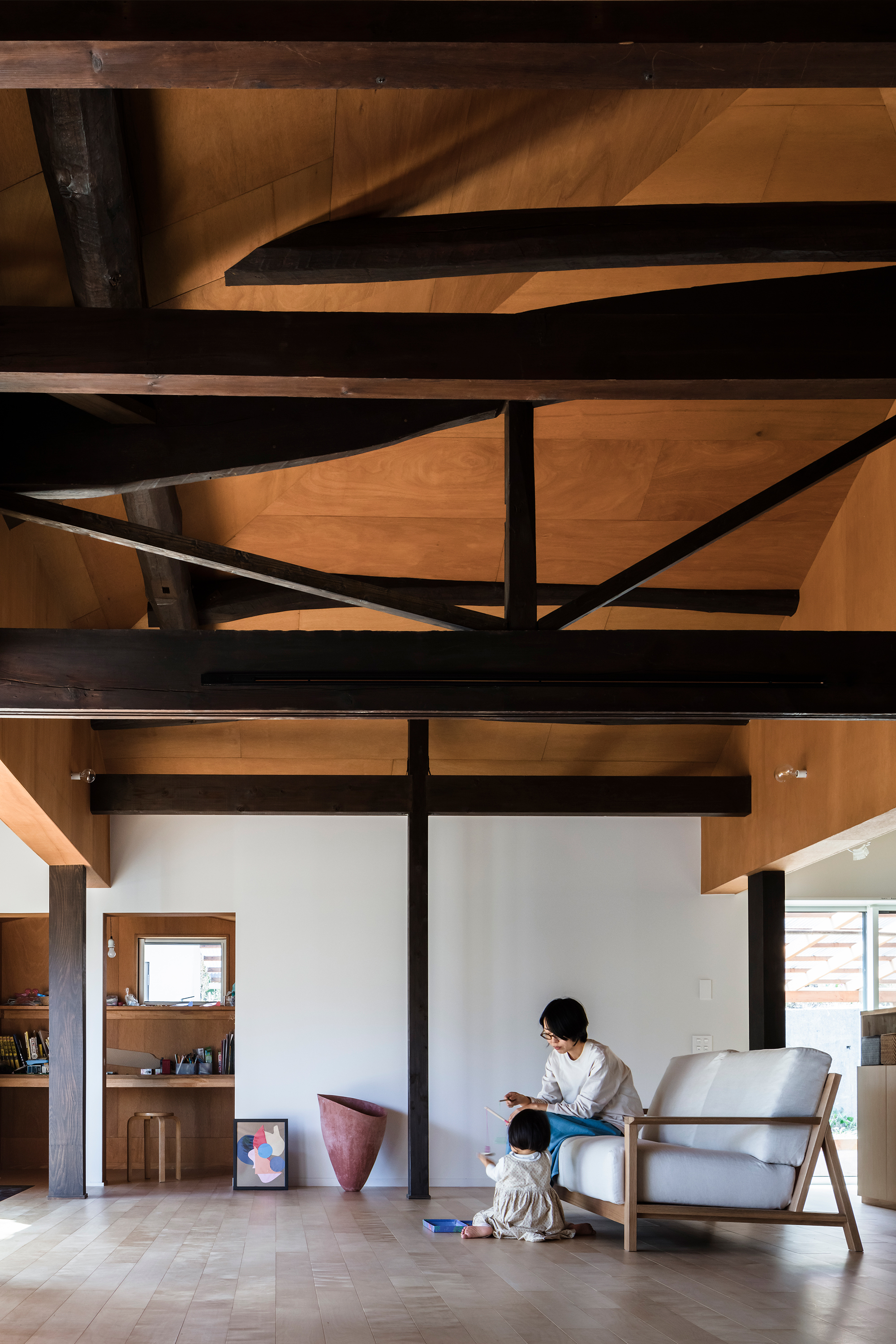 Throughout the house, the studio created a harmonious blend of old and new elements, without putting the focus on one instead of the other. For example, the team kept the original dark wooden beams and columns and added matching dark-colored plywood on the upper ceiling but lighter plywood on the lower ceiling section to match the contemporary furniture. Finally, this old Minka rises to the standards of new buildings thanks to new insulation, a heat pump, and a total heat exchanger that ventilates the entire house without causing heat loss. Photography © Norihito Yamauchi.