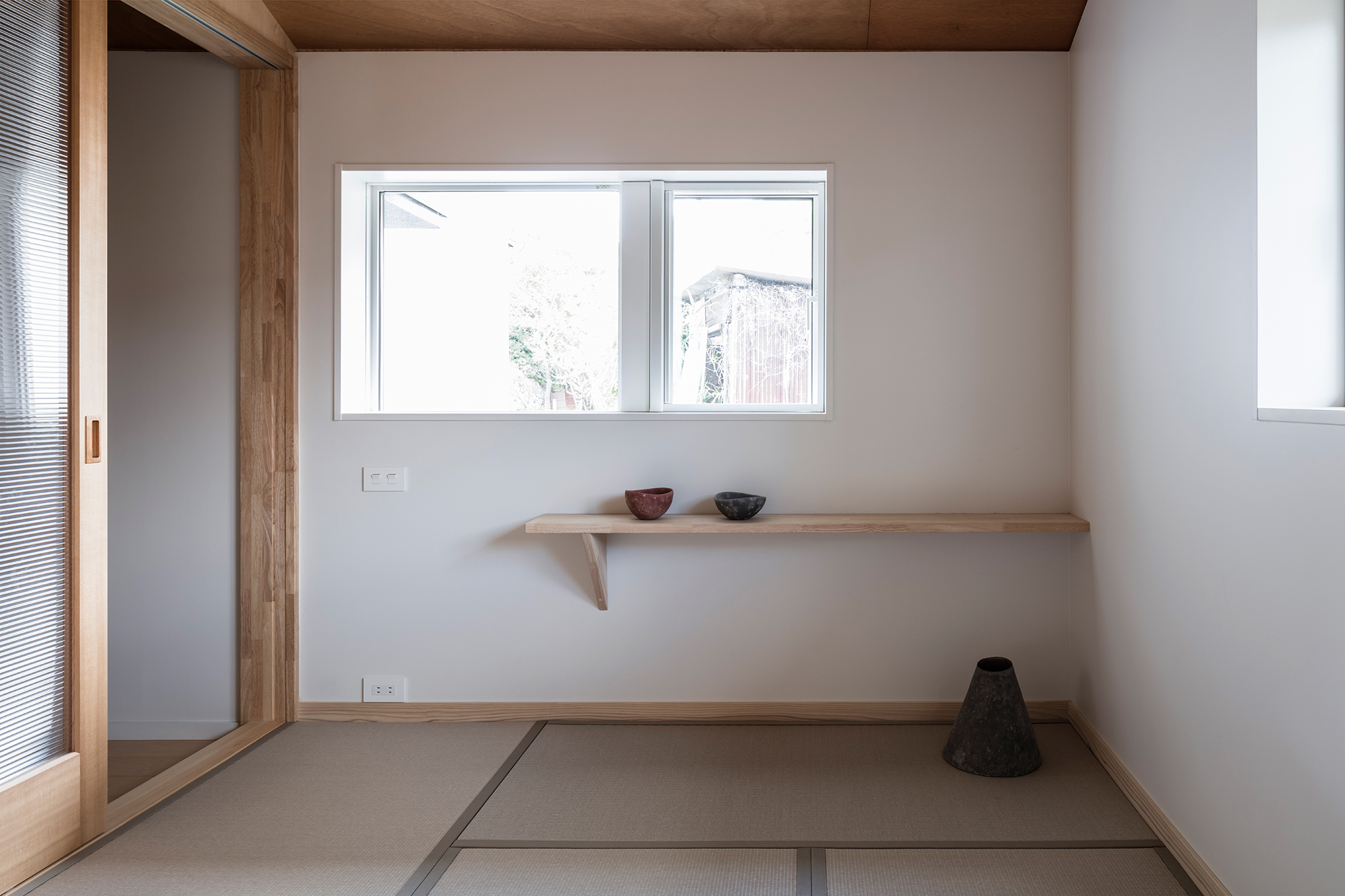 The parents have busy schedules and work from home. Both of them welcome clients into the house. While the husband opens up his ceramic art studio for visitors who come to see him work in person, the wife cooks meals for guests. As a result, the architecture firm reconfigured the floor plan to create a combination of public and private spaces. The home now features three distinct areas: the doma/tatami room for guests, the day living spaces, and the bedrooms. Three sliding doors separate the doma (earthen floor) and the hall or connect them to create a spacious room.