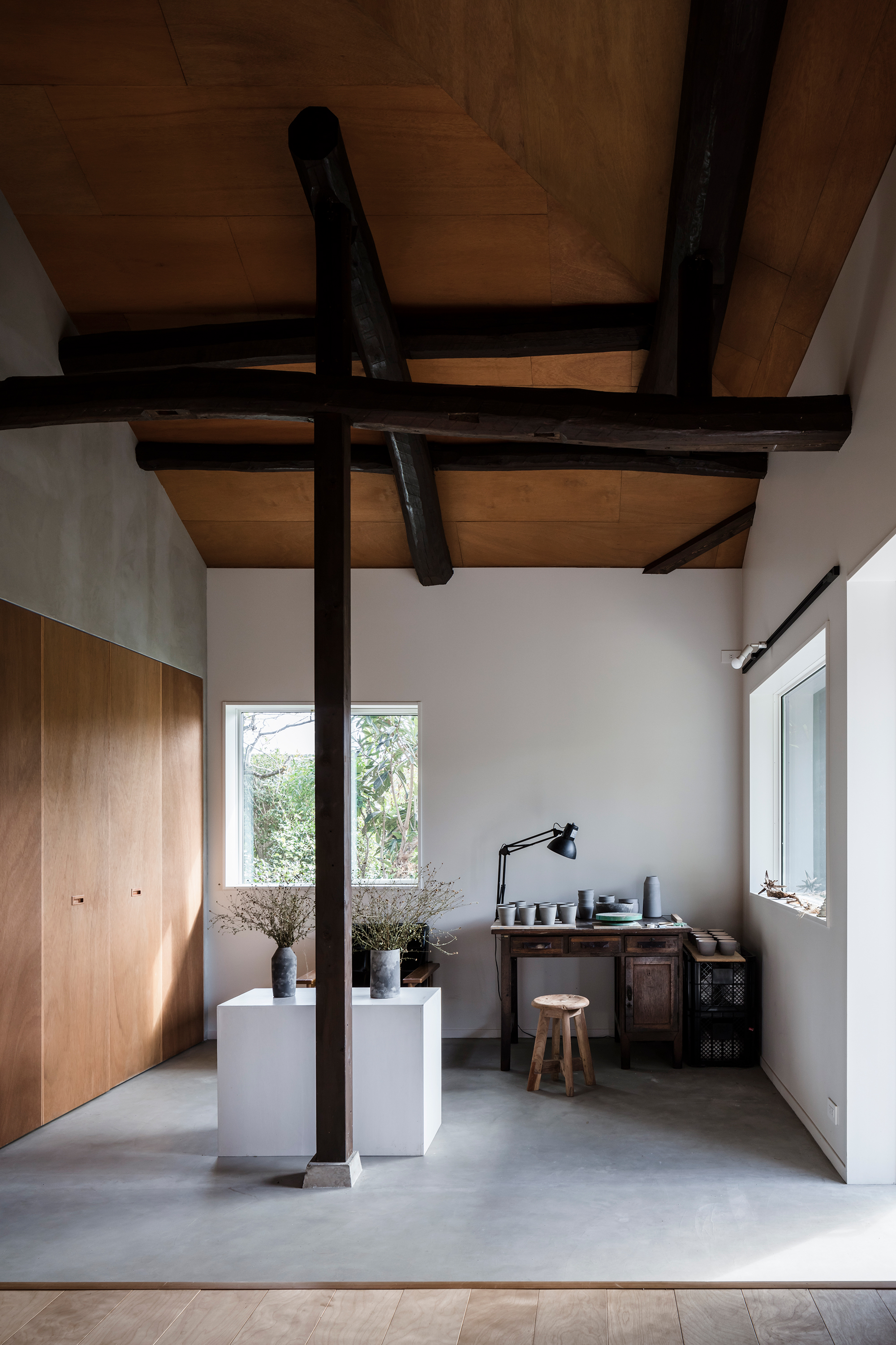 A traditional Japanese thatched roof house, transformed into a modern home with work/live spaces.