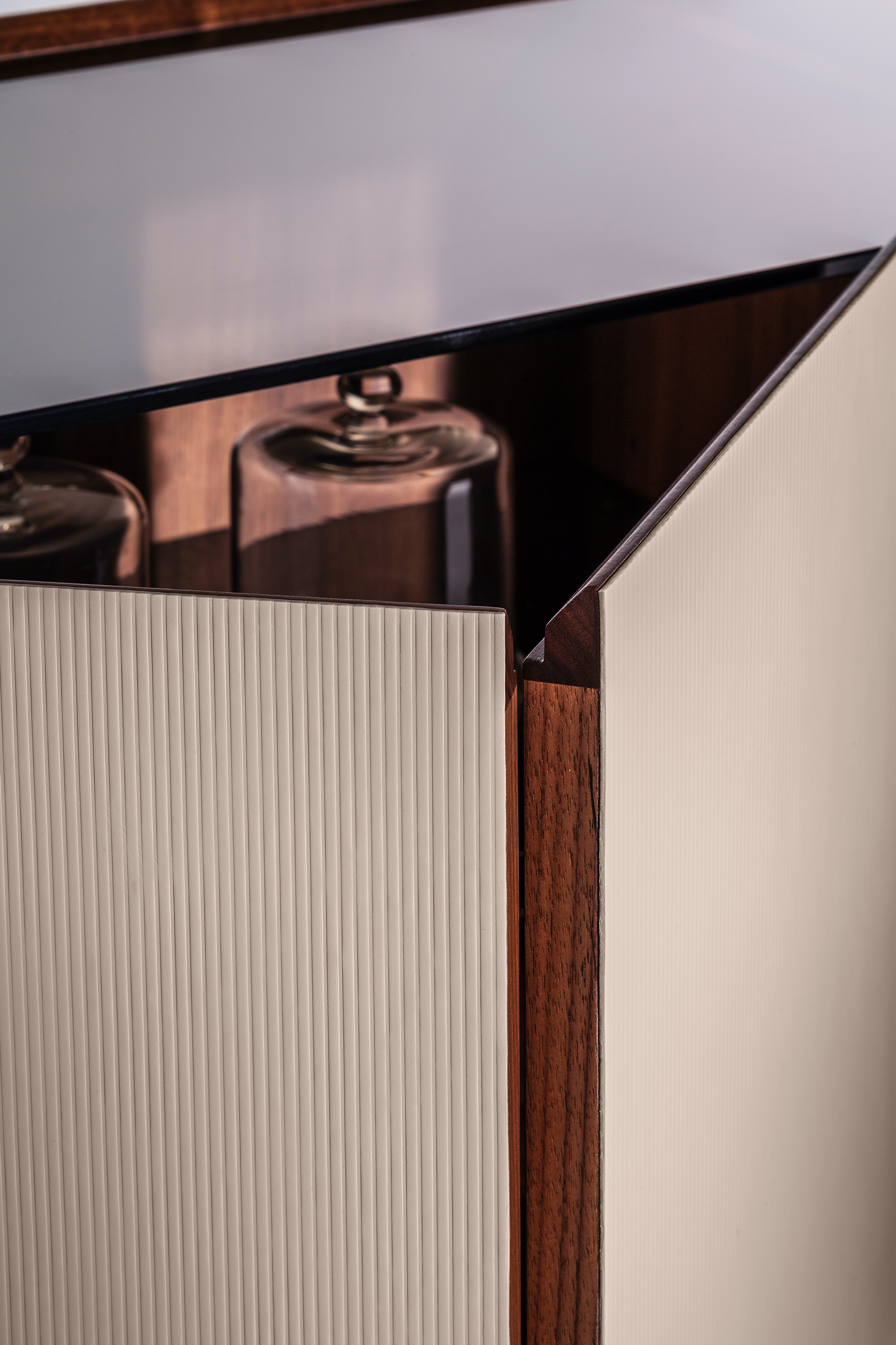 Poltrona Frau used refined material combinations for this collection. For example, this modern bar cart boasts Cuoio Saddle Extra leather upholstery with a vertical striped texture and a subtle 3D effect. At the top, the burnished and brushed steel tube boasts a leather handle with hand-stitching. Inside the cabinet, the tempered glass shelf has a conveniently adjustable design with three different positions. The brand used Canaletto walnut veneer for the unit’s sides and bottom, as well as lightweight doors with a honeycomb structure. The four swivel casters offer an easy way to move the modern bar cart through a room to serve drinks.