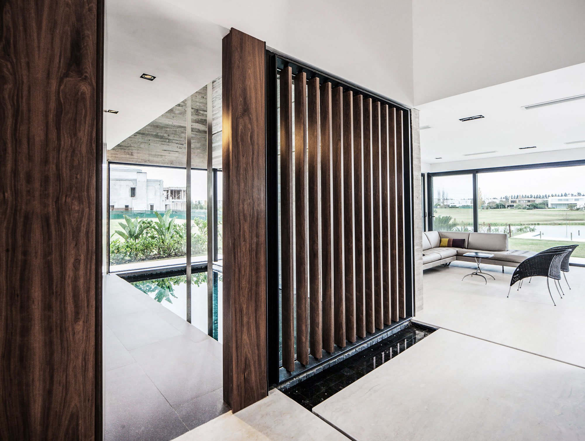 Located on the outskirts of Buenos Aires, this modern concrete house overlooks a beautiful landscape which includes a lagoon and a golf course. The owners envisioned a dwelling where their children and grandchildren could come visit frequently. As a result, REMY Architects designed a spacious home with a double height central space and socializing areas as well as with plenty of independent, separate rooms. FSY House features a front façade that blends concrete panels, travertine, and lapacho wood – a combination that also appears throughout the interior.