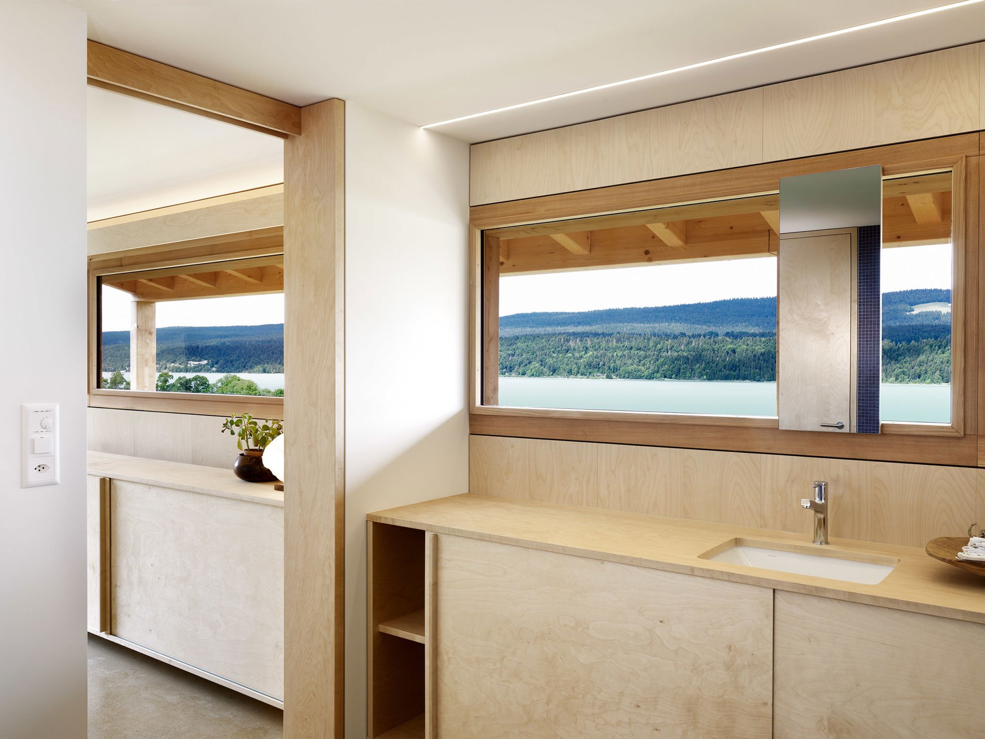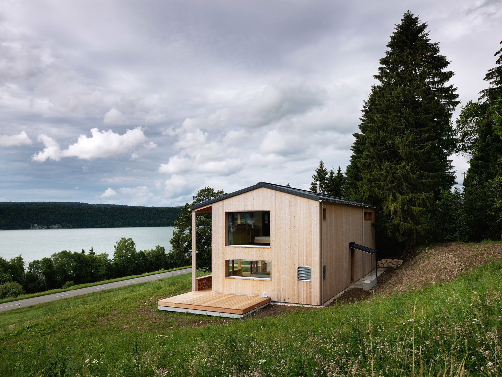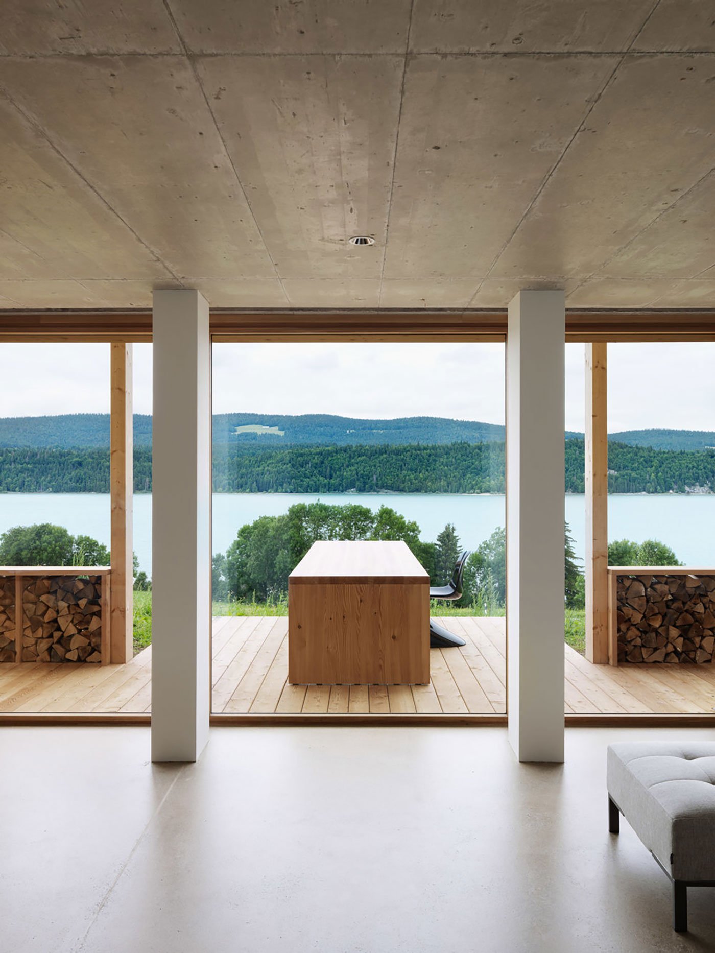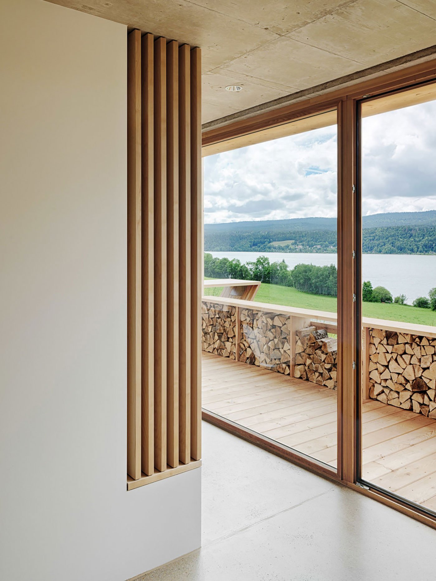 The home is perched atop a fuzzy green hillside and points its broadest side out over the valley where the Lac de Joux waits below – a famous lake in Switzerland which can often be found frozen over and filled with people walking, skating, and dancing on the clear blue ice. Germann has made the most of this opportunity for view, and situated the home so it can be enjoyed from every room.