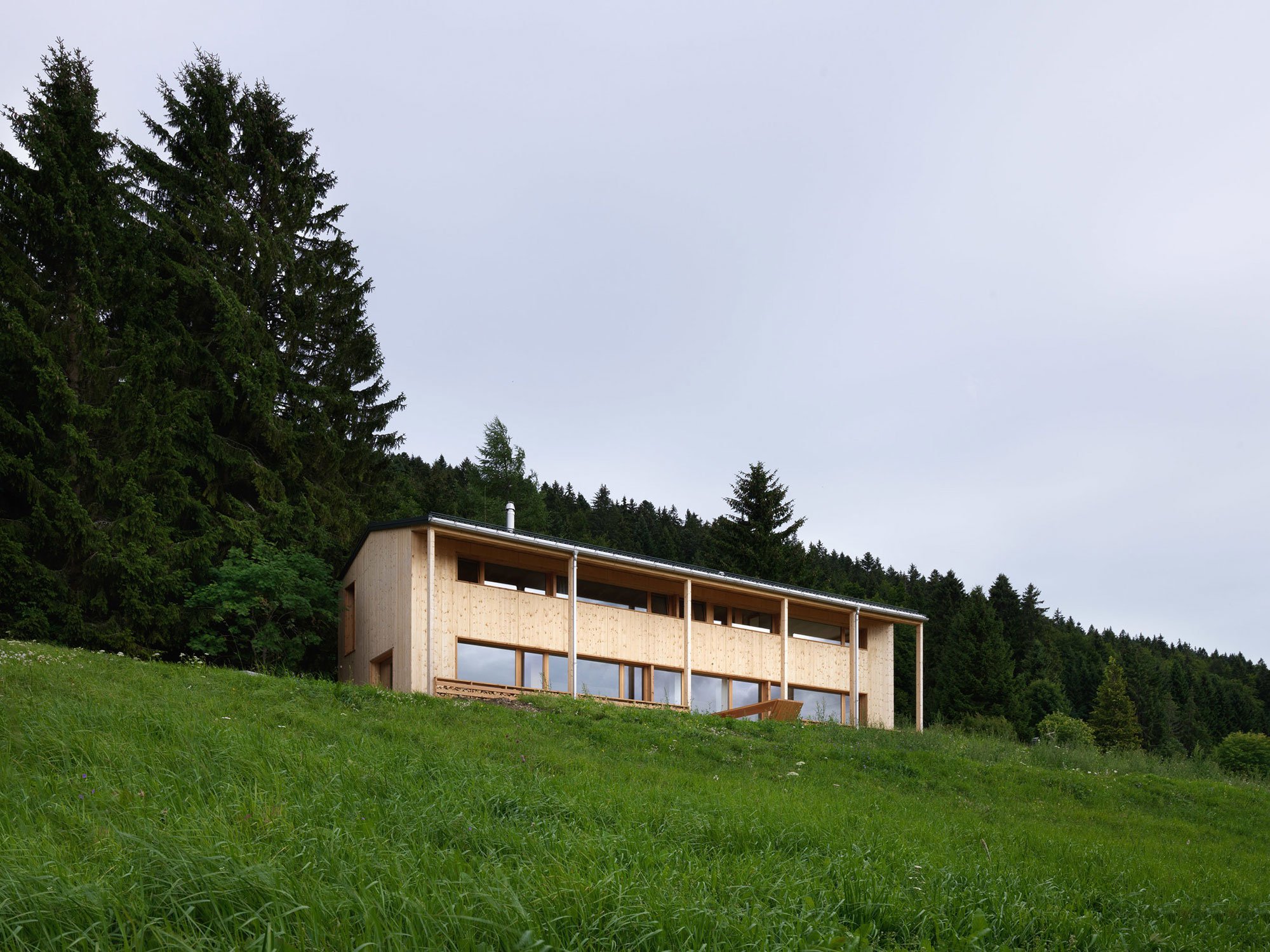 In side profile, the unassuming mountain residence takes the shape of the gabled, 2-story house with a smokey chimney we all used to draw in crayon as children. A few oddly-shaped punched windows and a roofline that extends over a portico on one side are the only differences. However, turning the corner reveals a very different, very adult flavor of design and construction that is wondrous, exploratory, and at the same time utterly basic. Photography by Lionel Henriod.