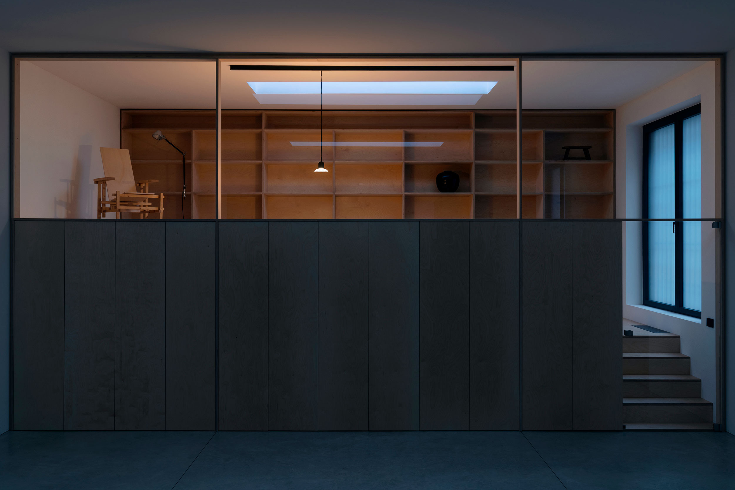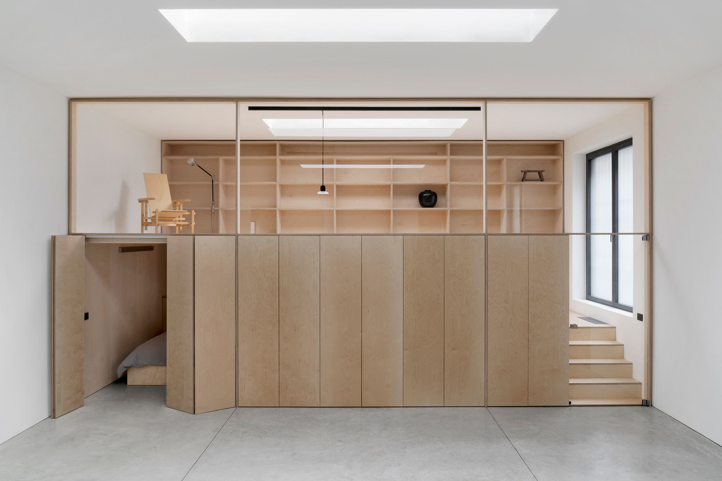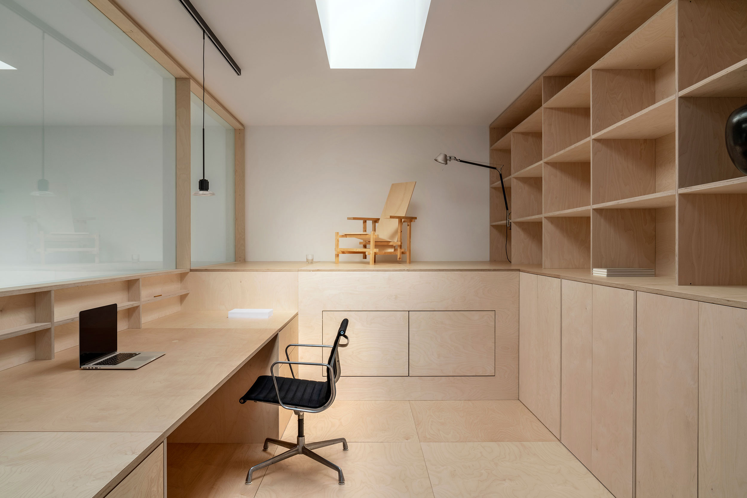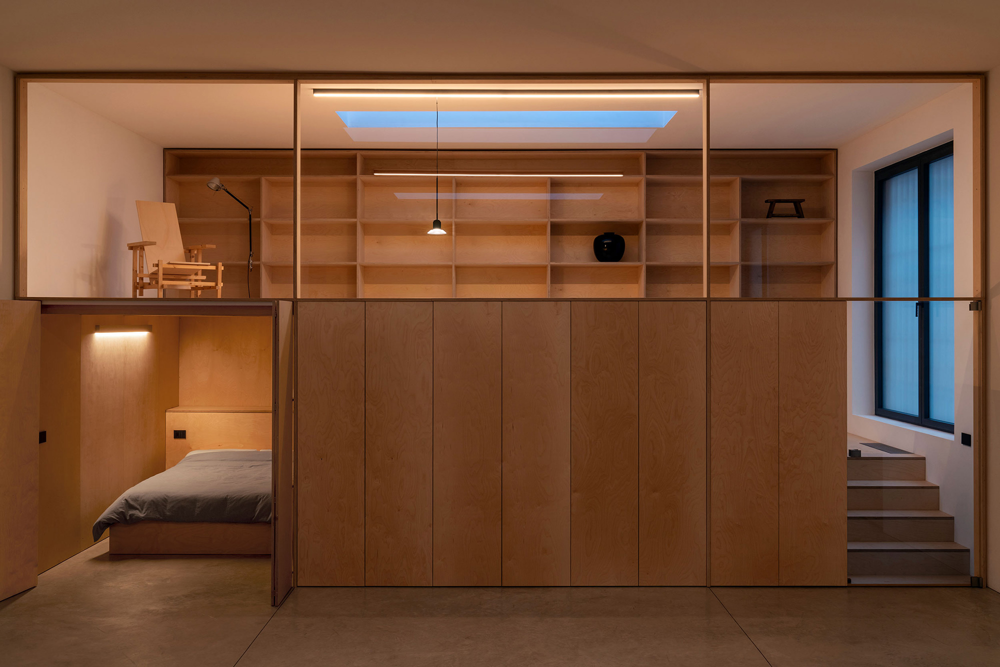 The size of the birch plywood, modular office walls and modules determined the final design, which boasts a dynamic pattern with 1-meter wide components split into single, double, or triple sections. A transparent glass door intentionally punctuates the solid plywood volume to frame the stairs and the window. The front doors hide the programs and distribution of the private areas. This modular office comprises both live and work areas. It houses a concealed bedroom on the lower level, and a work area and library on the upper floor. Both levels contain a series of mobile, flexible storage units and shelving which optimize the function. The designer made the most of every inch of space, integrating storage areas within every piece of modular office furniture. A skylight brings more natural light into the structure.