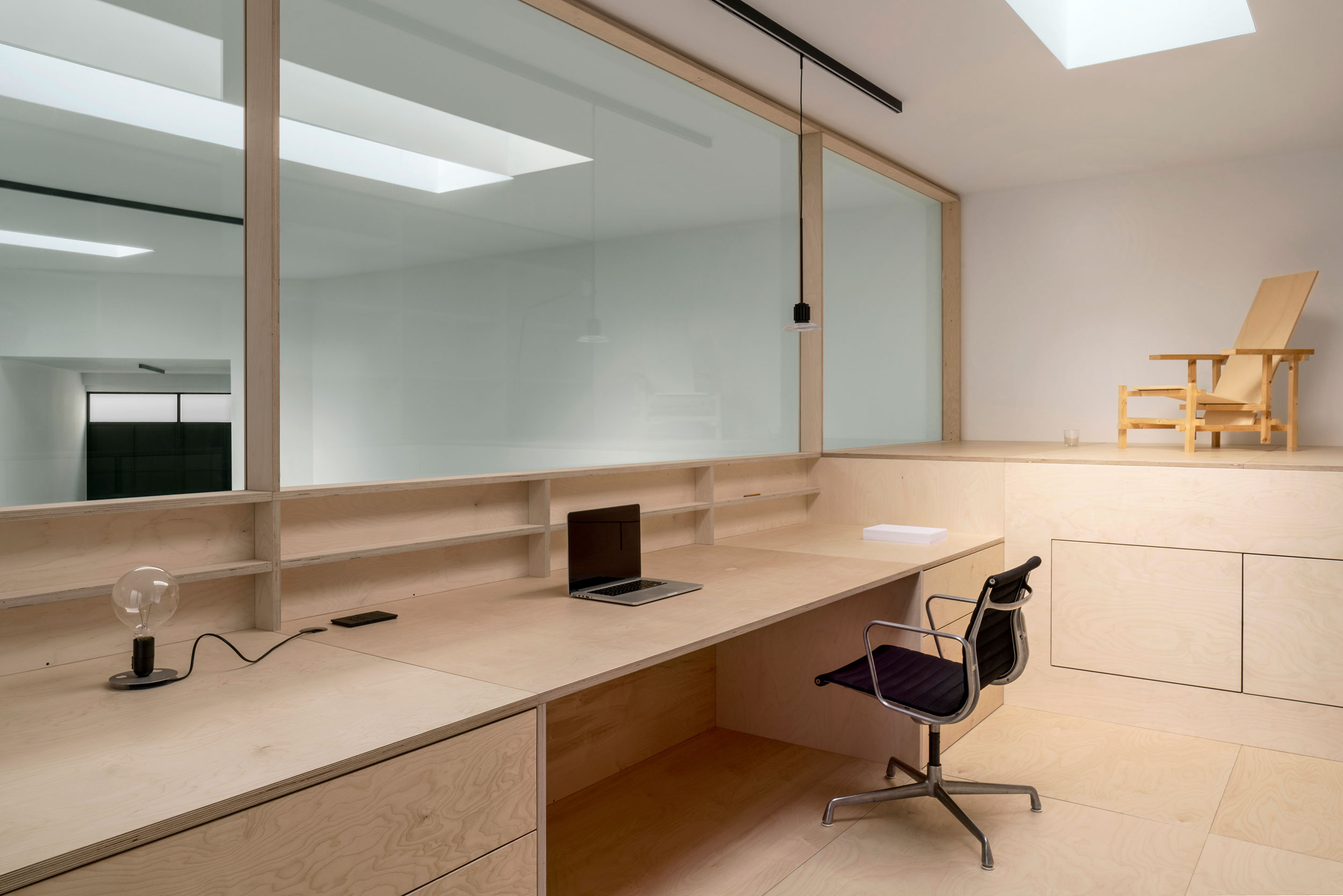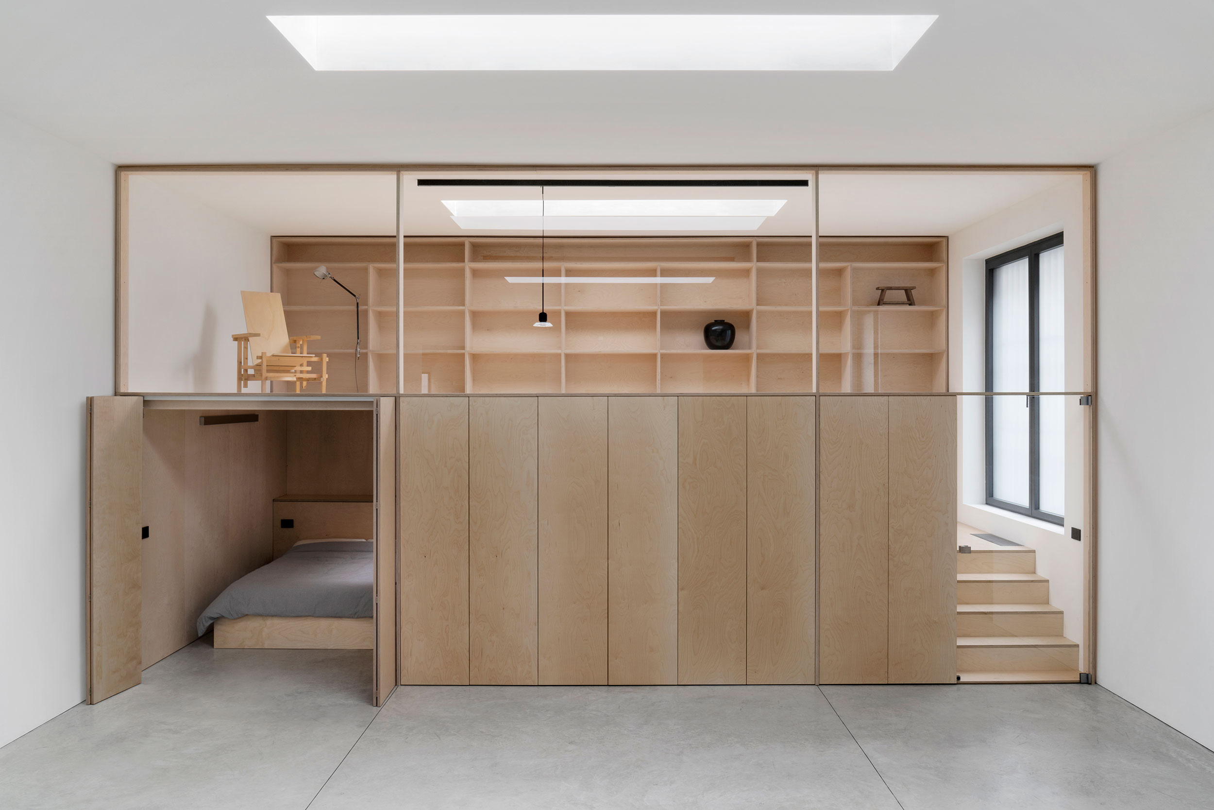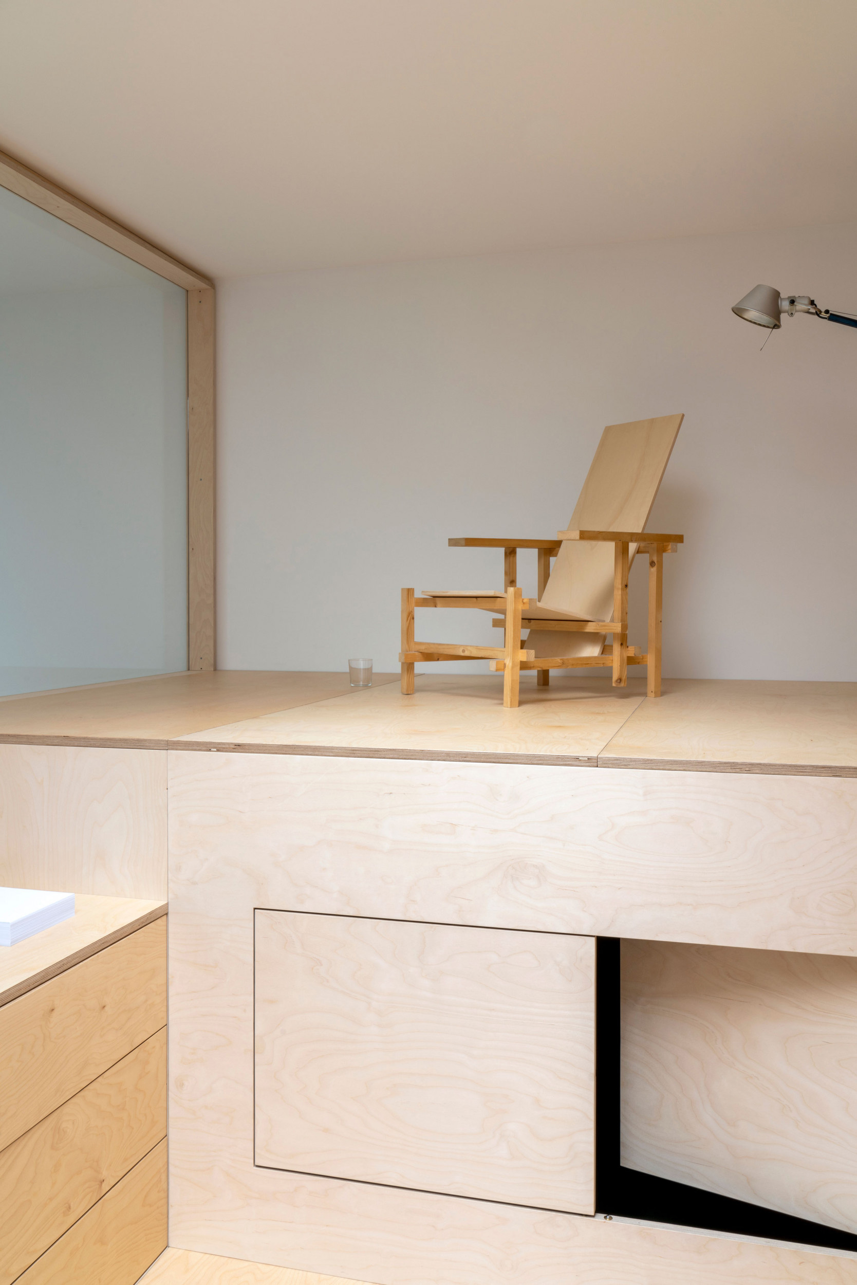 The size of the birch plywood, modular office walls and modules determined the final design, which boasts a dynamic pattern with 1-meter wide components split into single, double, or triple sections. A transparent glass door intentionally punctuates the solid plywood volume to frame the stairs and the window. The front doors hide the programs and distribution of the private areas. This modular office comprises both live and work areas. It houses a concealed bedroom on the lower level, and a work area and library on the upper floor. Both levels contain a series of mobile, flexible storage units and shelving which optimize the function. The designer made the most of every inch of space, integrating storage areas within every piece of modular office furniture. A skylight brings more natural light into the structure.
