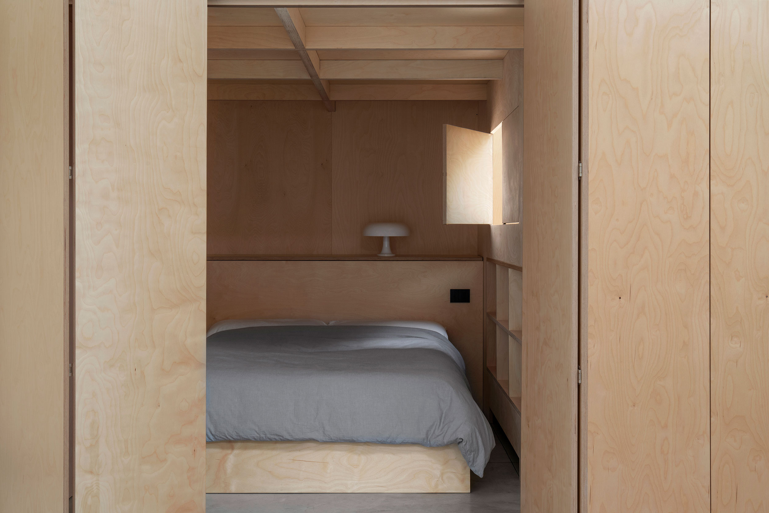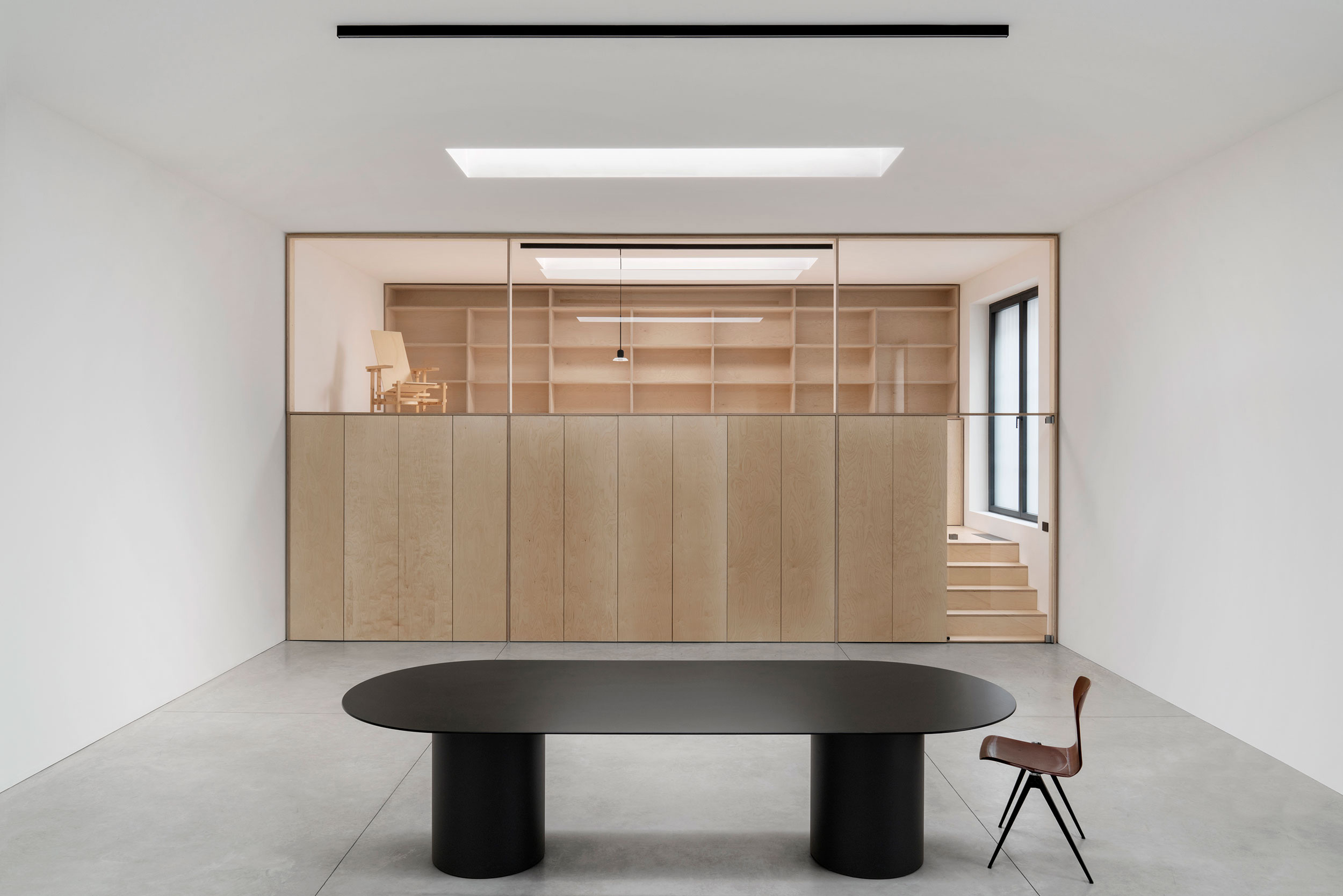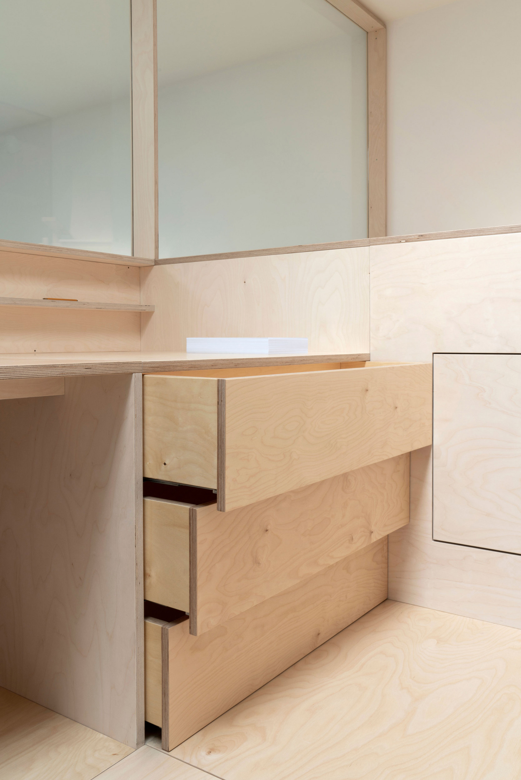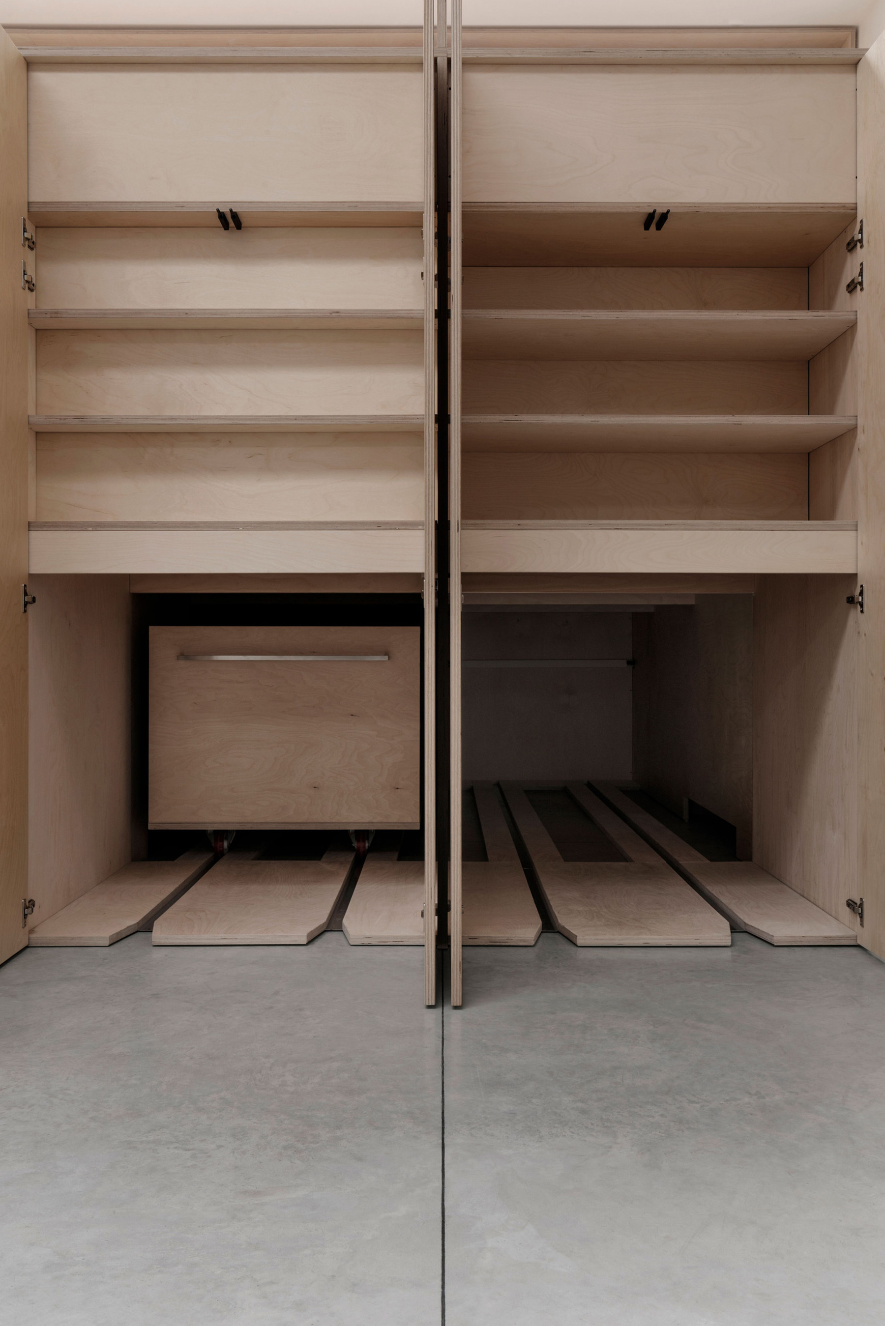 The size of the birch plywood, modular office walls and modules determined the final design, which boasts a dynamic pattern with 1-meter wide components split into single, double, or triple sections. A transparent glass door intentionally punctuates the solid plywood volume to frame the stairs and the window. The front doors hide the programs and distribution of the private areas. This modular office comprises both live and work areas. It houses a concealed bedroom on the lower level, and a work area and library on the upper floor. Both levels contain a series of mobile, flexible storage units and shelving which optimize the function. The designer made the most of every inch of space, integrating storage areas within every piece of modular office furniture. A skylight brings more natural light into the structure.