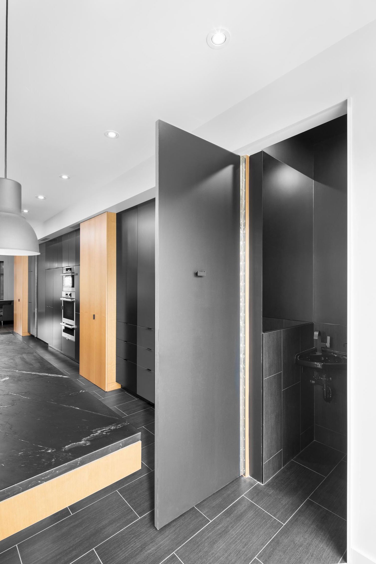 With an island at its heart, the kitchen is the central part of the home. Naturally lit by the windows and skylight, the soothing space beckons one to spend time cooking during the day. The aesthetic is appealing as well. Dark soapstone countertops and brightly veneered wooden cabinets contrast with one another, while the lacquered black and gray pantry doors bring the design together in harmony. Who wouldn’t want to take the time to cook in a space like this?