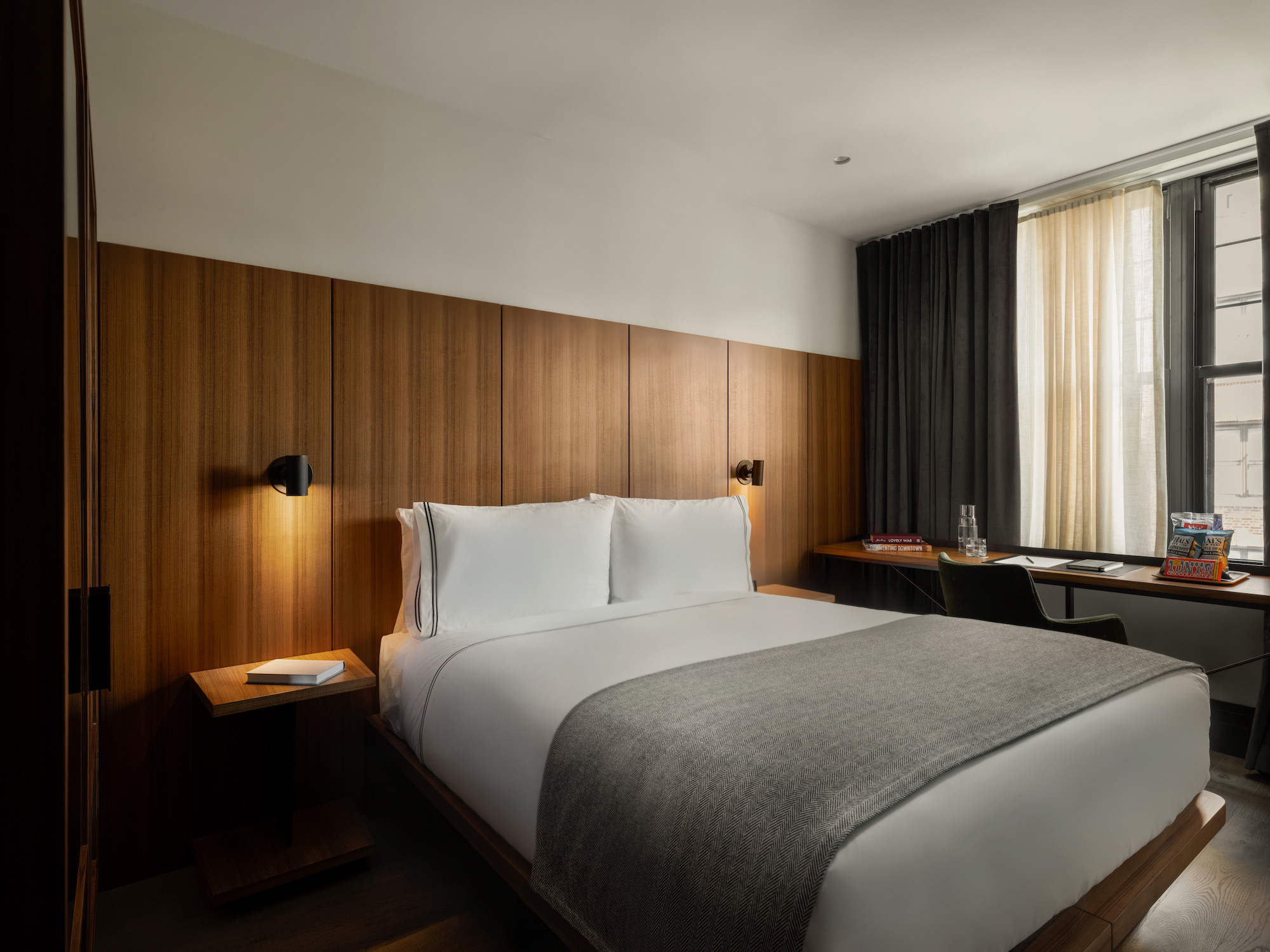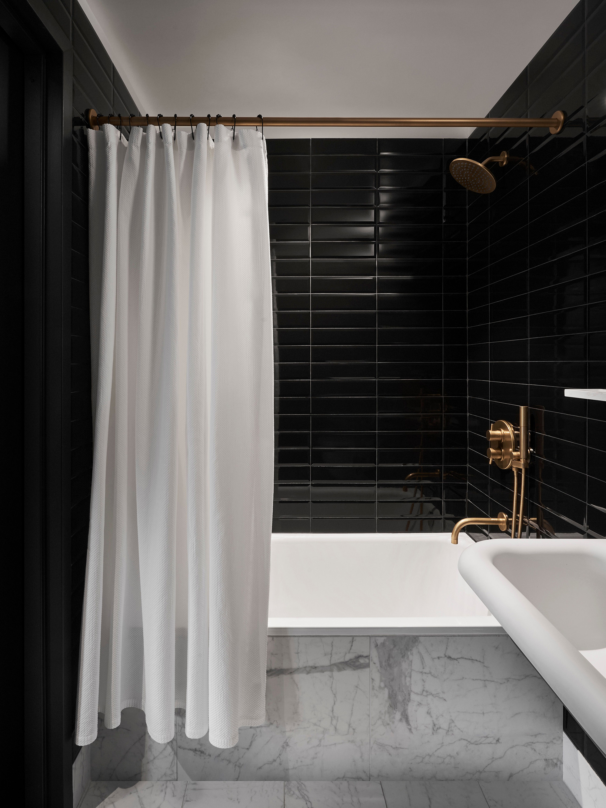 Darker hallways lead to the bright and welcoming rooms. Teak wall panels and wood furniture and flooring add an organic counterpoint to clean white walls and black curtains. Desks also provide a comfortable space to work, if needed. While all of the rooms immerse guest in the neighborhood and bustling atmosphere of the city, the corner Queen rooms stand out as they open to views of the Empire State Building. The bathrooms boast glossy black tiles on the walls as well as golden matte brass accents. This play between light and dark, lustrous and matte appears throughout the hotel.