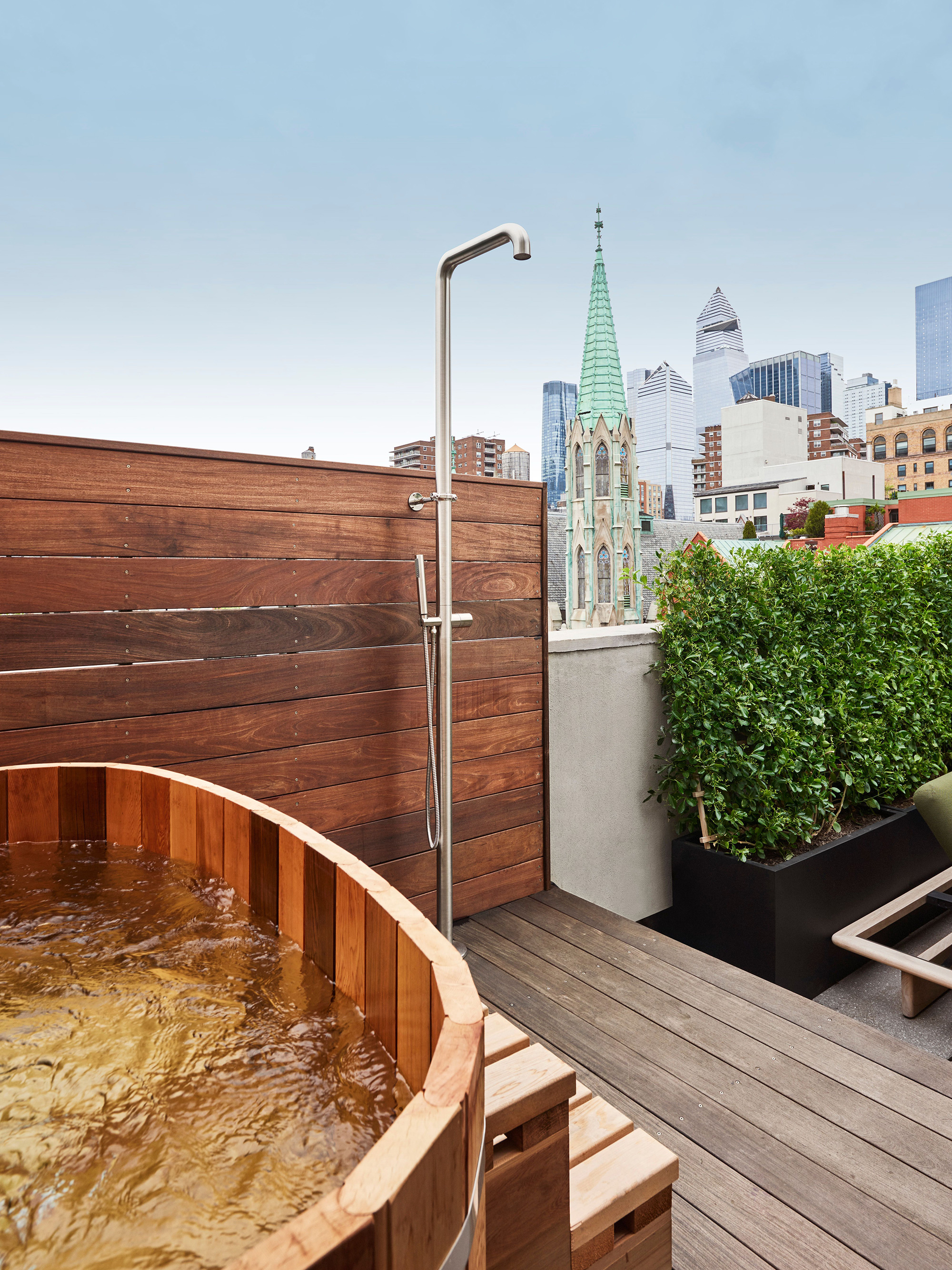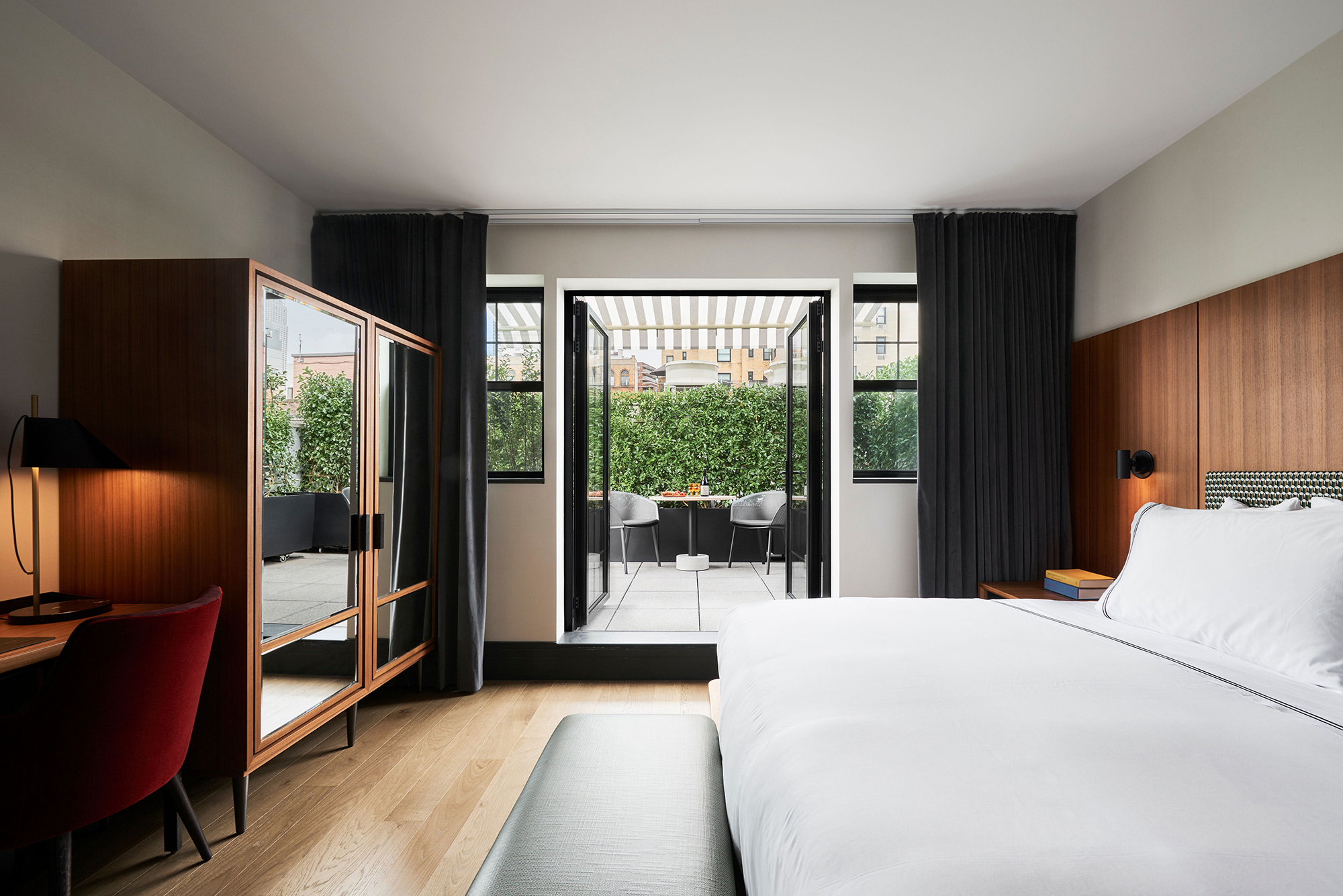 On the ground floor, there’s a café that serves locally sourced coffee in a lounge area. The Moore Hotel also has a rooftop wine bar called Moore Wine, which opens during the warmer seasons. Here, guests can enjoy a glass of wine or a cocktail while admiring the iconic NYC skyline. Finally, they can make the most of their stay by exploring the neighborhood. Apart from the Foragers Market located nearby, the area also offers easy access to theaters, galleries, parks, and sustainability-focused restaurants. Photographs © The Moore.