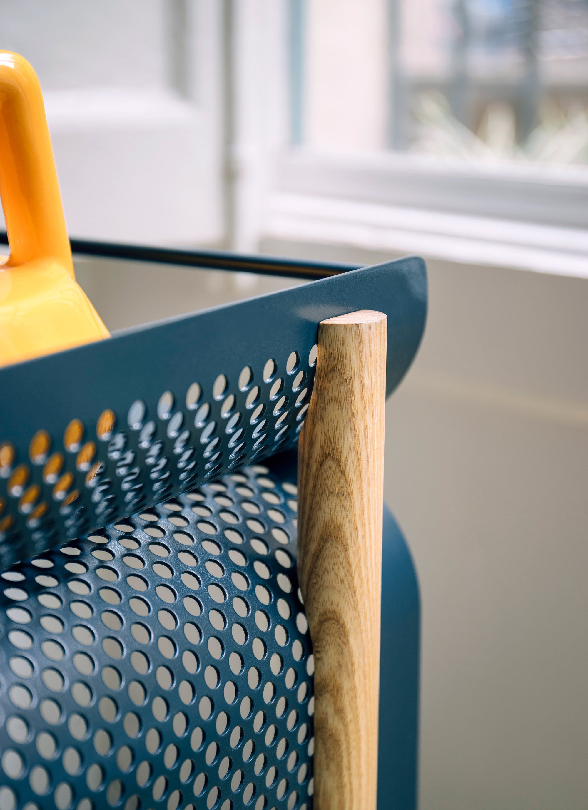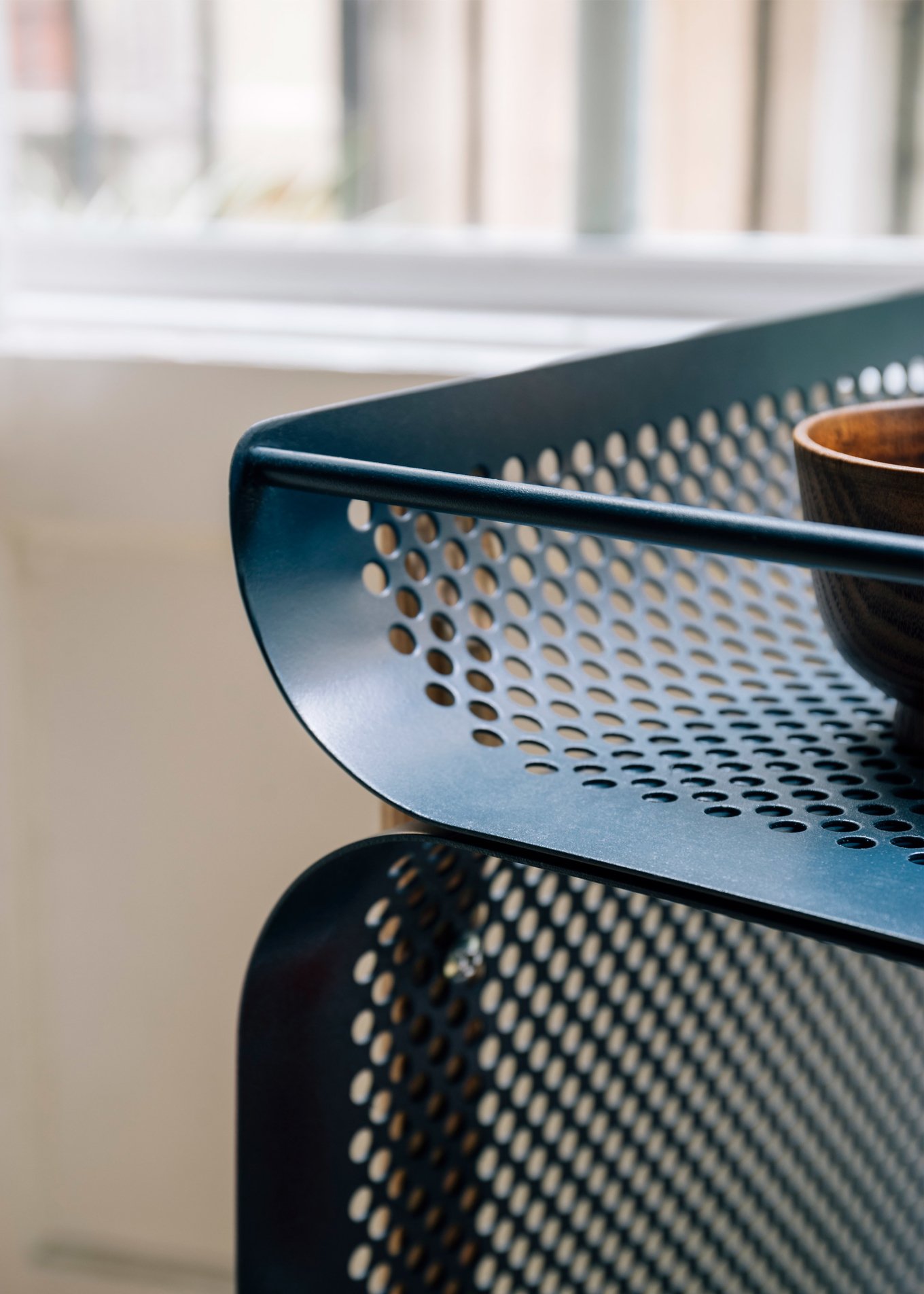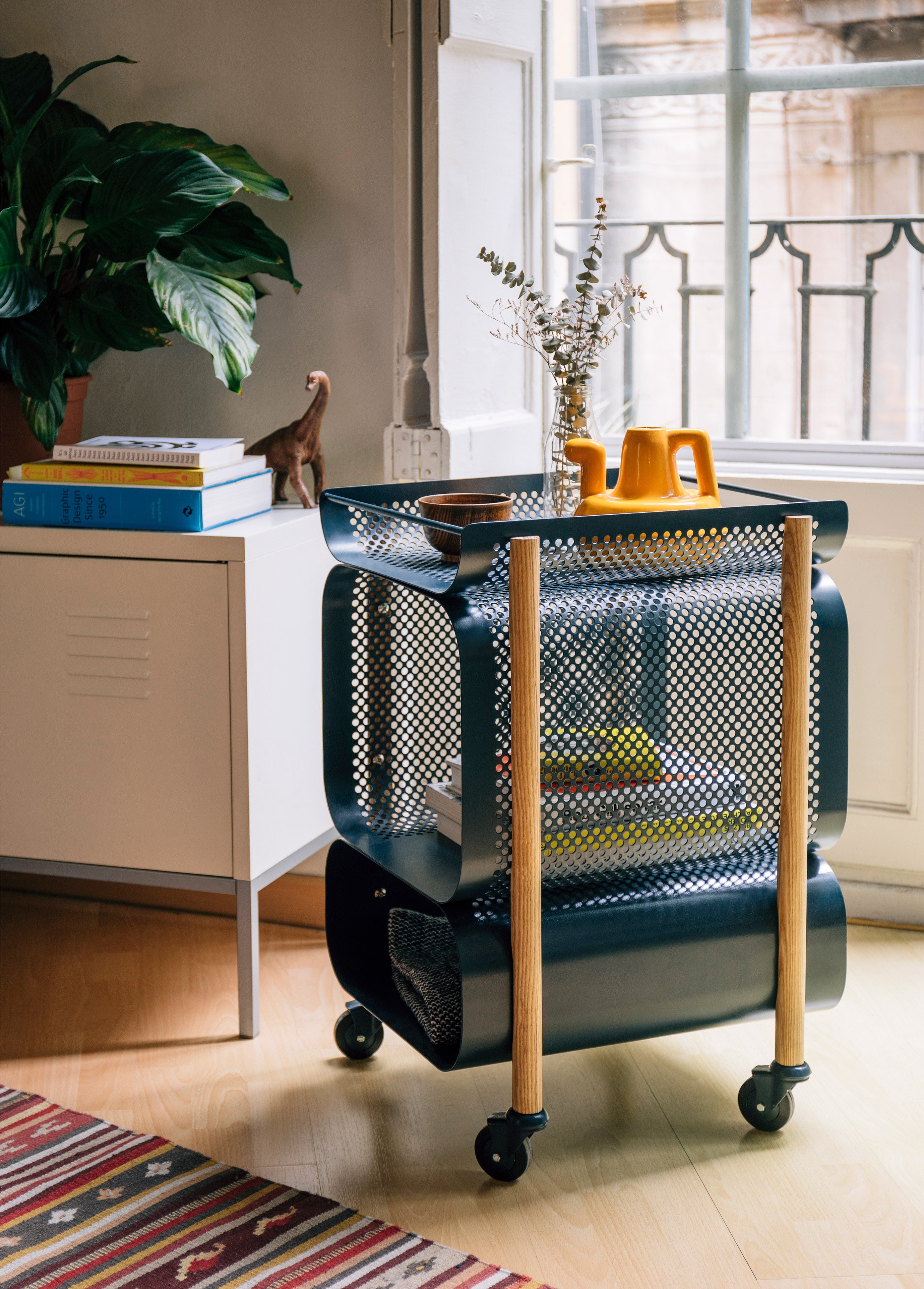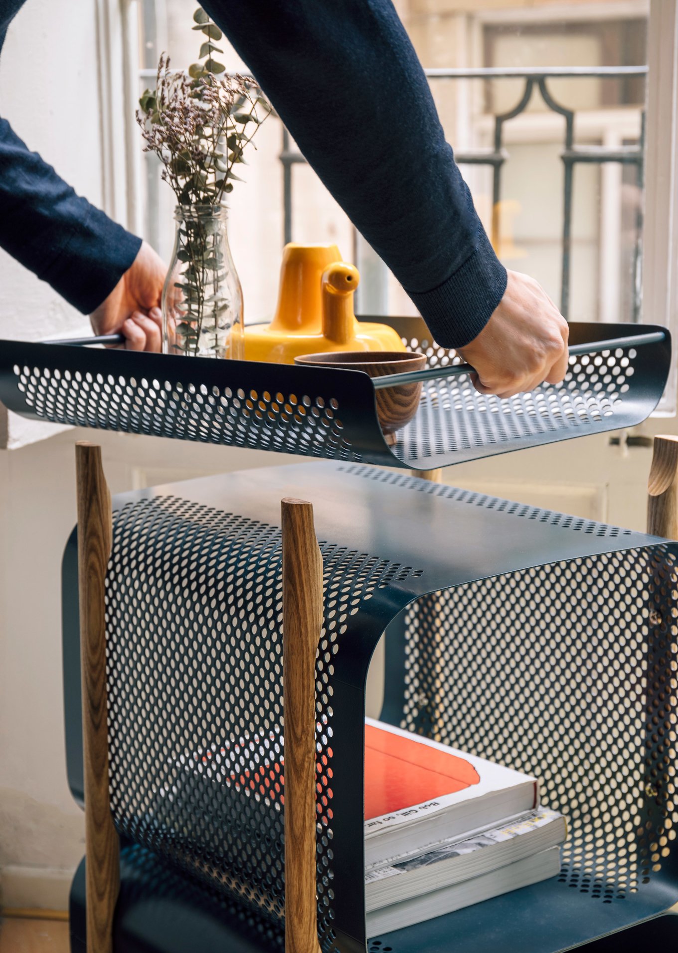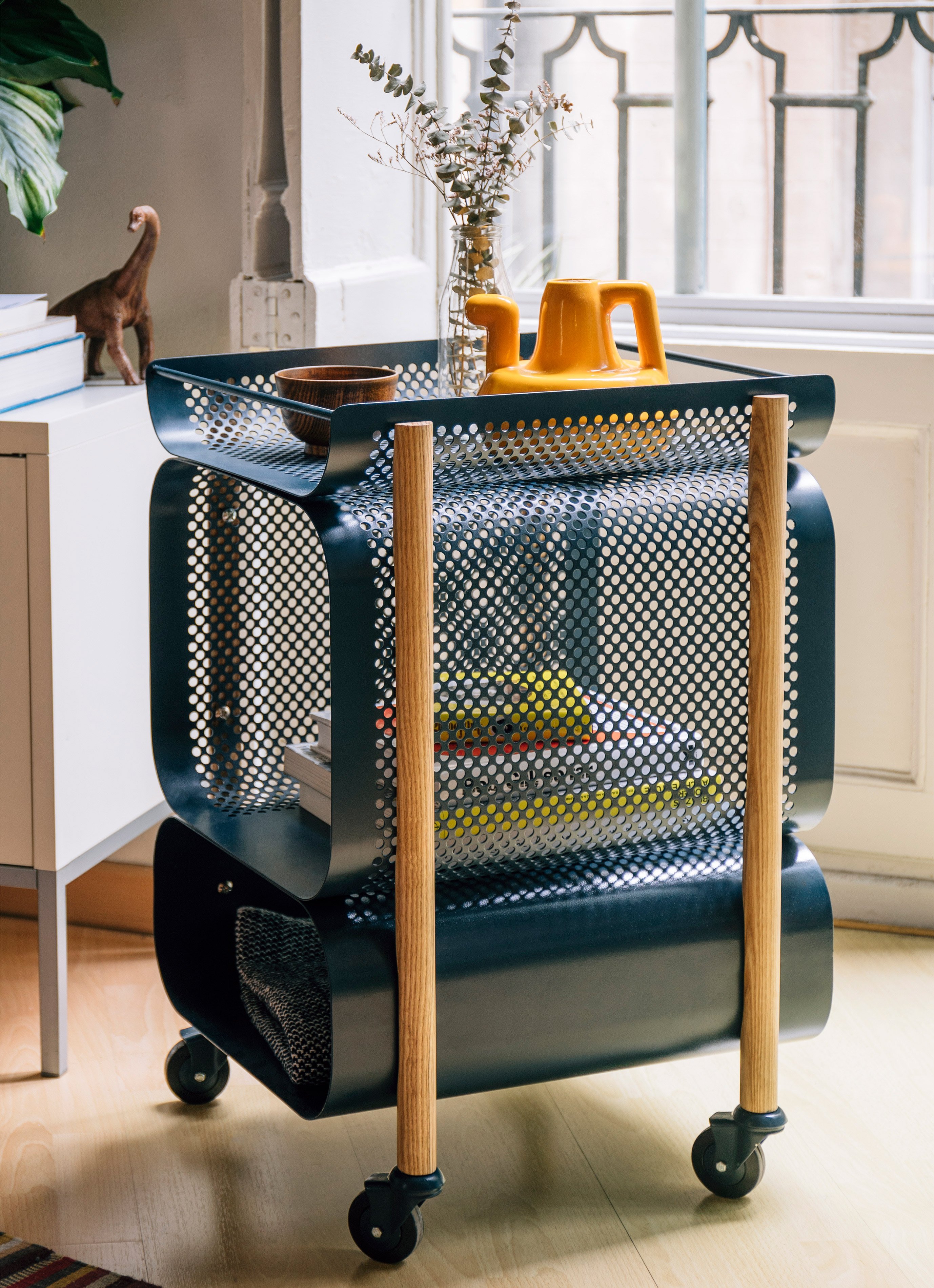 The laser cut and drilled steel plates have a dark blue color that accentuate the industrial aesthetic. Four solid wood legs connect the plates and provide stability, but also give a warmer accent to the design. The two compartments offer generous storage space. The lower section hides objects from view, while the upper compartment allows users to see the contents at a glance. The removable tray at the top and the four wheels enhance the functionality of the cabinet further. Photo credits: Gravina.