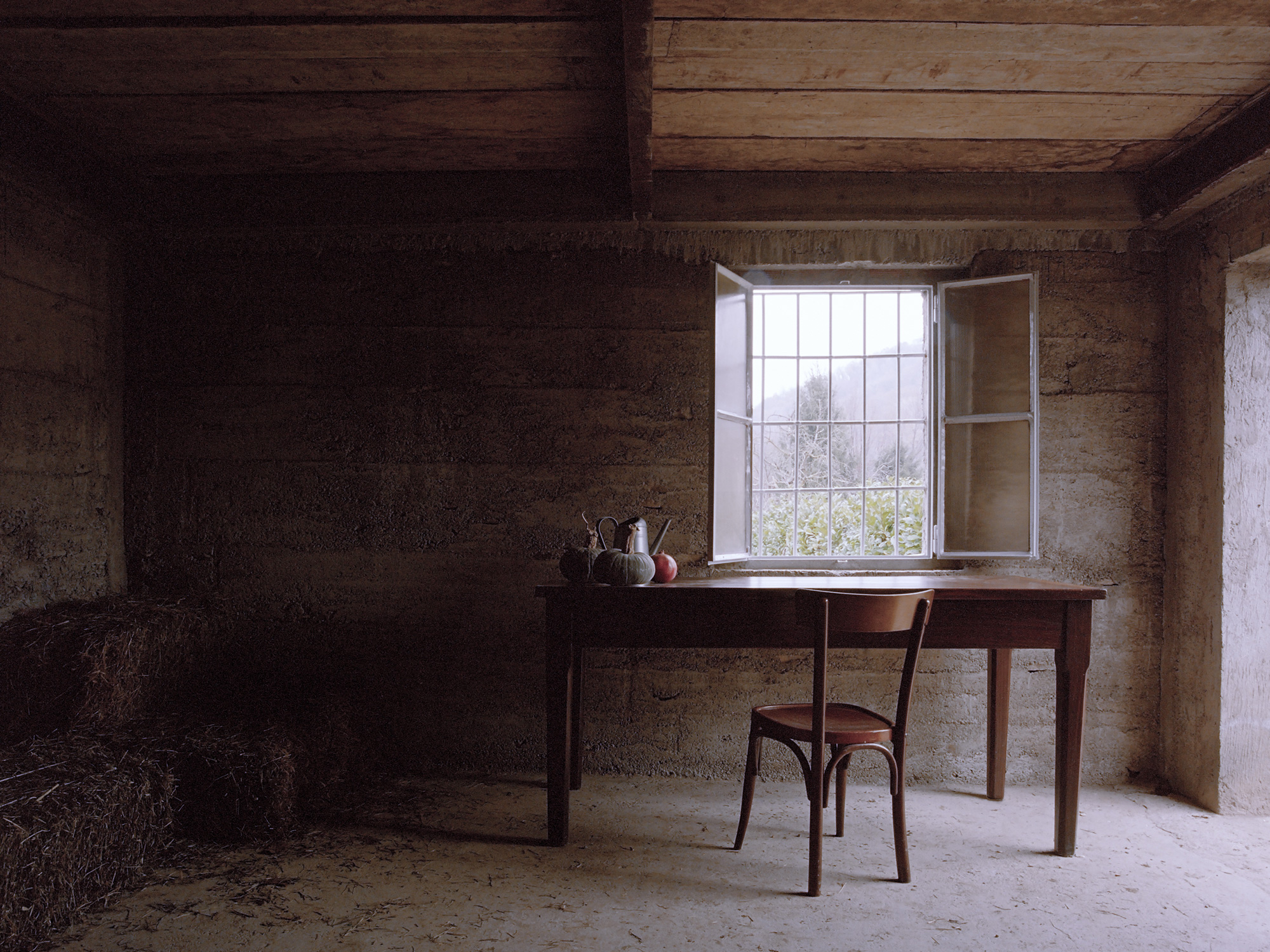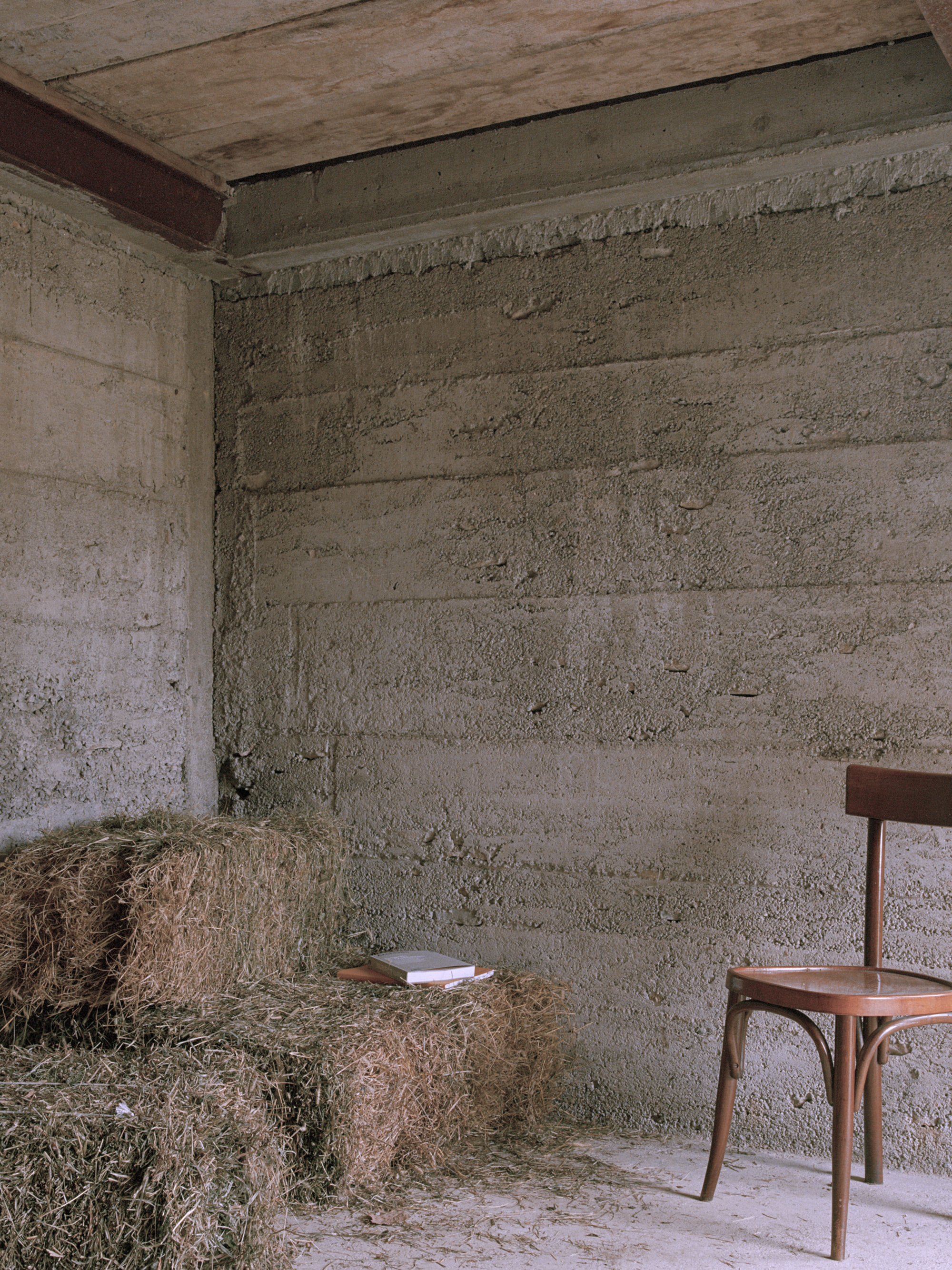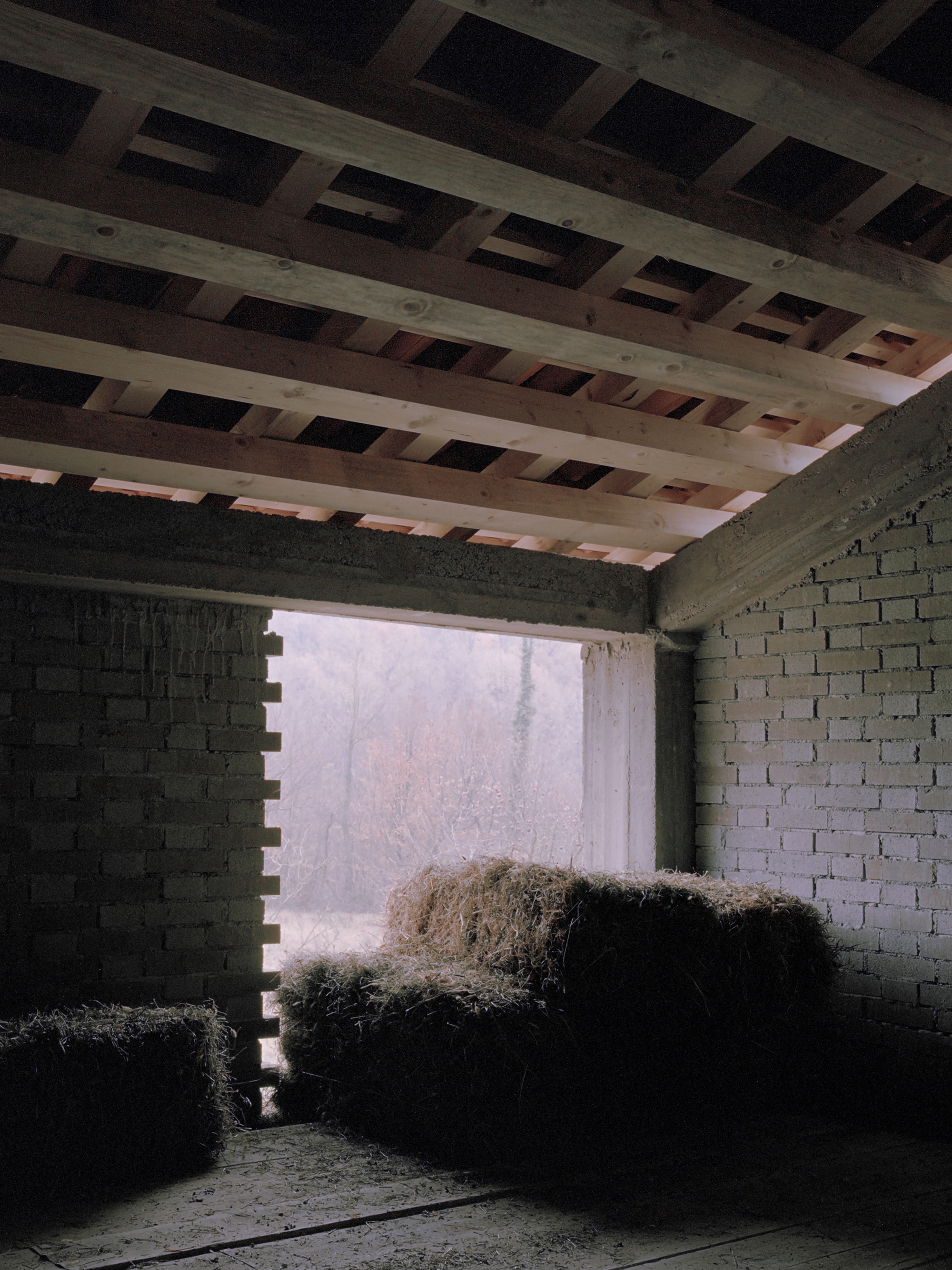 As the owner wanted to have a storage area upstairs, the architects designed a rectangular opening that allows bales of hay to dry. The upper floor also houses a storage space for agricultural equipment. On the ground floor, there’s a seating area where the owner spends most of his time; from here, he also engages passers-by in conversation. The entrance has direct access to the path in the front of the building. As a result, the structure acts as practical storage on one hand and as a comfortable, welcoming and convivial refuge on the other. In front of the table and chairs, a large window frames the rural landscape.