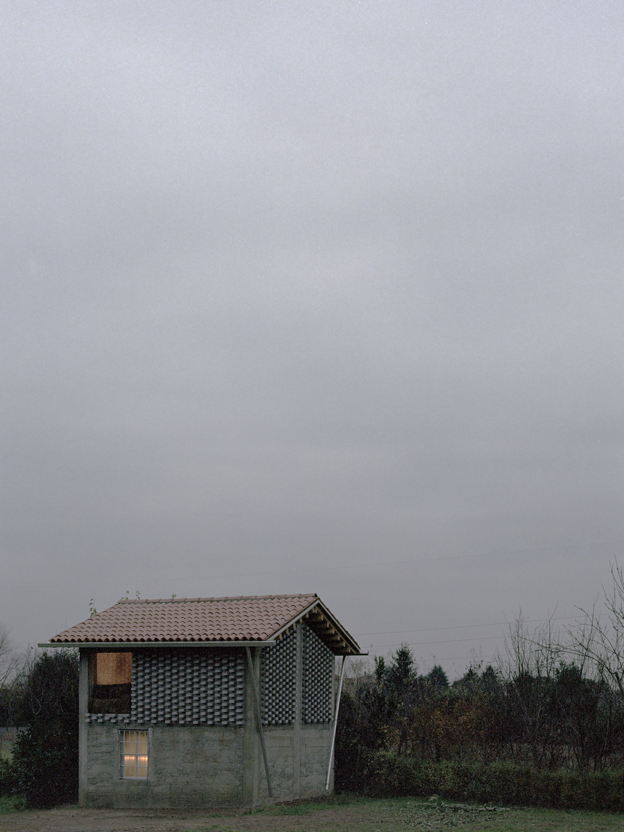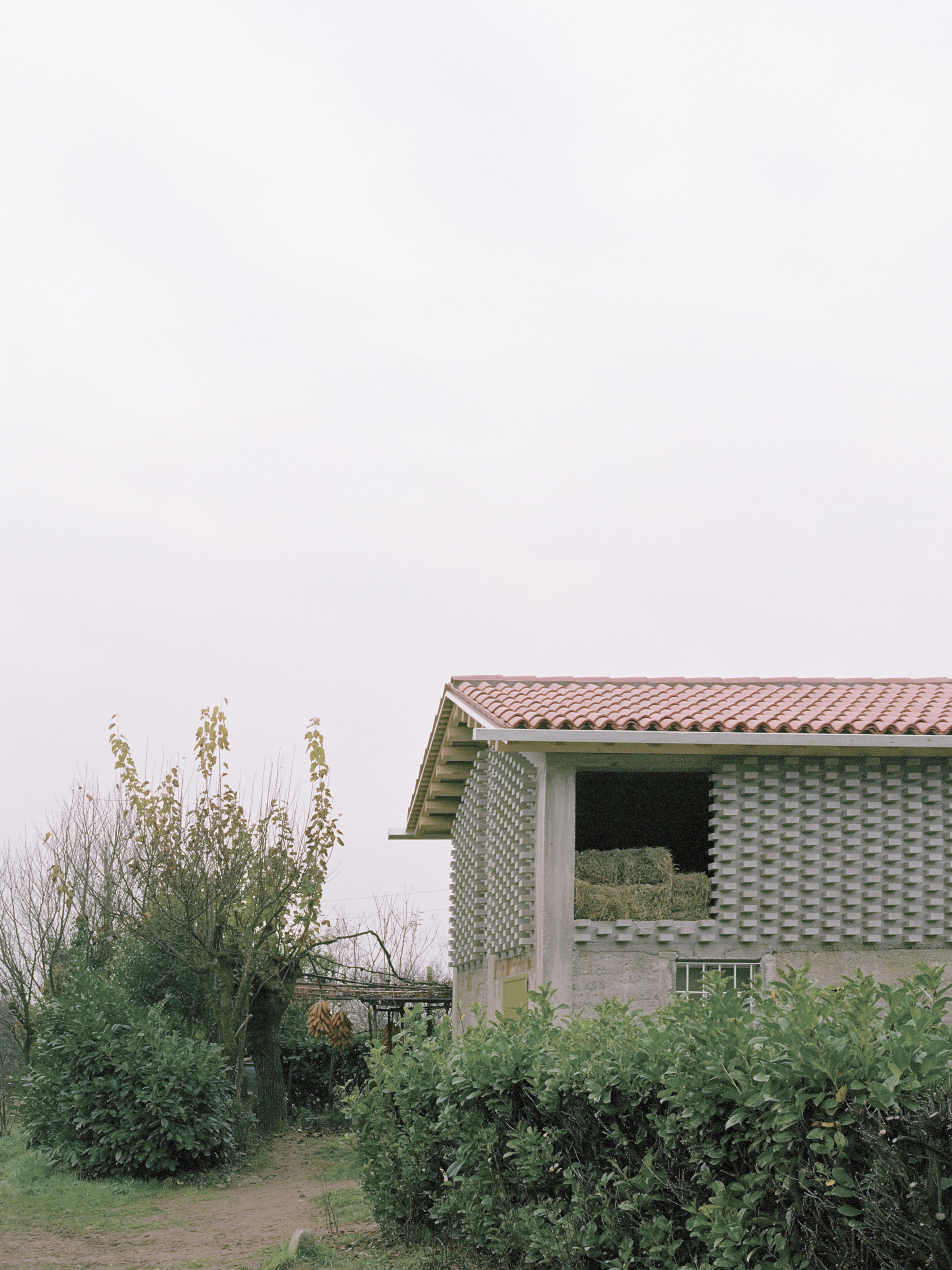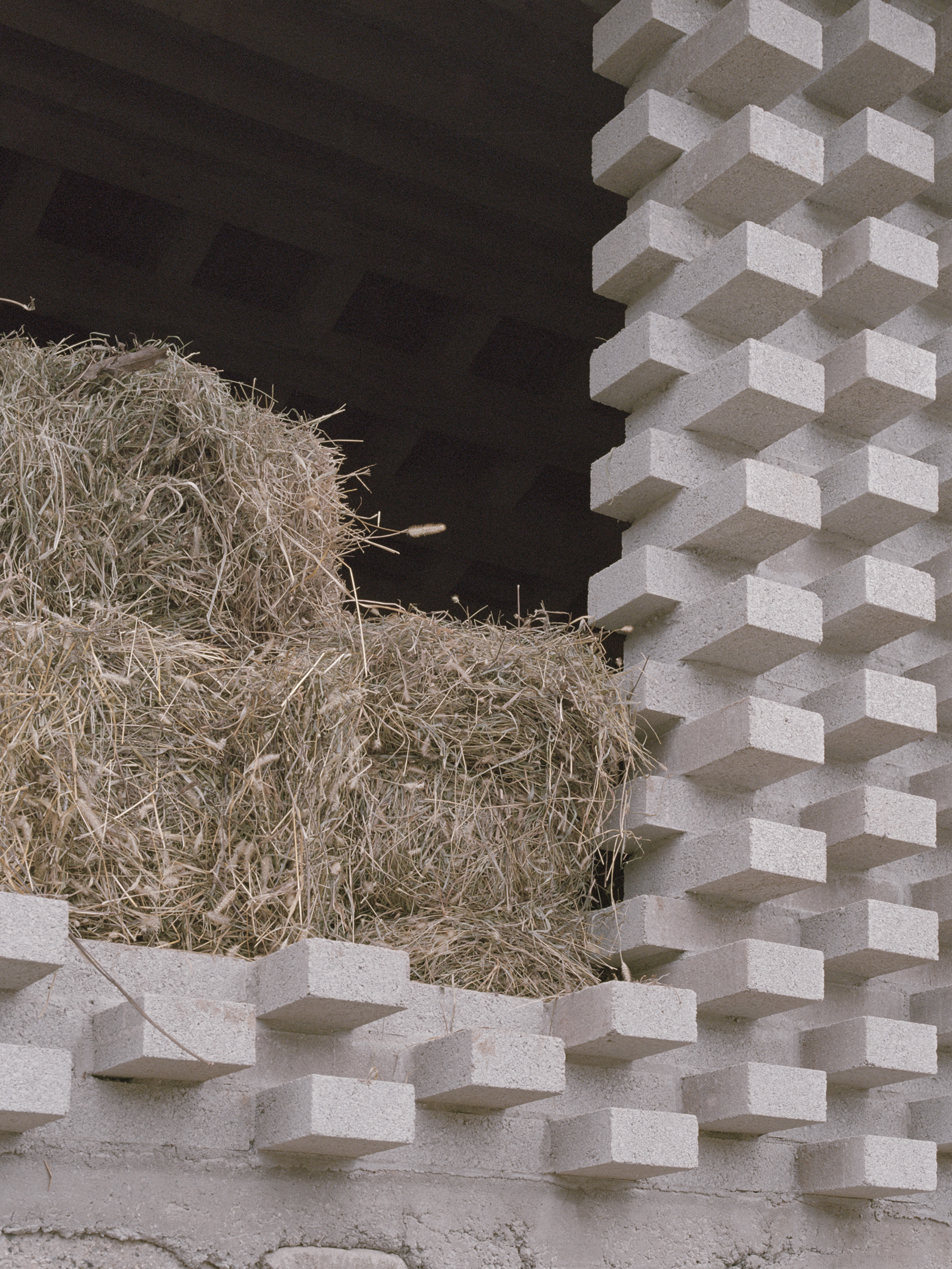 As the owner wanted to have a storage area upstairs, the architects designed a rectangular opening that allows bales of hay to dry. The upper floor also houses a storage space for agricultural equipment. On the ground floor, there’s a seating area where the owner spends most of his time; from here, he also engages passers-by in conversation. The entrance has direct access to the path in the front of the building. As a result, the structure acts as practical storage on one hand and as a comfortable, welcoming and convivial refuge on the other. In front of the table and chairs, a large window frames the rural landscape.
