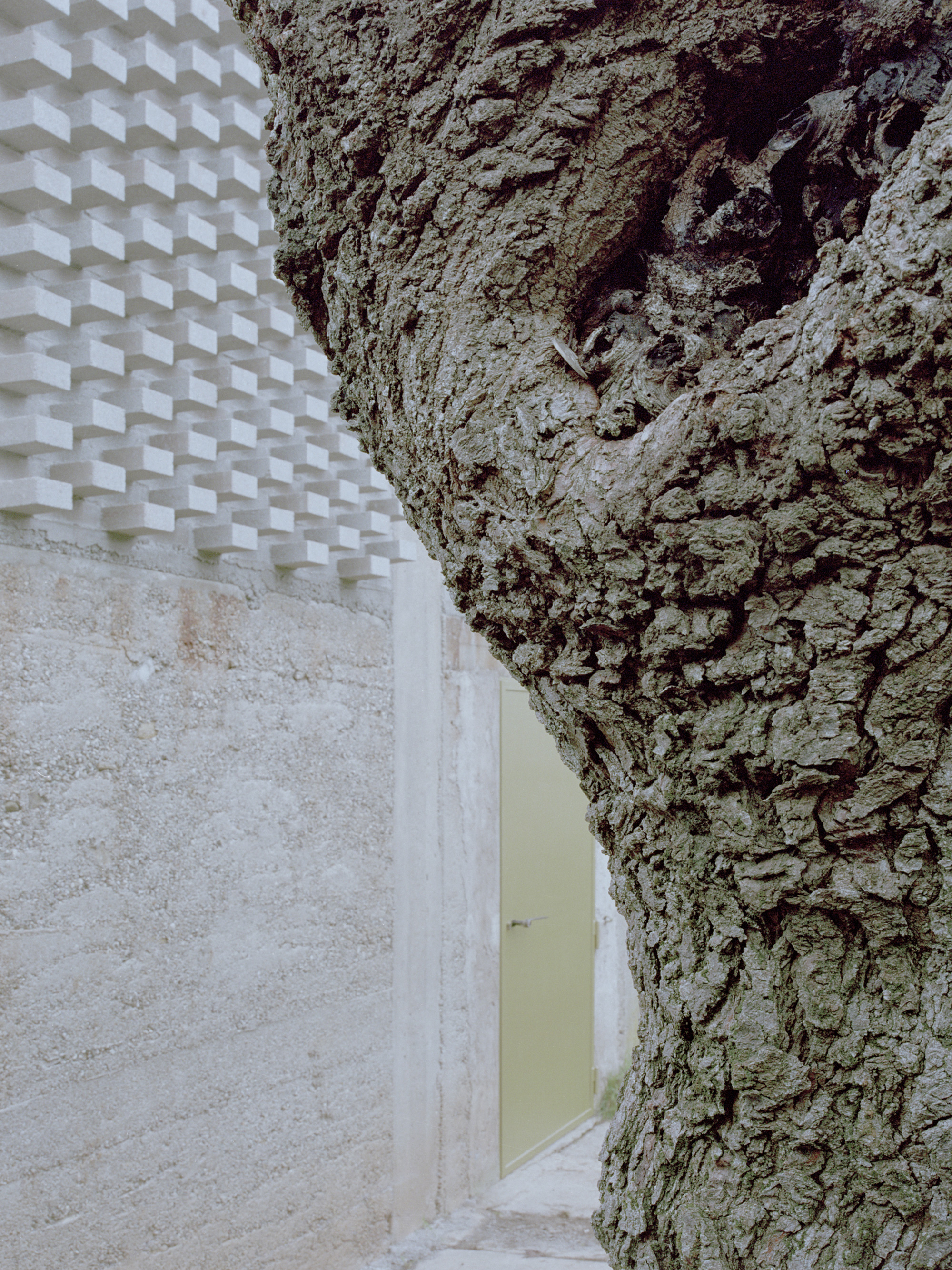 Located in Montevecchia, in the province of Lombardy, Italy, The Mulberry Refuge (Il Rifugio del Gelso) is a building with a strong connection to the area’s history. Architecture firm a25architetti completed the project with a thoughtful design approach. Used since the early 1900s for silk production, and thus filled with mulberry trees, the area now features only pastures, corn crops, and hay meadows. A few mulberry trees remain, one of them growing right in front of the refuge. The studio renovated the old agricultural building and removed any poor-quality materials used over the years in conversion projects. The removal of these materials uncovered the original design of the building, a minimal structure made of rough cement. While the ground floor boasts raw cement walls, the upper level features cement brick walls with a distinctive texture.