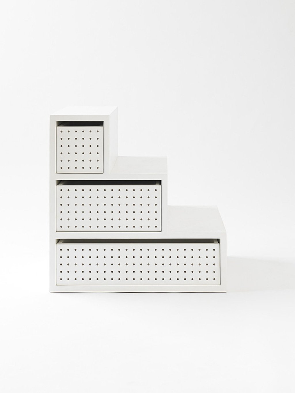 Made in Brooklyn by Thing Industries, the Indoor Stoop is a shelf and step ladder for climbing, seating, and storage. The versatile piece of furniture can be used by people or pets. Minimally designed in white, the stoop features strong siding and perforated pegboard drawers. Any other decoration is up to the user to imagine.