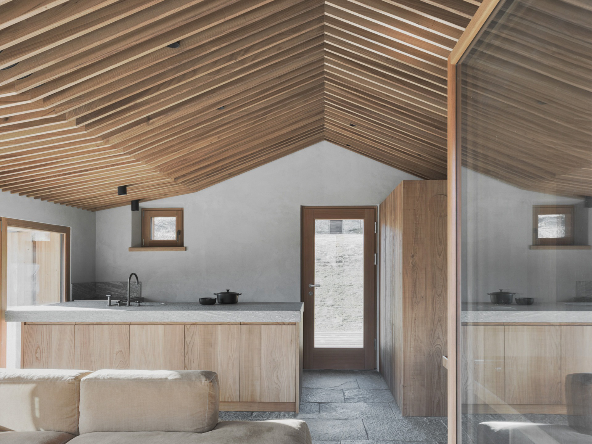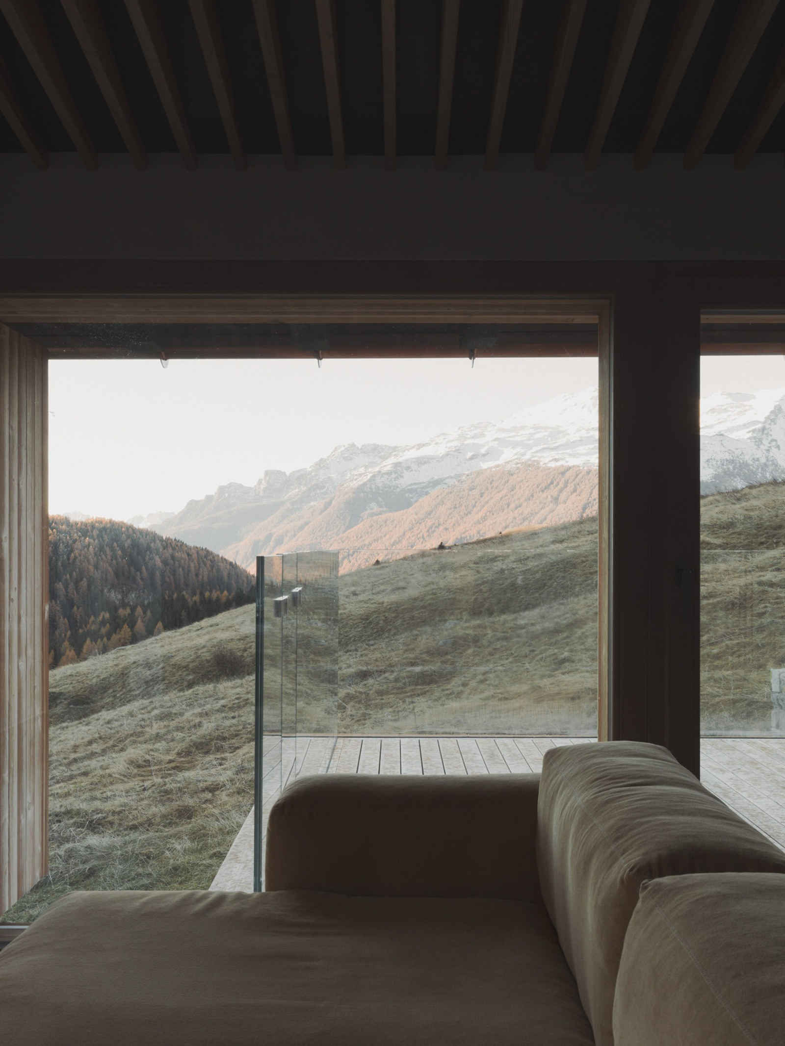 To preserve the character of the old stone and wood building, the studio designed a system of wooden shutters that match the wood cladding. The new, large windows provide fantastic views of the Italian Alps on the upper level. Two new extensions on the south and north sides of the dwelling expand the living spaces. At the same time, they preserve the identity of the original design. The new volumes have a subtle design and a compact size; here, the studio added the private sleeping areas that have a more intimate atmosphere and also open to curated views.