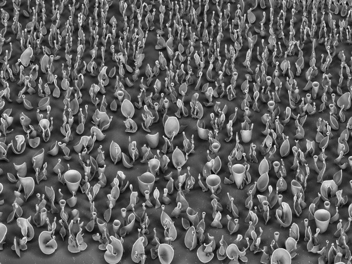 No soil is needed for these flowers; instead, substitute earth for sodium silicate to grow these crystal flowers. Lovingly tended to by Harvard University scientist Wim Noorduin, these nano “flowers” are crystalline structures that have been formed and colored by chemical processes. By changing the temperature, pH, and carbon dioxide of the petri dish planters, Noorduin is able to grow intricate, delicate, and microscopic fields of blooms. Though the process isn’t revolutionary by scientific means, the transplantation of a common tool in crystal growth research to an artistic application is Noorduin’s noteworthy discovery. The curled crystal petals of the brilliantly red flower that represents Noorduin’s first is a treasure indeed, one whose beauty is only visible to those who look for it – that is, through a microscope.