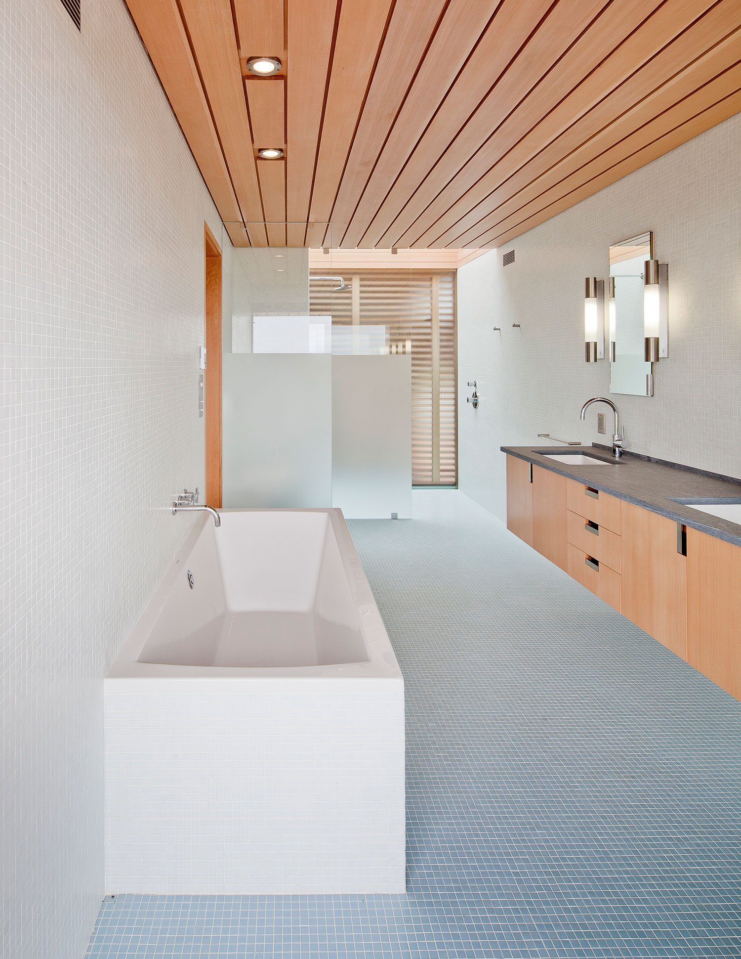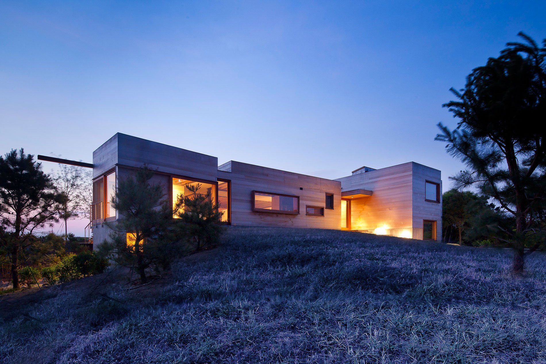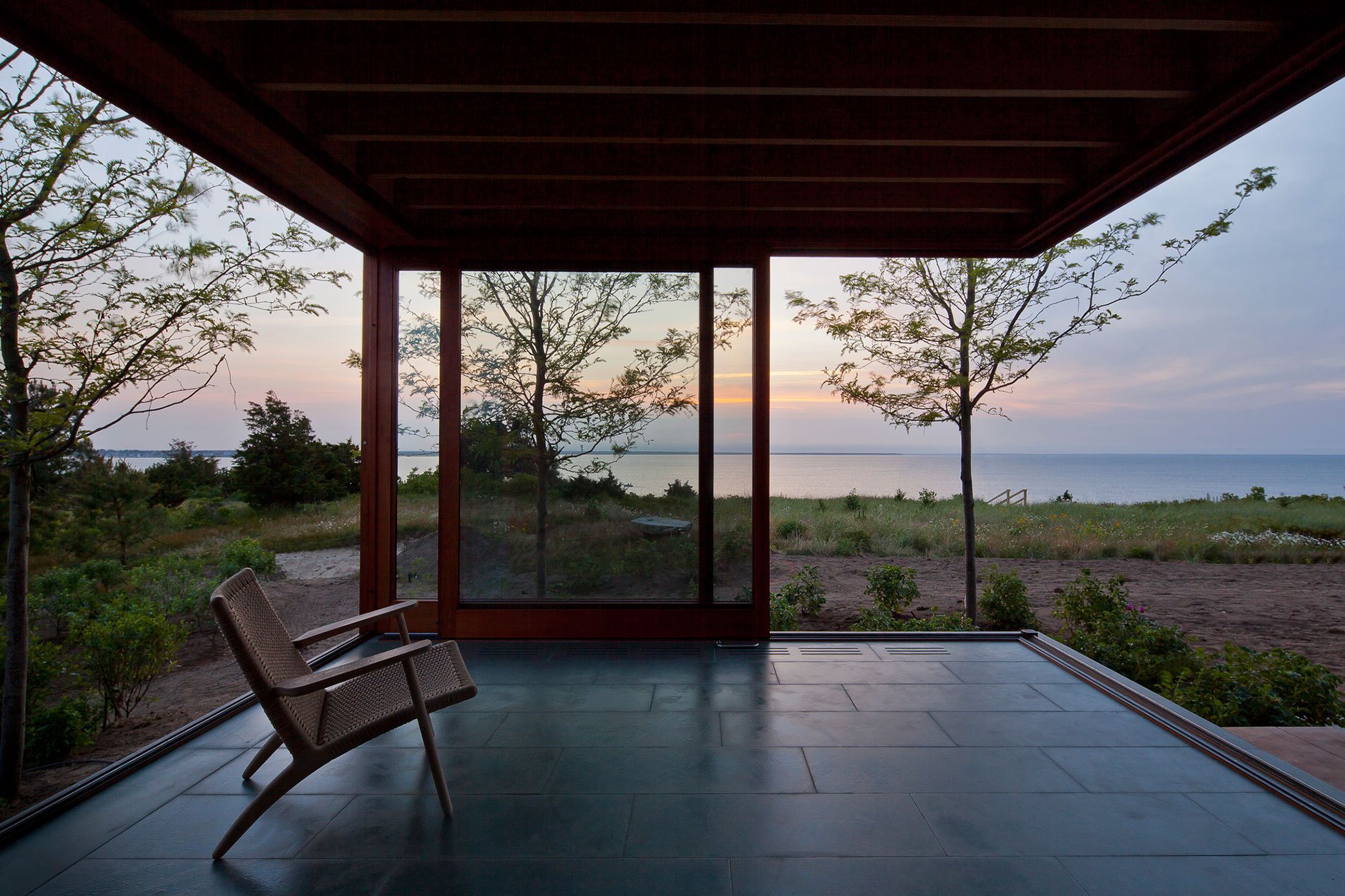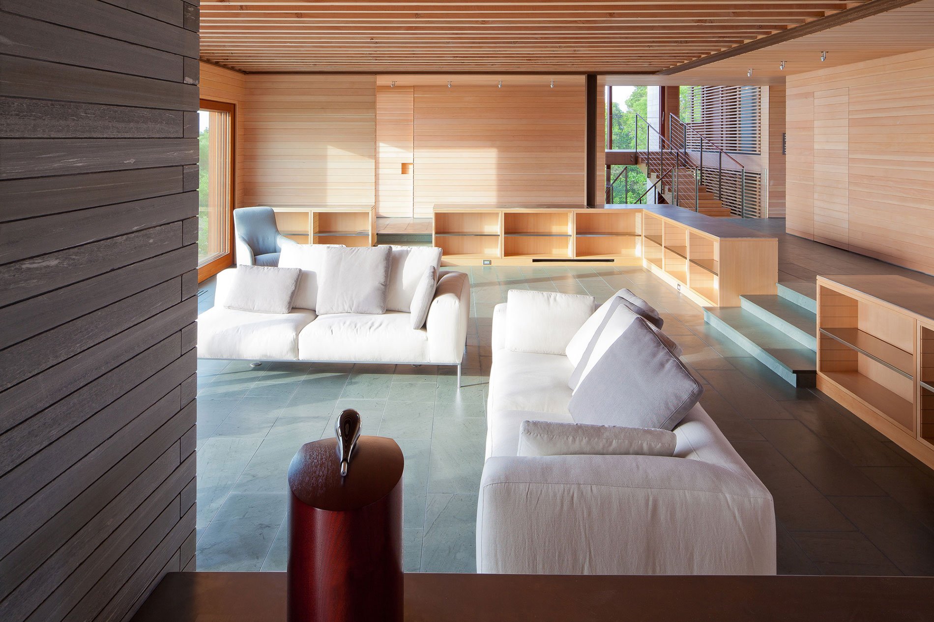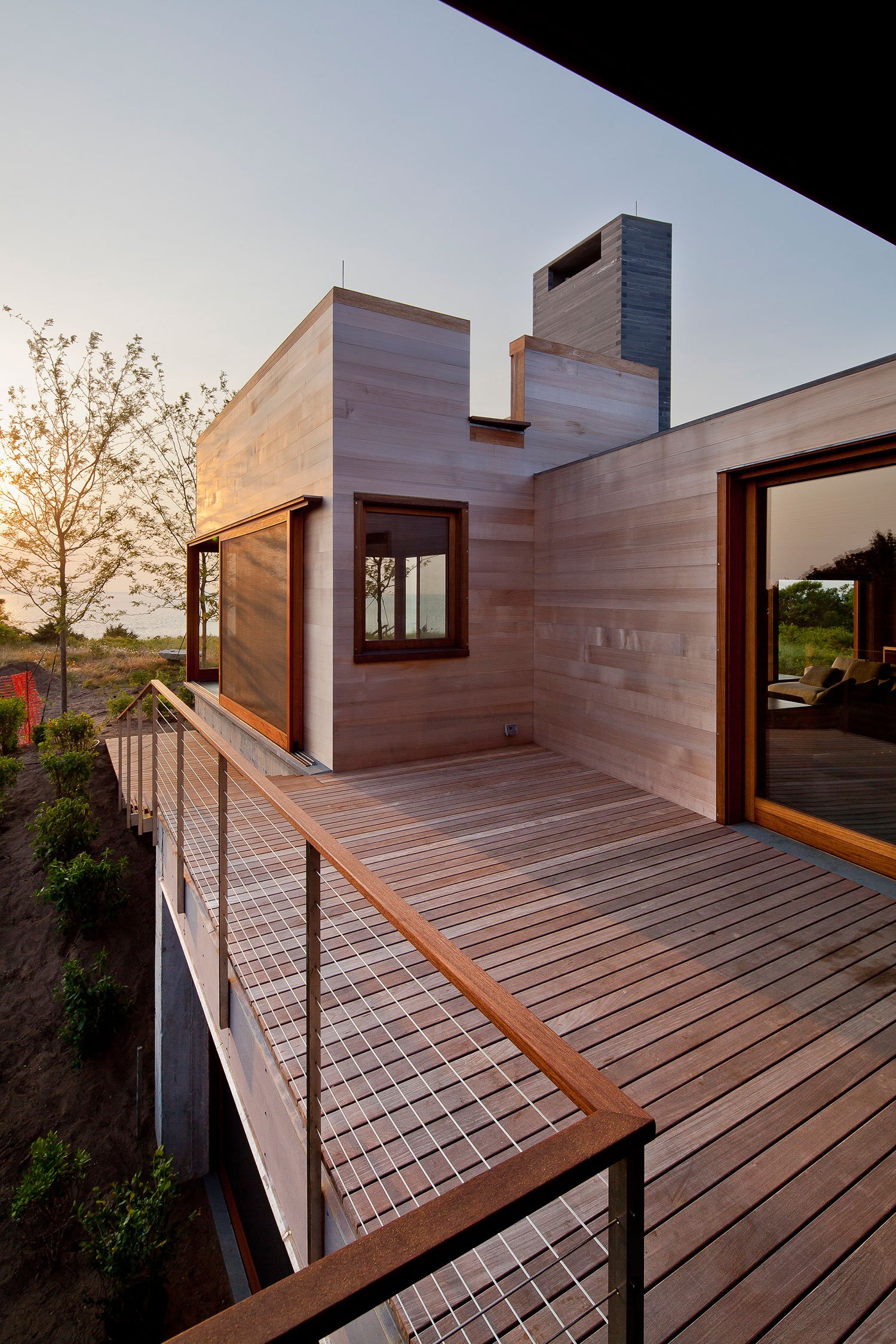 Designed by Peter Rose + Partners, this summer home on the island of Chappaquiddick near Edgartown, MA considers both massing and the existing context to enforce and embrace its secluded site. Replacing an older home and driveway, this new construction consists of a main house, a garage, a storage shed and a small boathouse. Starting by rethinking the approach to the house, the new driveway has been designed to incorporate into the home’s narrative. Instead of a straight shot through a meadow, it twists and turns through an oak and pine forest (with a path that won’t damage existing trees) so that the cars and road seem to disappear once one has reached the house. The main structures, the boathouse and living space, are strategically sited to minimize the environmental impact while also fulfilling their intended program. The buildings are both built low so as not to overshadow the trees, but without sacrificing views of Nantucket and the Cape Pogue Bay. The exterior is clad in treated wood that will naturally weather over time to further blend in with the landscape, and the interior’s design helped mitigate the need for HVAC systems. The home’s fenestration is all locally crafted to be fully operable, allowing in warm sunlight during the day and cool ocean winds at night. The roofs are of particular interest as they are covered in natural sea grasses to improve thermal insulation and performance throughout the year. All water collected on the roofs drains into a storage cistern, and landscaping was done using only local species of plants. The strategy of this construction gives a definitive proof that good design can be driven by environmental factors while still maintaining the level of beauty and craftsmanship that one should expect in contemporary architecture. Photographs © Matthew Snyder