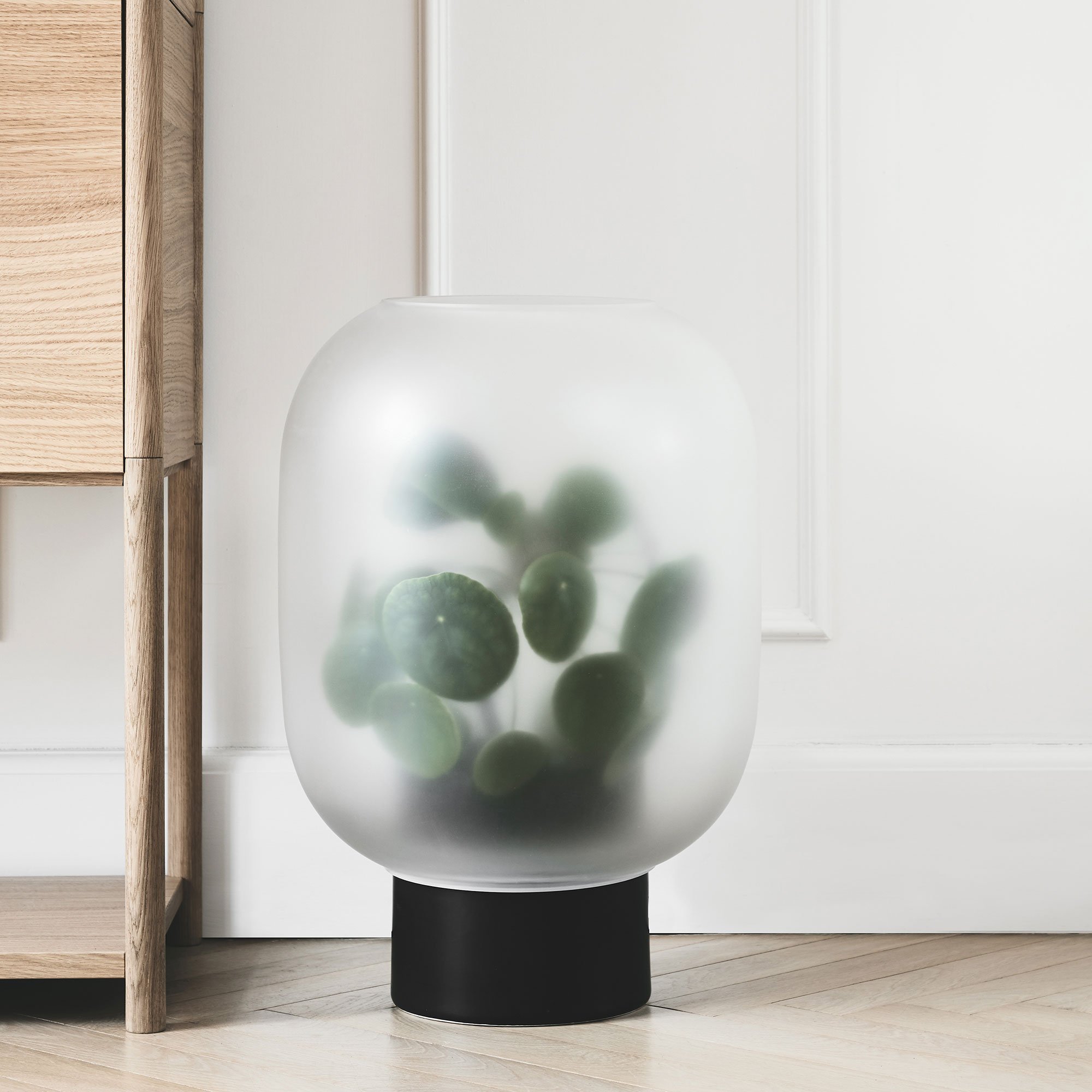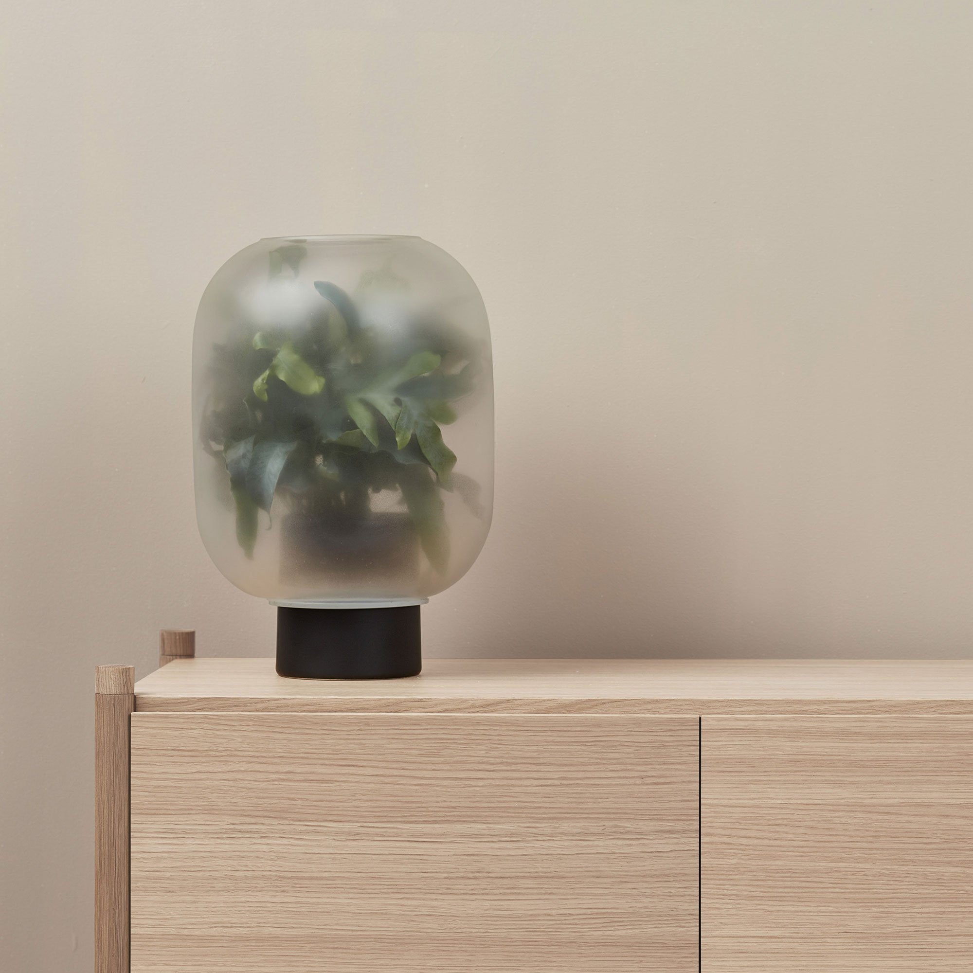 Thanks to the two openings of different sizes, the user can set the glass element lower or higher on the ceramic base, depending on their need. Placed inside the glass, plants make Nebl’s original concept come to life. The frosted glass makes the greenery look like it is enveloped in fog, bringing a sense of calm and peacefulness into living spaces. A perfect way to create a focal point in a room while enhancing the atmosphere. Nebl comes in two sizes as well as black and gray base options. Both floor and table planters are available online via Gejst. Photographs© Studio Rem.
