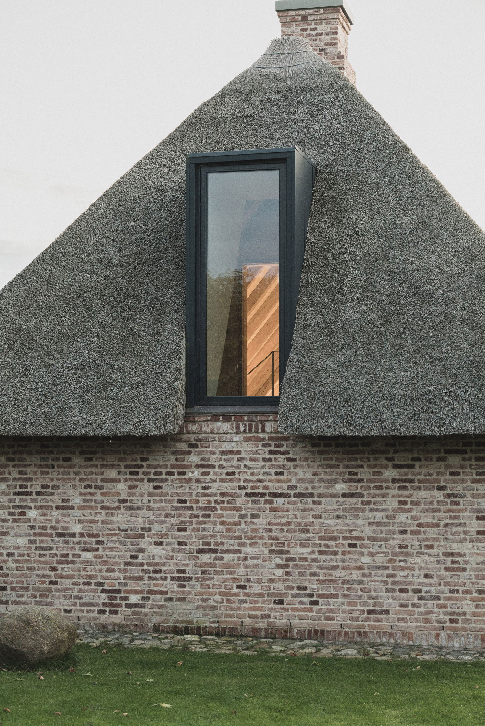 Located in northern Germany, Nieby Crofters Cottage has a venerable age of 120 years and a charming traditional design. Left in a dilapidated state, the brick house required extensive renovations. Architects Jan Henrik Jansen and Marshall Blecher collaborated to complete the restoration and redesign project for a young couple who want to use the cottage as a weekend retreat and a permanent home in the future. The team had to rebuild most of the building, but the architects carefully reconstructed original elements. For example, they removed the brick facade to install a new concrete foundation. Afterward, they rebuilt it and created new windows in the place of old openings. Too damaged to repair, the thatched roof was replaced. The new roof preserves the traditional character of the house. Apart from these renovations, the team also added a transparent extension at the back.