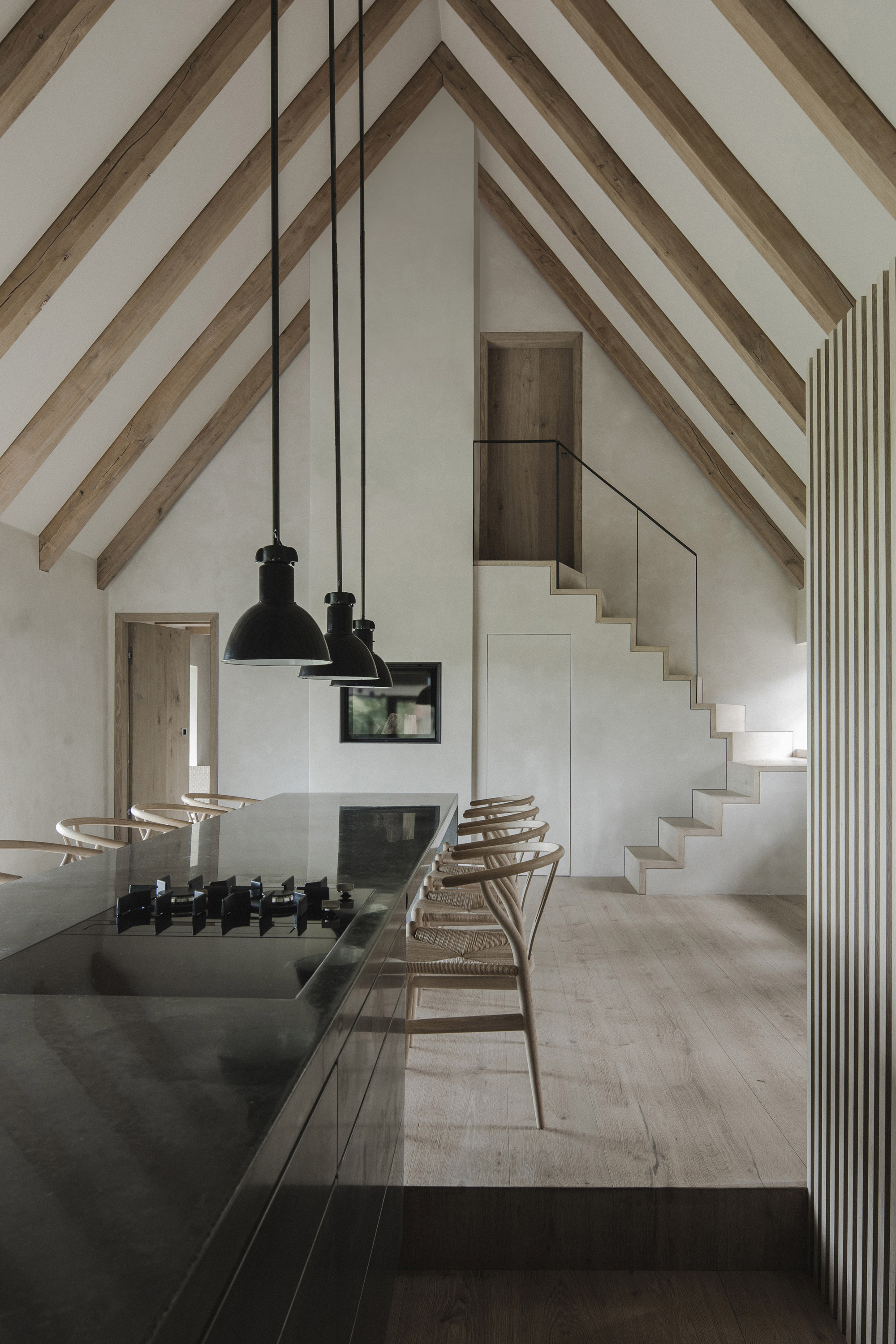 While the exterior has almost the same old rustic look, complete with brick walls and a thatched roof, the interiors are distinctly contemporary. However, the architects created an interior design that celebrates the building’s history and character. New double-height ceilings create airy and bright living spaces while exposed wood beams give a nod to the original cottage. The ground floor houses a kitchen and dining room, with a sunken living room placed in the new glazed volume.