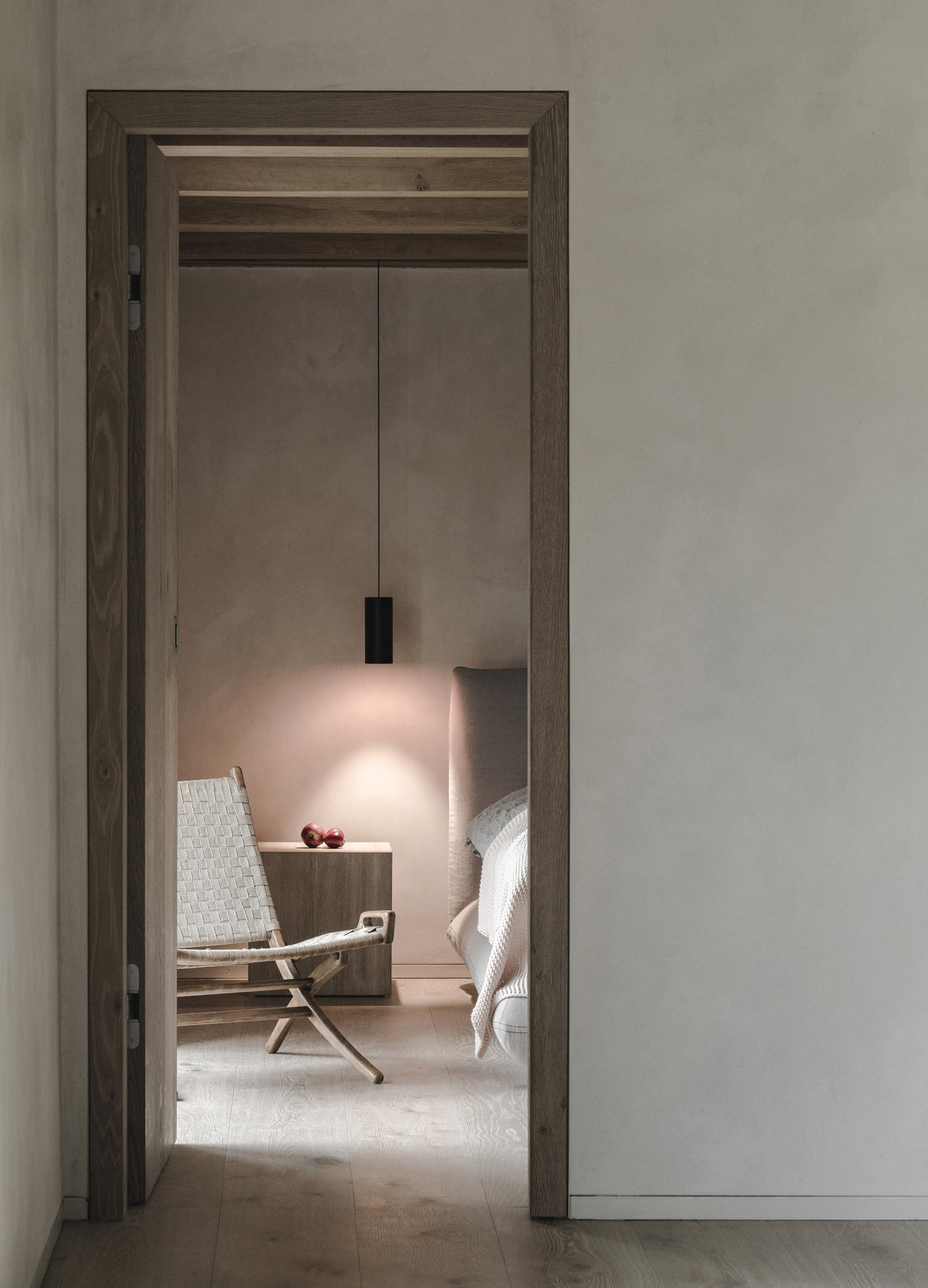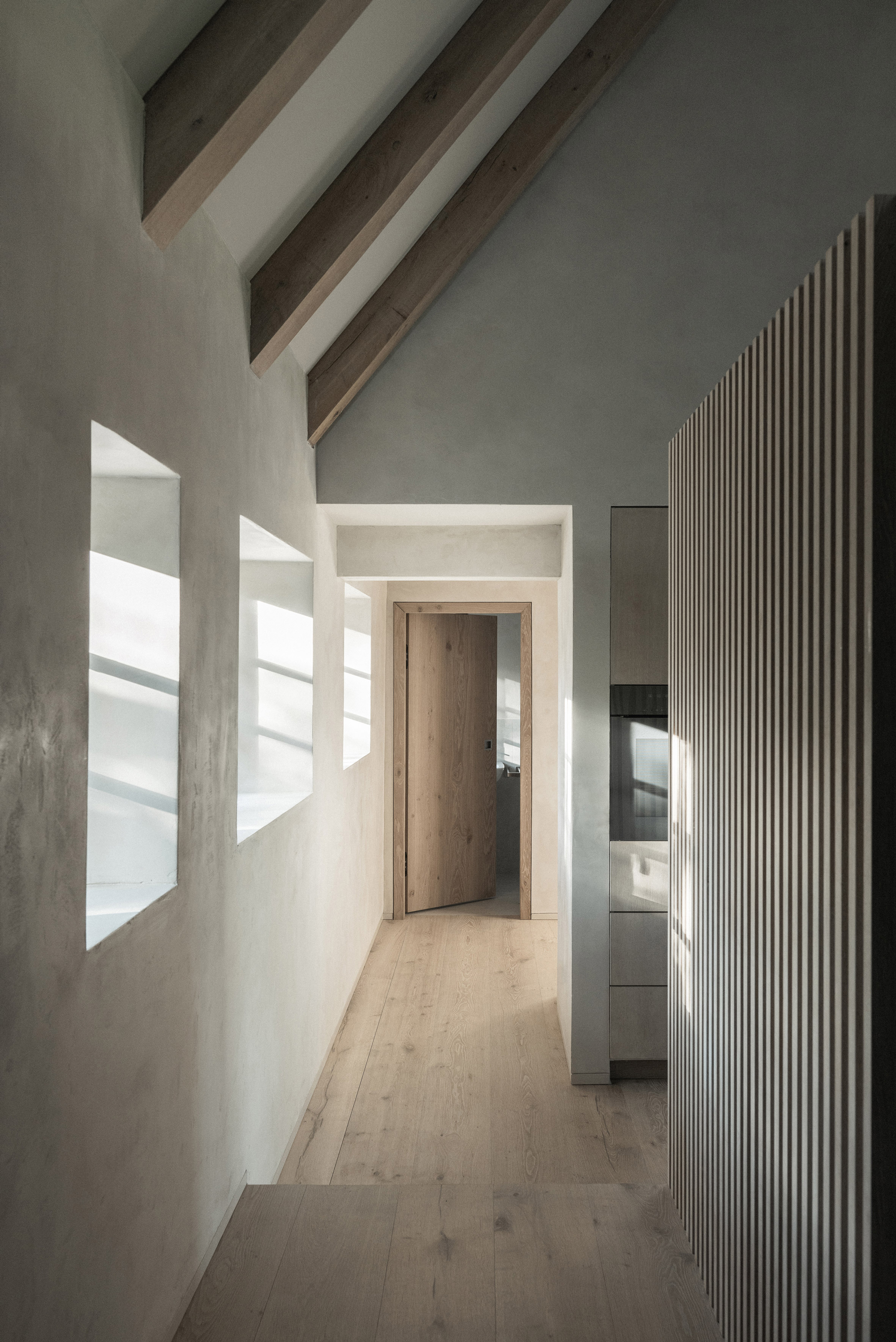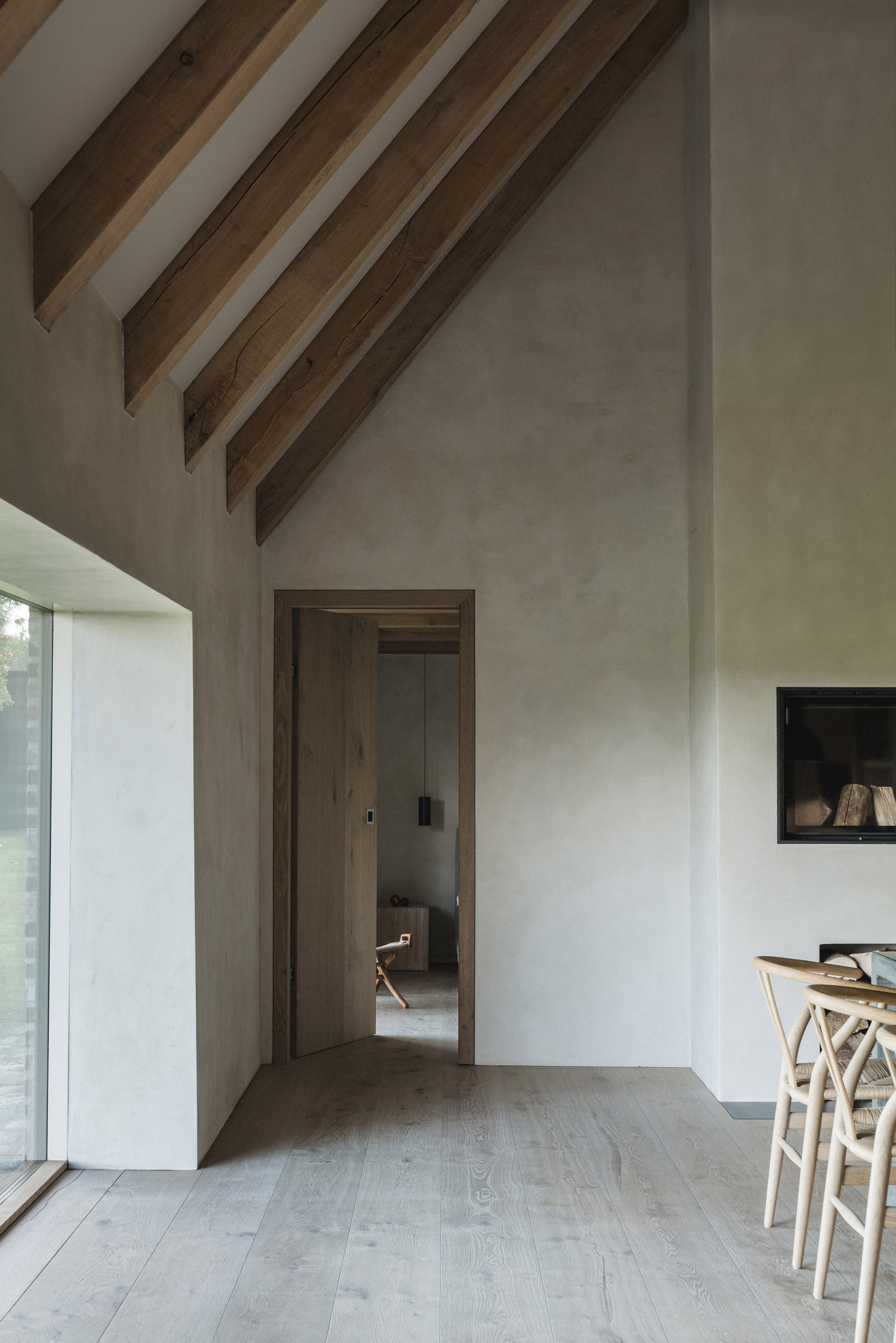 Featuring floor-to-ceiling glass walls, the extension immerses the residents in the landscape of the Geltinger Birk nature reserve and protected coastal area, visible in the distance. This area opens to a large terrace. A built-in daybed adds an eye-catching accent to the ground floor while providing a cozy space to relax and admire the surrounding nature. The house also has a bedroom on each floor, two bathrooms, and a service area. Architects Jan Henrik Jansen and Marshall Blecher used warm, natural materials for the interiors, including light oak and clay-based plaster. Photography © José Campos.