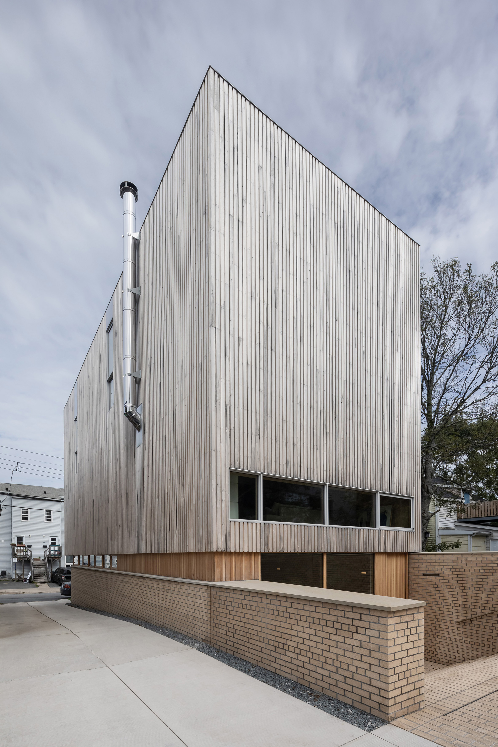 Located in a previously abandoned plot in the vibrant North End neighborhood of Halifax, Nova Scotia, OG House makes the most of the narrow site with a vertical design. Omar Gandhi, founder of Omar Gandhi Architect, completed the dwelling for his own family. Initially, the building was supposed to house the studio’s east coast office on the ground floor. As the architecture firm expanded quicker than expected, Gandhi redesigned the ground floor office as a smaller studio focused only on community projects in the area. The house features a brick base completed with locally sourced buff, a type of brick used in the area for residential projects and multi-unit housing. On top of the box-shaped ground level, a rectangular wood-clad volume rises vertically.