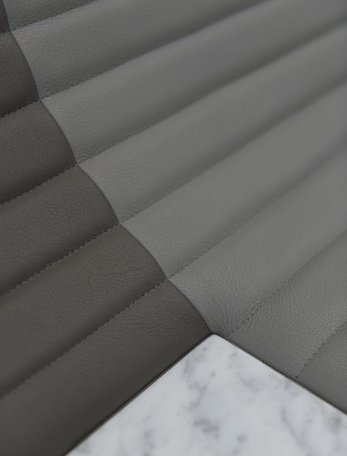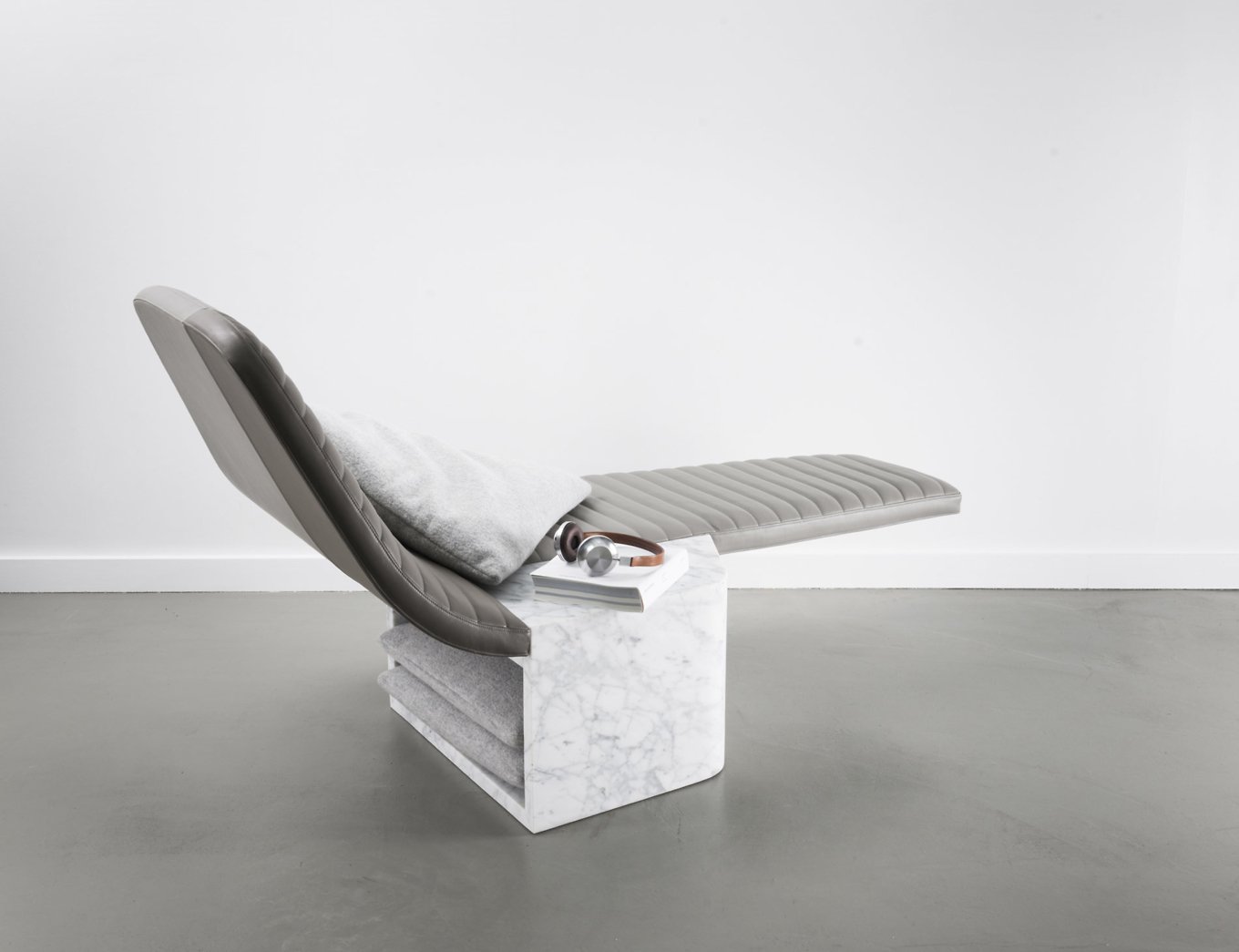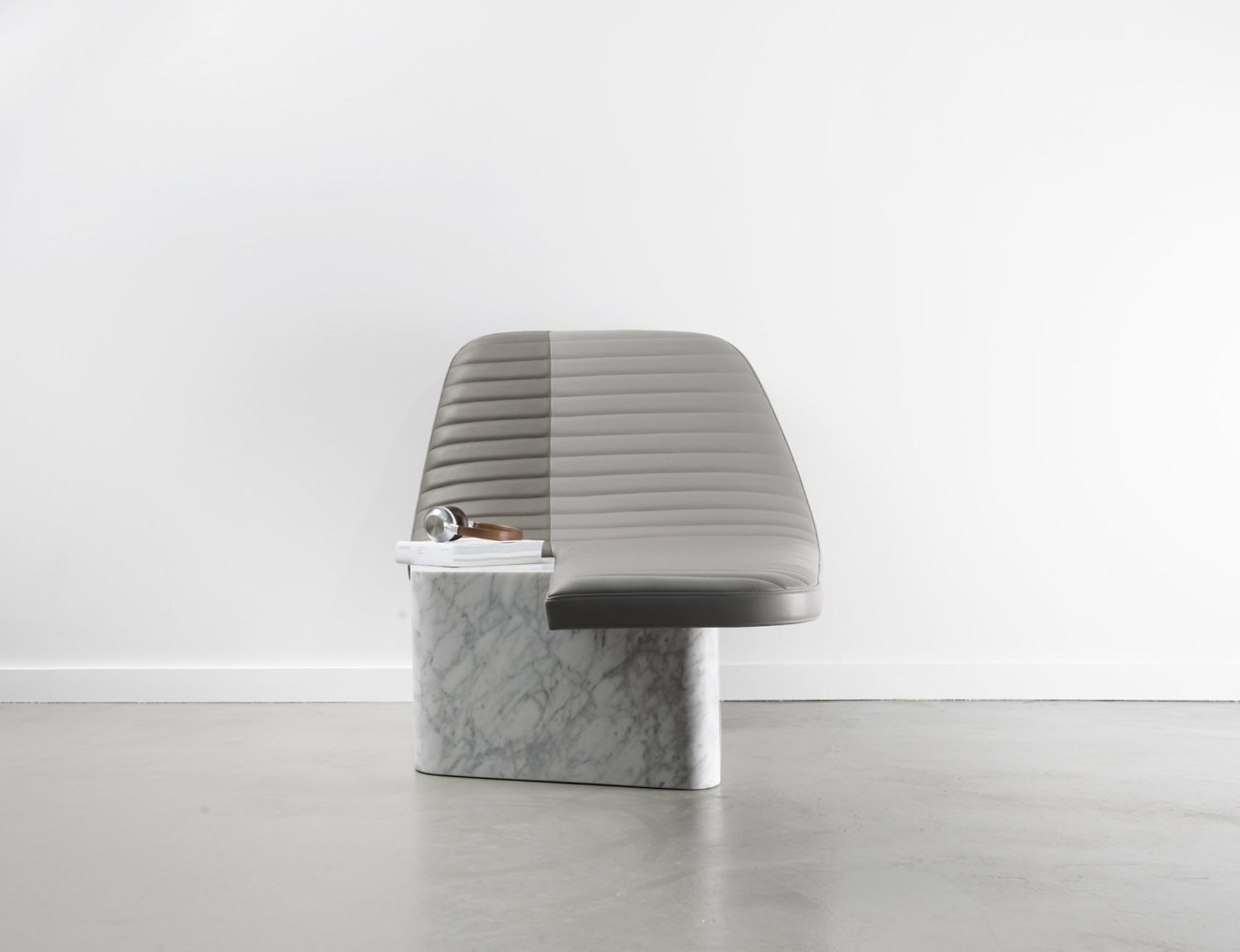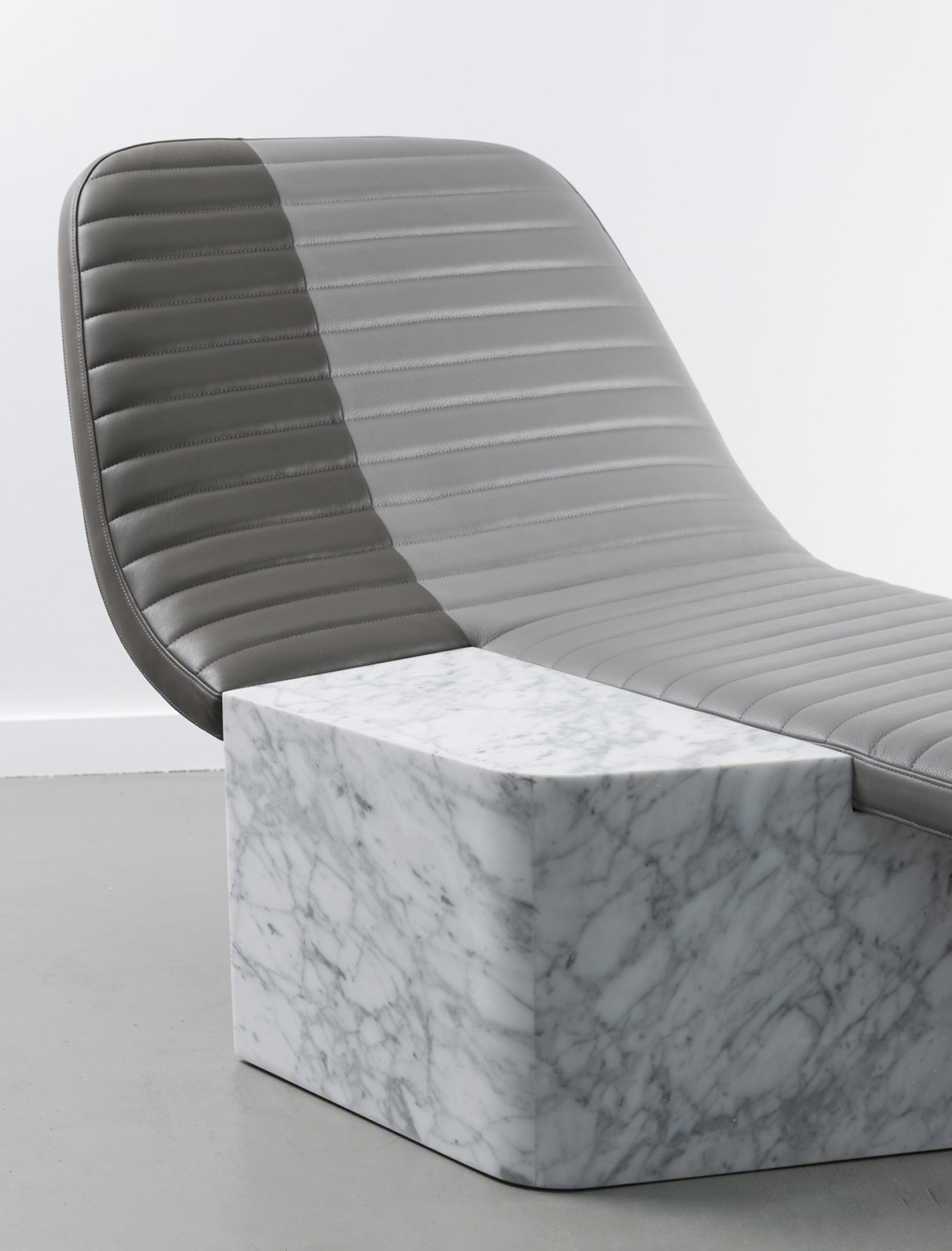 Made of two contrasting materials, Opper creates a play on balance, textures and lines. The leather seat has an elongated shape and graceful curves. Soft and comfortable, it also features a quilted pattern inspired by the motorcycle saddles of the 1970s. The Cararra marble base brings strength and weight to balance the lightness of the upper section while also adding natural charm. Contrary to its appearance, the marble base is not a solid block but hollow. It offers the perfect storage space for pillows or a blanket. Modern design and tradition, comfort and creativity, as well as function and elegance combine in distinctive chair that creates a focal point anywhere. Photography by Jérome Galland.