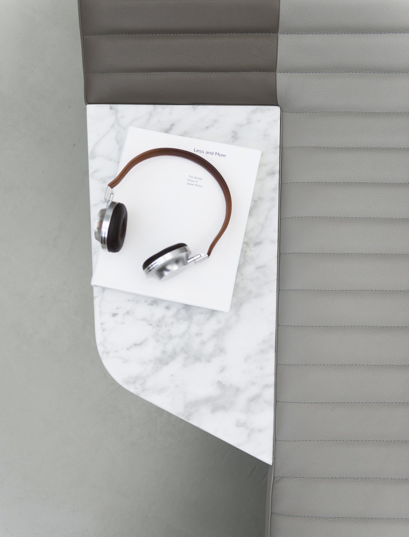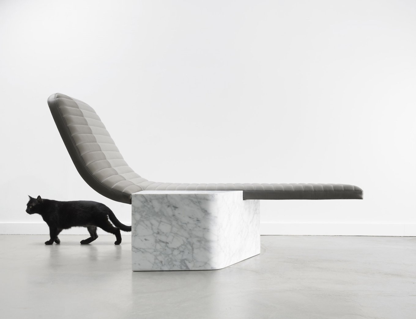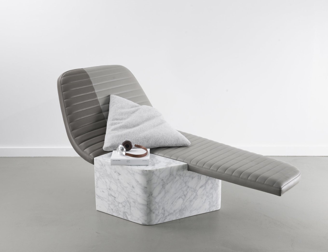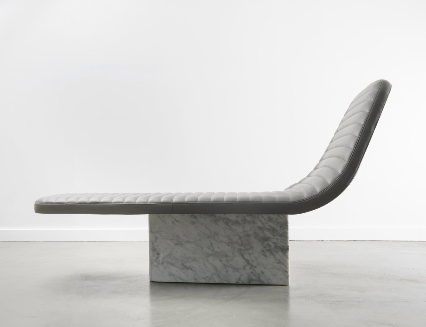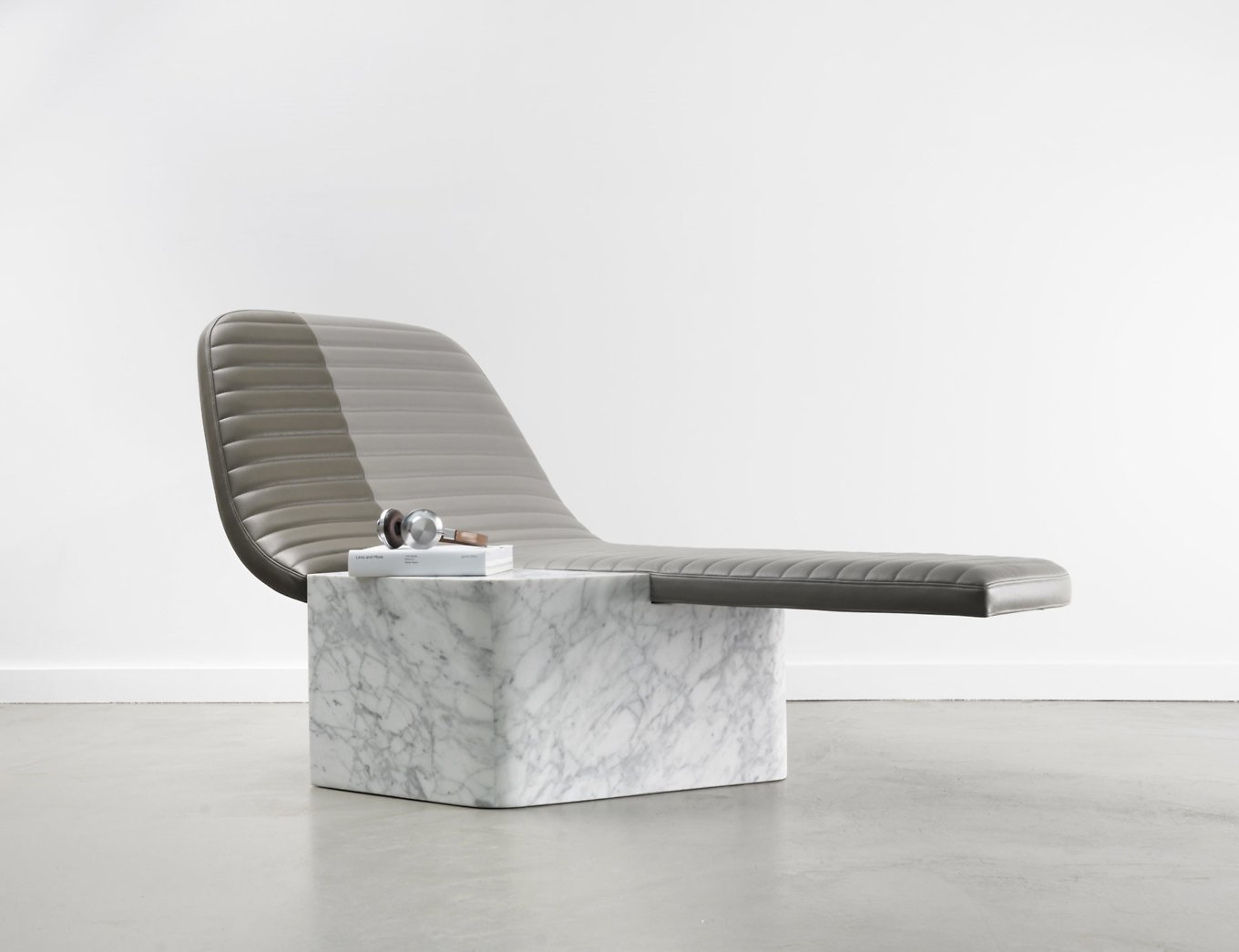 Made of two contrasting materials, Opper creates a play on balance, textures and lines. The leather seat has an elongated shape and graceful curves. Soft and comfortable, it also features a quilted pattern inspired by the motorcycle saddles of the 1970s. The Cararra marble base brings strength and weight to balance the lightness of the upper section while also adding natural charm. Contrary to its appearance, the marble base is not a solid block but hollow. It offers the perfect storage space for pillows or a blanket. Modern design and tradition, comfort and creativity, as well as function and elegance combine in distinctive chair that creates a focal point anywhere. Photography by Jérome Galland.