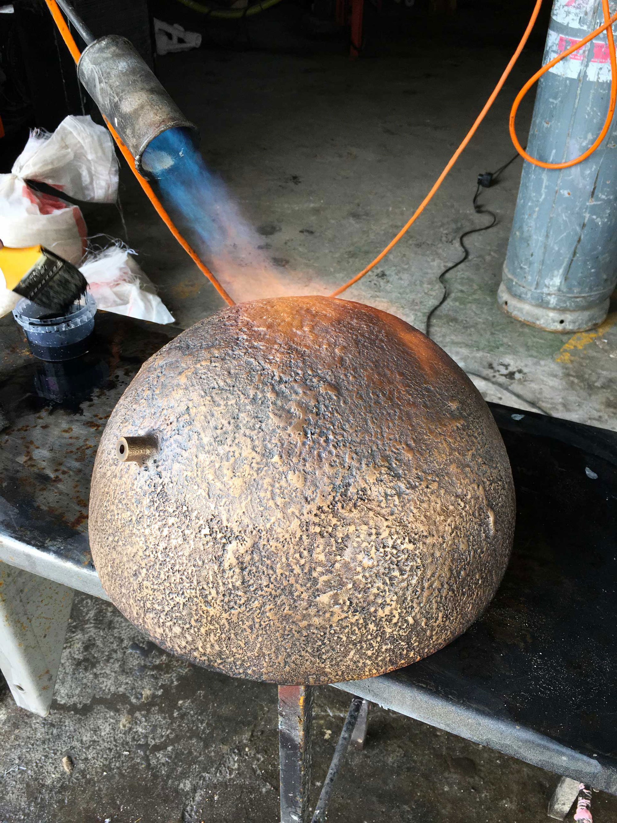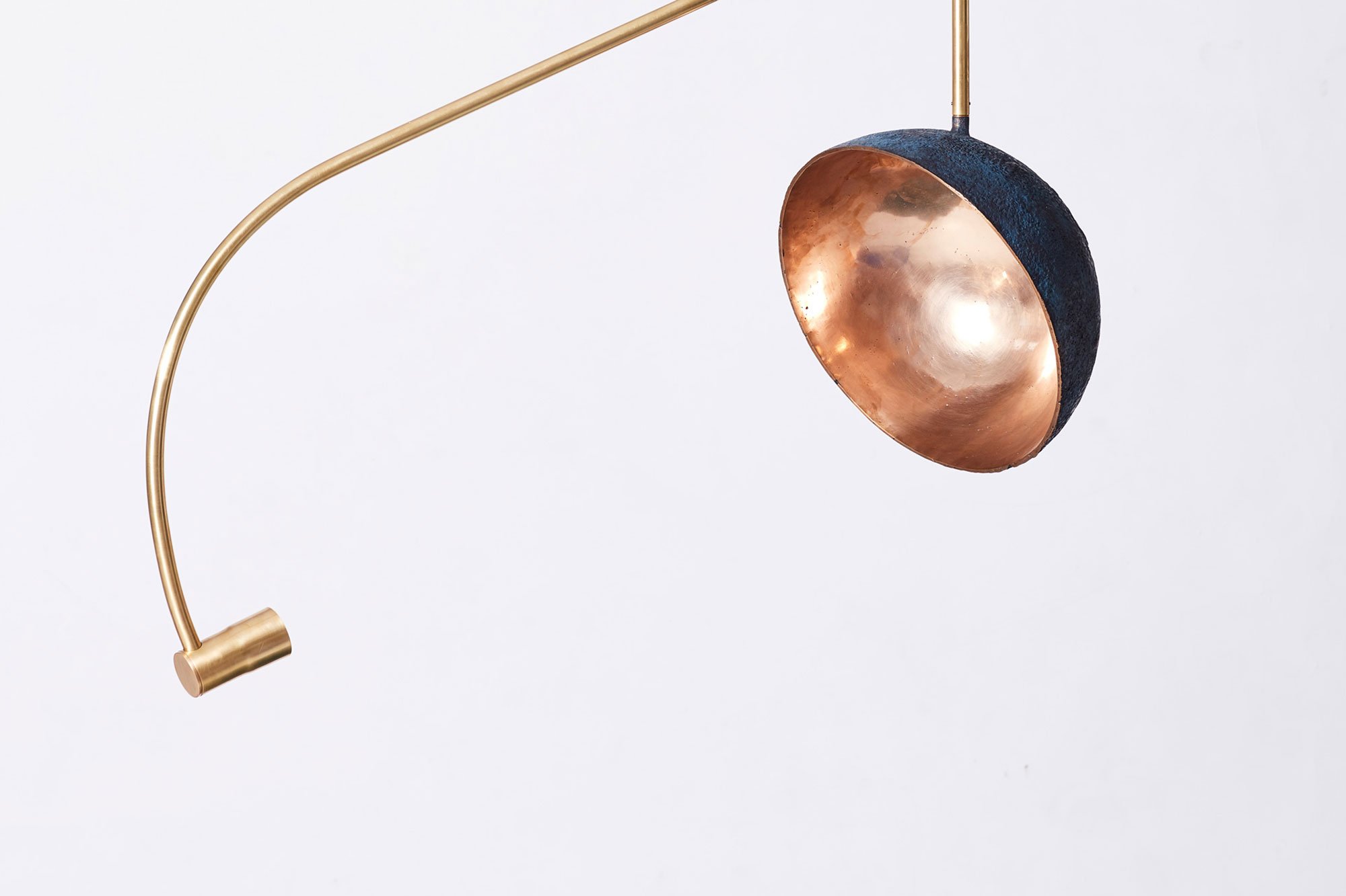 While the dome boasts a textured surface and a cool gray-blue color on the exterior, it features a polished gold finish on the interior. Depending on where the user focuses the light, Orbit reflects it back with a golden or a blueish hue. At the same time, the lamp creates changing shadows on the ceiling and walls with every movement. This set up doesn’t feature any wires, offering an easy way to orbit the two elements in a complete rotation. The Orbit light is exhibited at the Southern Guild gallery in Cape Town until September 12, 2018. Photographs© Hayden Phipps.